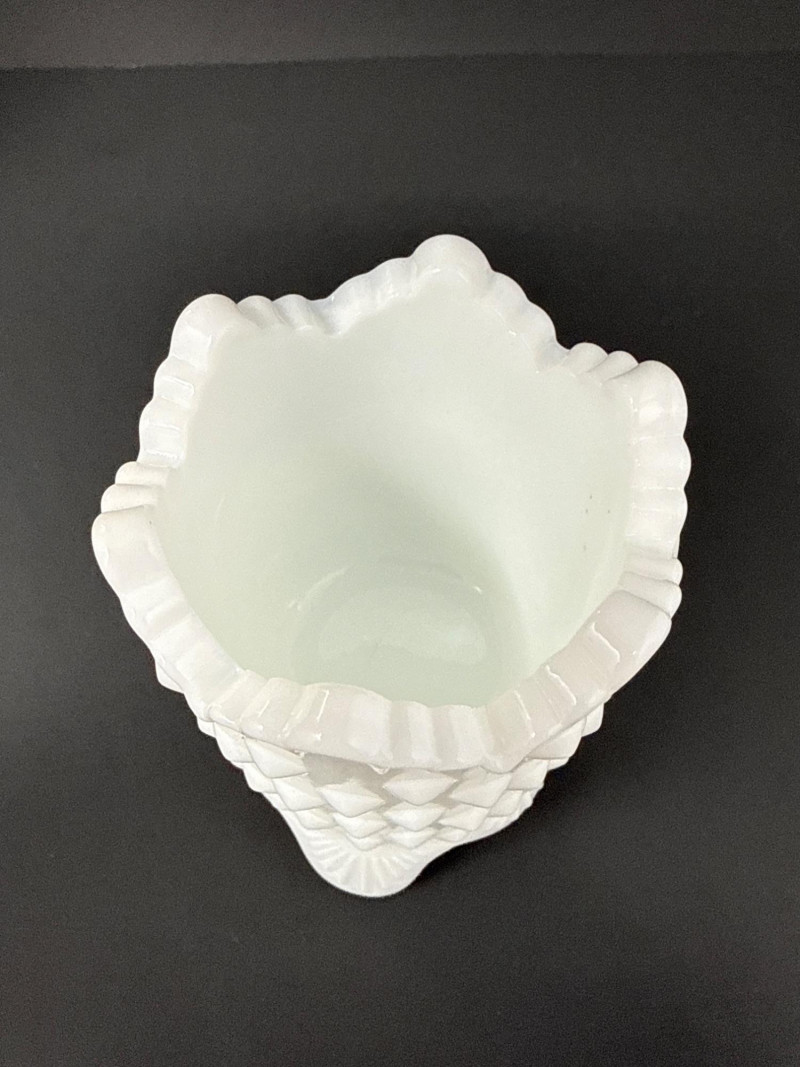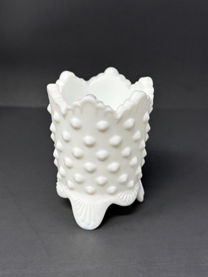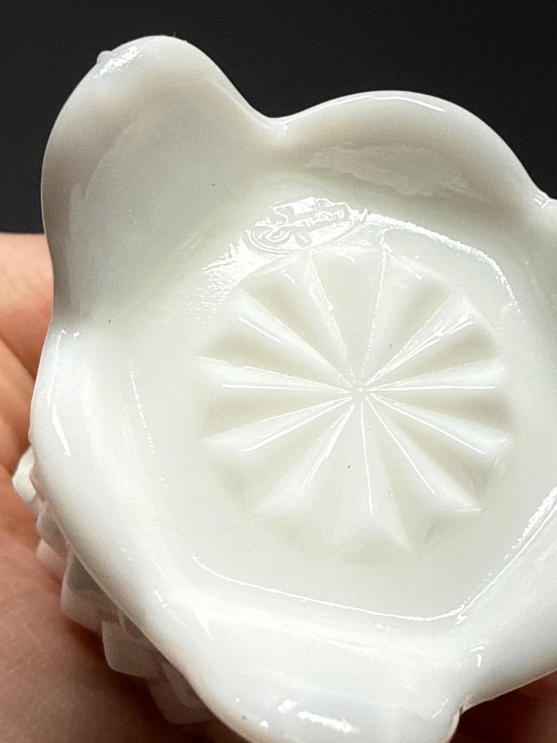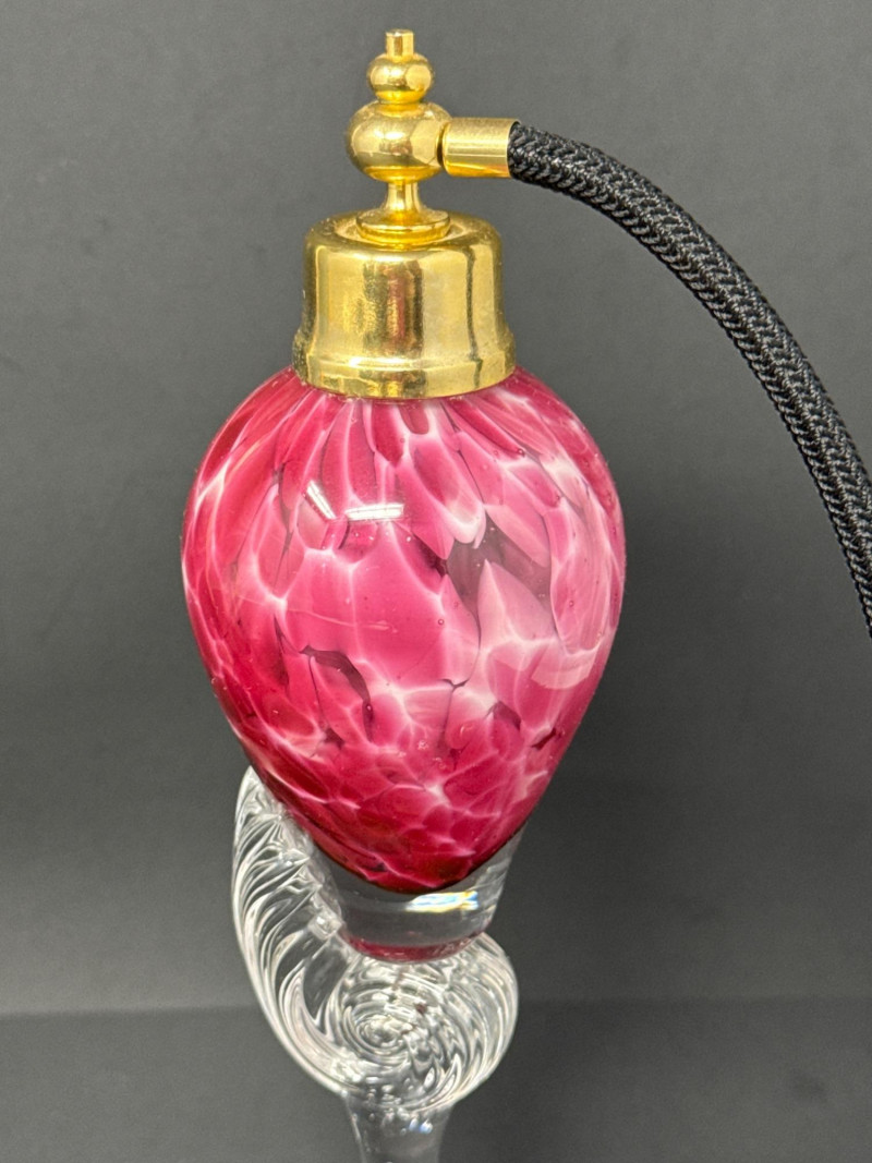 An elegant assortment of vintage vanity items, including luxury perfumes, fine English bone china, and decorative glass. Shalimar by Guerlain: Features a classic bottle of Shalimar Extrait de Parfum by Guerlain. Presented in its iconic purple velvet-lined presentation box with gold-tone accents. Perfume Spritzer: Includes a striking Fenton-style perfume spritzer with a pink hobnail or ruffled glass body and a vintage black bulb atomizer. Height: 8 1/4 inches. Minton Bone China: Features a small decorative plate or pin dish from Minton, the prestigious English bone china manufacturer. Diameter: 4 3/8 inches. Additional Accessories: Fenton Toothpick/Trinket Holder: A small white hobnail holder measuring 3 inches in height. Decorative Display Tray: A large 16” x 16” tray with gold toned edges Good used vintage condition.