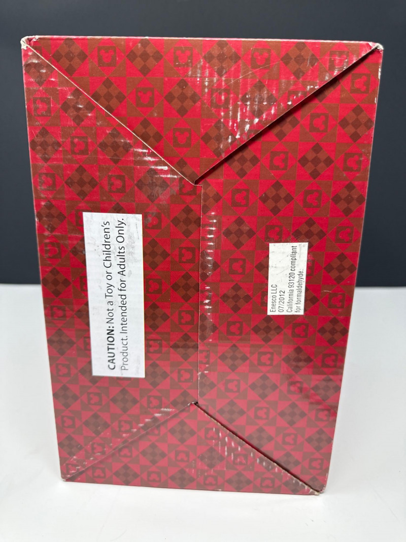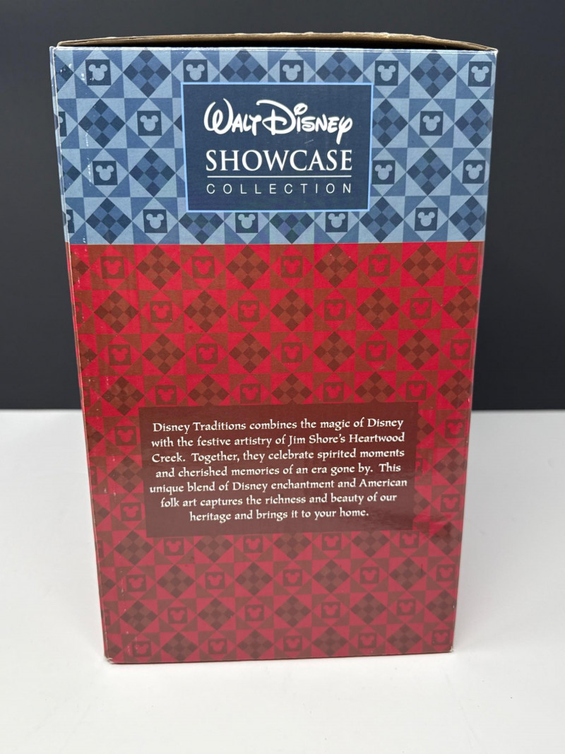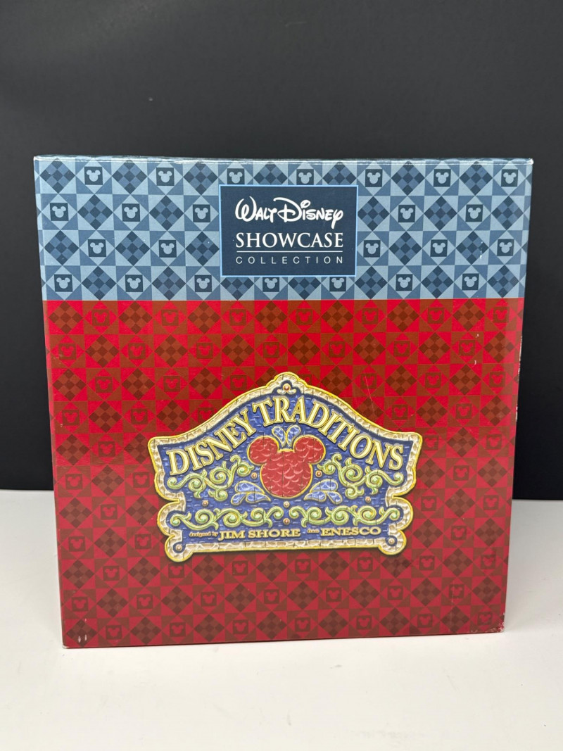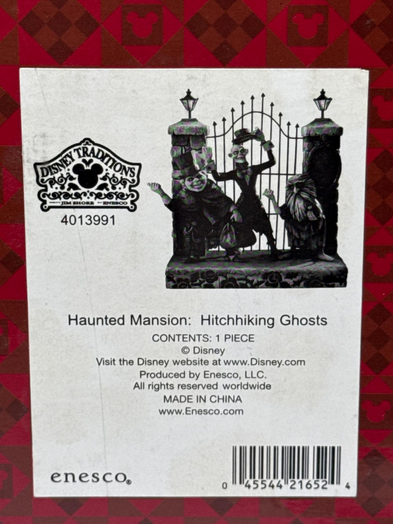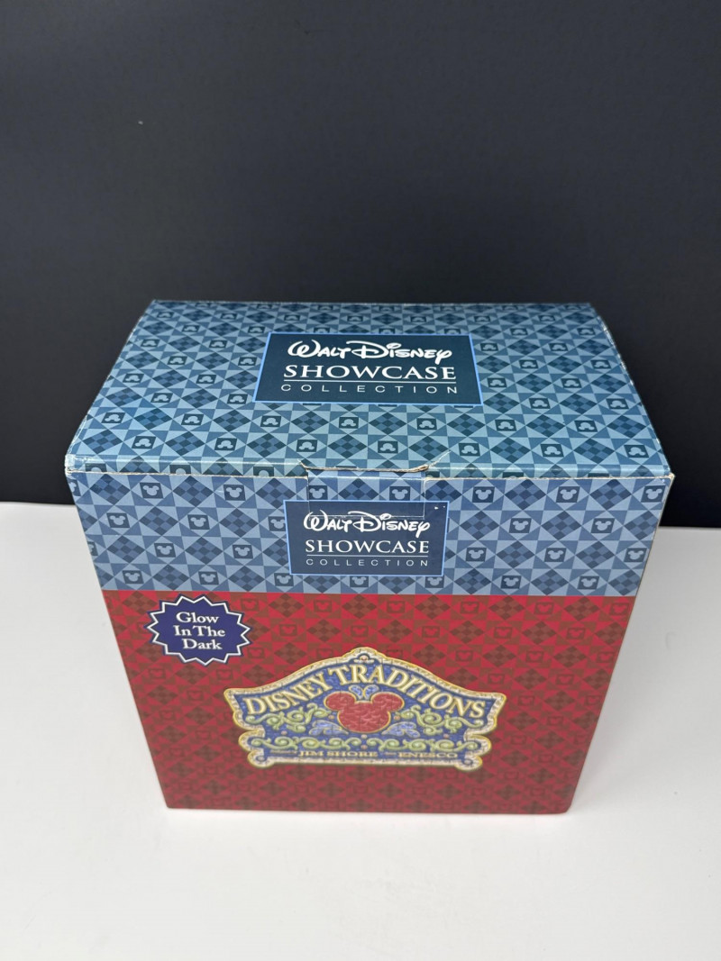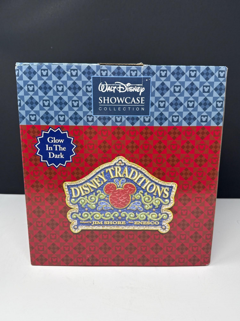 This lot features a "New in Box" (NIB) collectible figurine from the Disney Traditions line, produced by Enesco. Subject: The piece depicts the iconic Hitchhiking Ghosts from Disney's "The Haunted Mansion" attraction, posed in front of the ornate mansion gates. Special Feature: This specific version is a Glow-in-the-Dark edition, adding a spooky, thematic effect when displayed in low light. Brand & Collection: * Part of the Disney Traditions collection designed by artist Jim Shore. Also associated with the Walt Disney Showcase Collection.