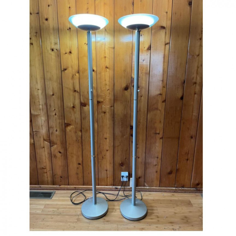 Pair of post‑modern floor lamps featuring a clean, minimalist silhouette with upward‑facing bowl shades and slim column bases. Both lamps are dimmable, offering adjustable ambient lighting suitable for living rooms, offices, or contemporary interiors. Features: Post‑modern design with upward‑facing bowl shades Slim metal columns with round bases Dimmable light control Matching pair Condition: