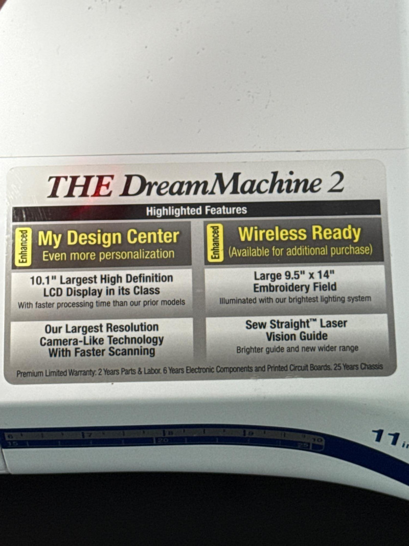 Brother Dream Machine 2 Innov-ís XV8550D - Quilting Sewing Embroidery Brother Dream Machine Innov-is XV8550D, is the latest Brother sewing and embroidery machine that has all the #1 rated features if its predecessor, The Dream Machine Innov-is XV8500D plus, even more possibilities than ever before. With more built-in designs, more fonts, more monograms, greater options for design creation, (even without the need of a computer). Also, the Brother Dream Machine Innov-is XV8550D has the greatest advancement in embroidery placement technology. The Dream Machine Innov-is XV8500D now comes equipped with Innov-eye™ 2 camera technology. With this amazing embroidery placement feature, embroidery placement is now done effortlessly and perfect every time. It uses a camera to perfectly align your design, even if you do not hoop it straight. This is a must for the embroidery enthusiasts and novice alike. Brother Dream Machine Innov-is XV8550D will even guide your sewing with Innov-eye™ 2 camera technology. It corrects your seam allowance as you go. You must see this machine to believe. The future of sewing, embroidery and quilting & crafting is here and now! More information on the machine features found here. Model Number- XV8550D Serial Number- U64624-H6B112367 No maintenance records present. Hasn't been used since 2020. Winner bidder is suggested to take machine in for servicing. Machine turns on, sounds works great. The sewing mechanism is untested by Sound Estate. Overall Machine is in great condition. Embroidery attachment and hoops are included as shown in the photos. Beautiful machine!Brother Dream Machine 2 Innov-ís XV8550D General Features