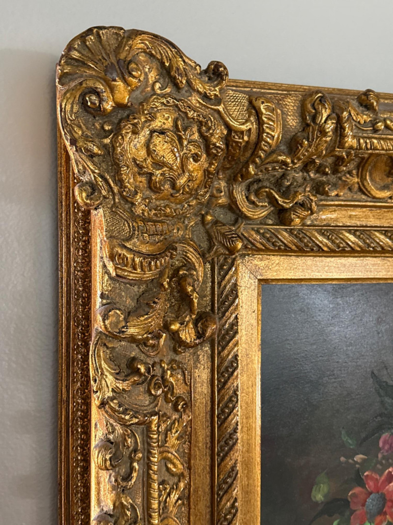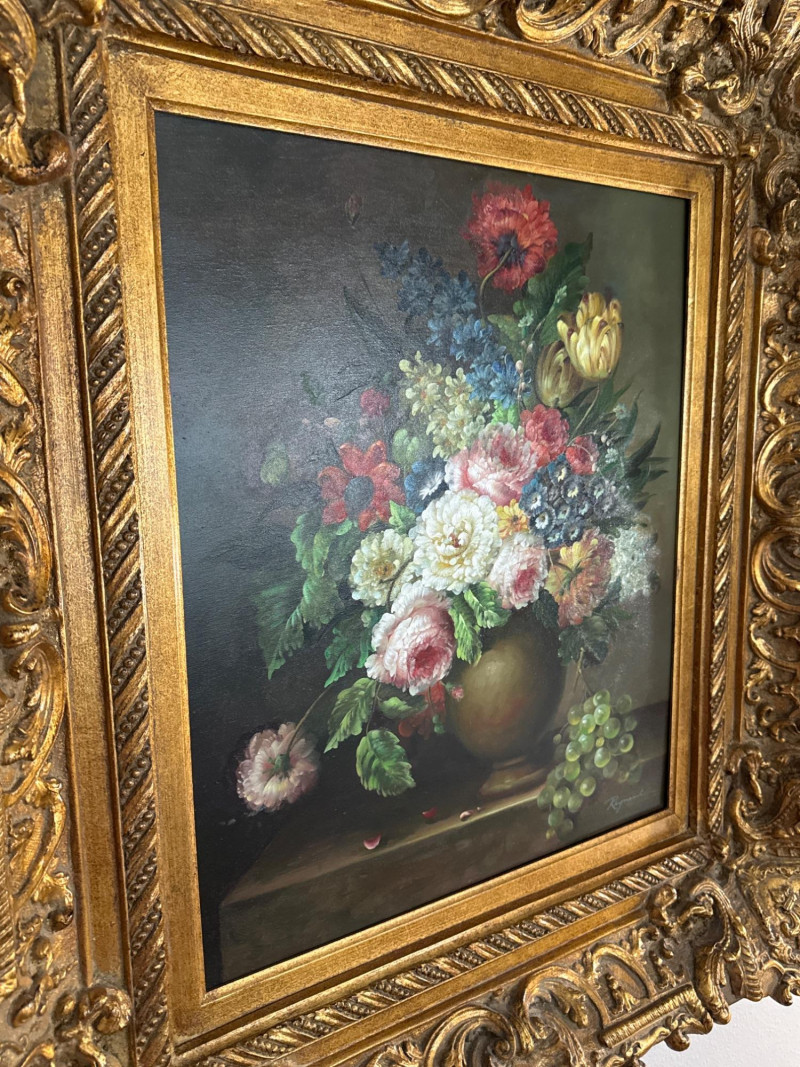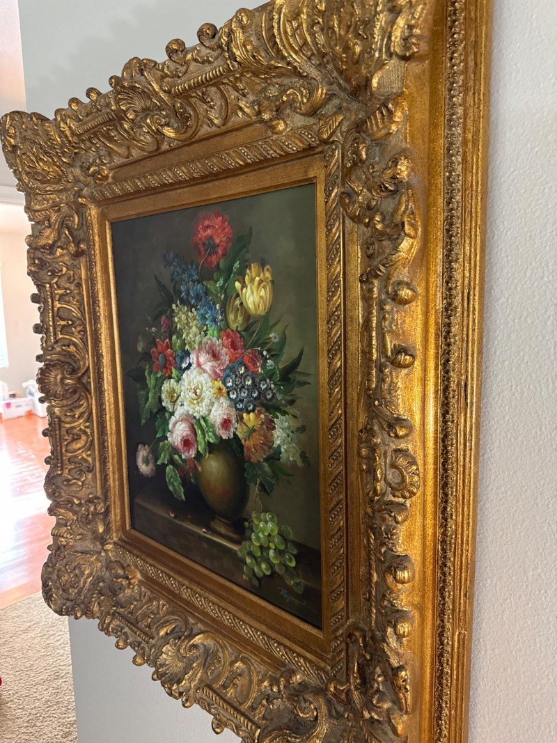 Large Floral Oil Painting Dutch Style in Gilt Frame *signed Raymond This frame is large and ornate! Measurements are approximate.