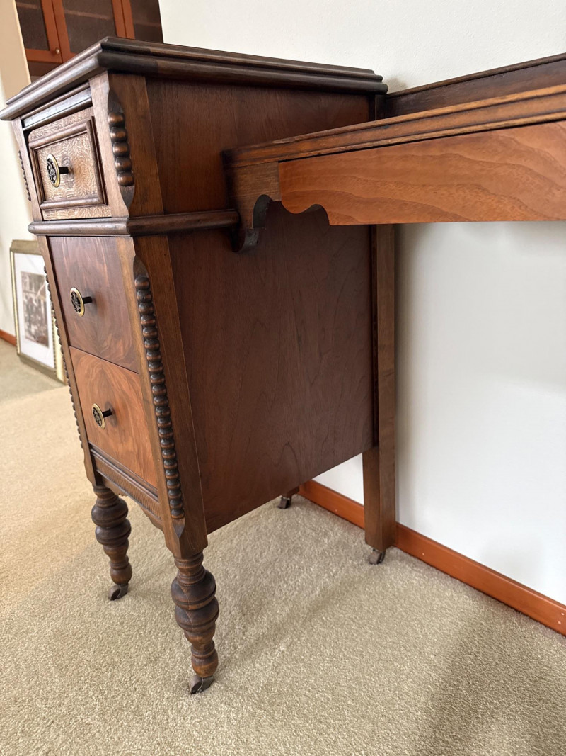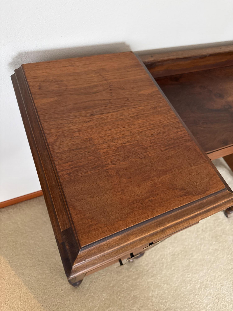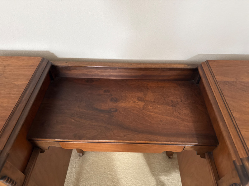 Suitable for use as a writing desk, vanity, or entry console. Warm, dark finish