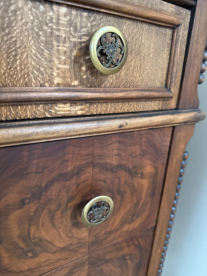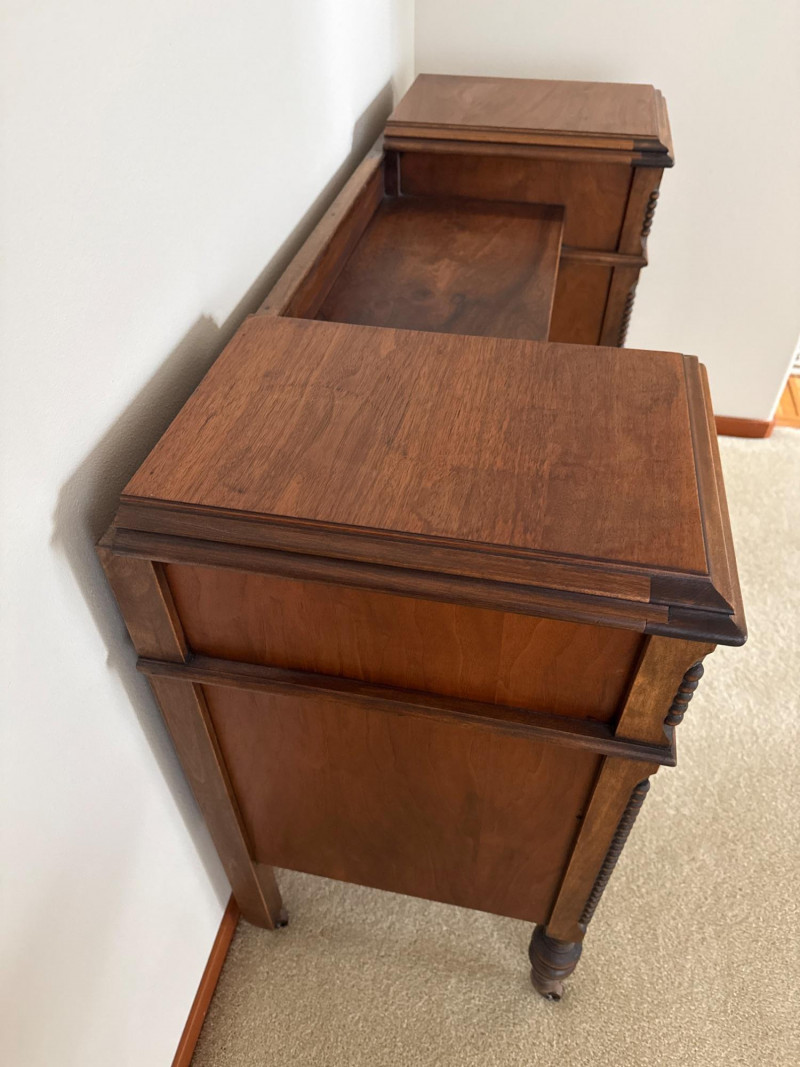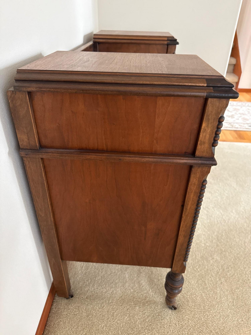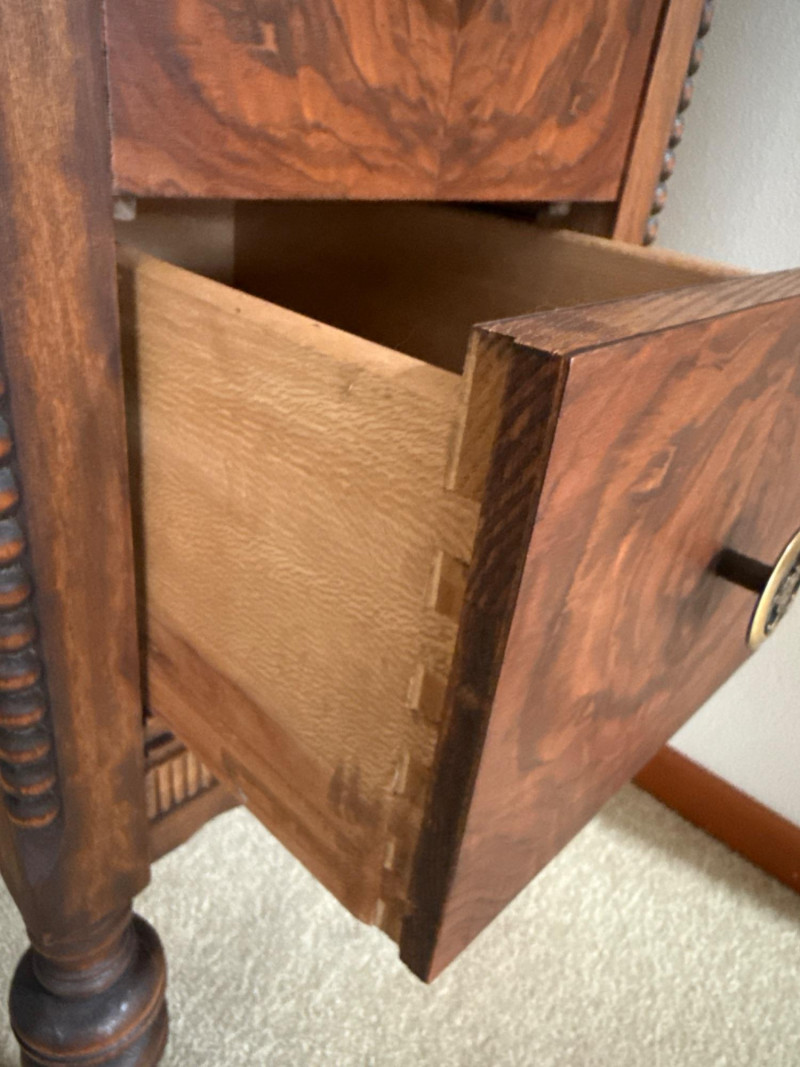 Each side has three drawers, all with round brass pulls (not sure if knobs are original to this piece) in a classic style. Solid wood construction