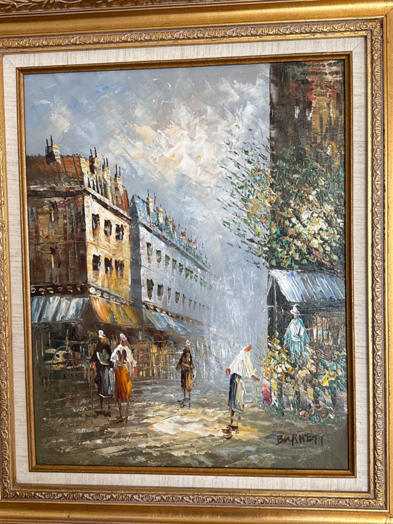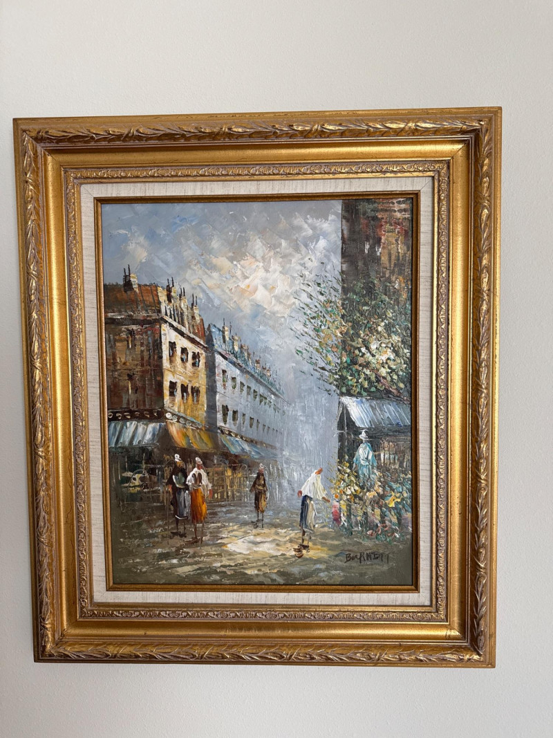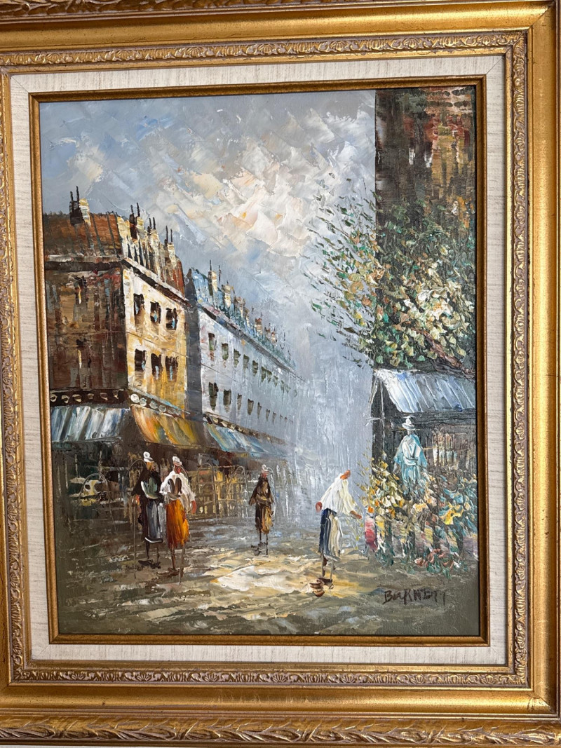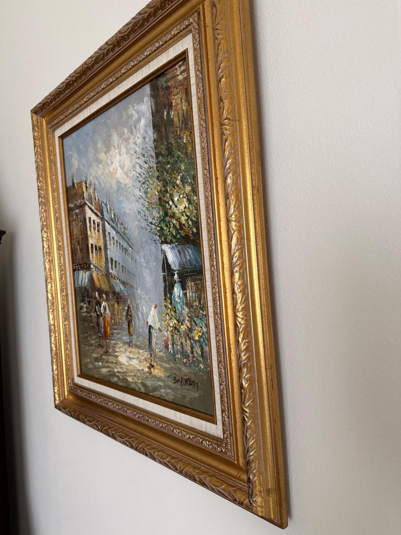 This is a classic Caroline Burnett Paris street‑scene painting, done in her signature impressionistic style. The composition includes: Bustling Parisian street life with figures walking, shopping, and interacting Flower vendor on the right, with bright, textured blooms Tall European buildings with warm façades and sloped roofs A moody, clouded sky that adds atmosphere and depth Burnett’s characteristic loose, lively brushwork and warm palette A richly detailed ornate gold frame that enhances the traditional European aesthetic Signed “Caroline Burnett” in the lower right Caroline Burnett was a mid‑20th‑century American painter who lived and worked in Paris. She became known for: Paris street scenes Flower markets Cafés and boulevards Impressionistic, decorative style Her works were widely sold through galleries and décor shops, especially in the 1950s–1970s. They remain popular in estate sales because they’re warm, approachable, and instantly recognizable.Artist Background