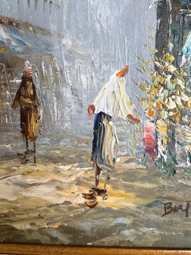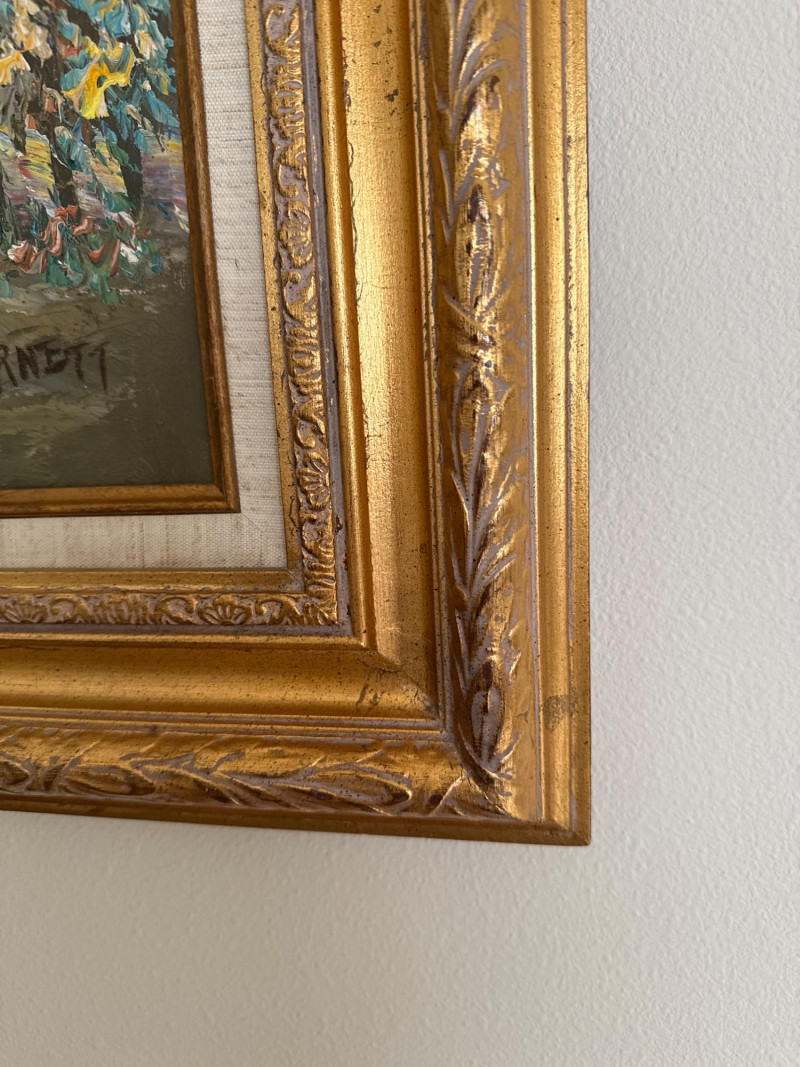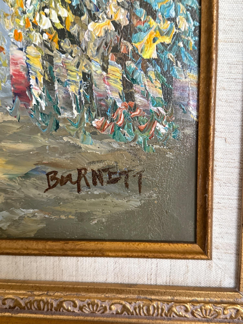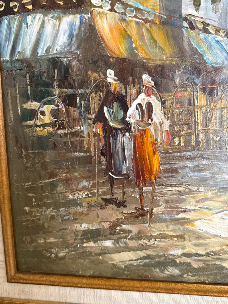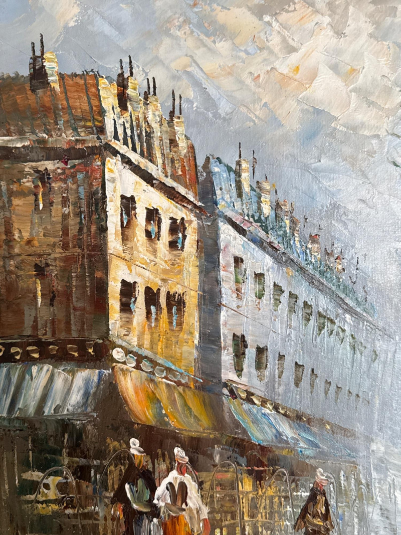 This is a classic Caroline Burnett Paris street‑scene painting, done in her signature impressionistic style. The composition includes: Bustling Parisian street life with figures walking, shopping, and interacting Flower vendor on the right, with bright, textured blooms Tall European buildings with warm façades and sloped roofs A moody, clouded sky that adds atmosphere and depth Burnett’s characteristic loose, lively brushwork and warm palette A richly detailed ornate gold frame that enhances the traditional European aesthetic Signed “Caroline Burnett” in the lower right Caroline Burnett was a mid‑20th‑century American painter who lived and worked in Paris. She became known for: Paris street scenes Flower markets Cafés and boulevards Impressionistic, decorative style Her works were widely sold through galleries and décor shops, especially in the 1950s–1970s. They remain popular in estate sales because they’re warm, approachable, and instantly recognizable.Artist Background