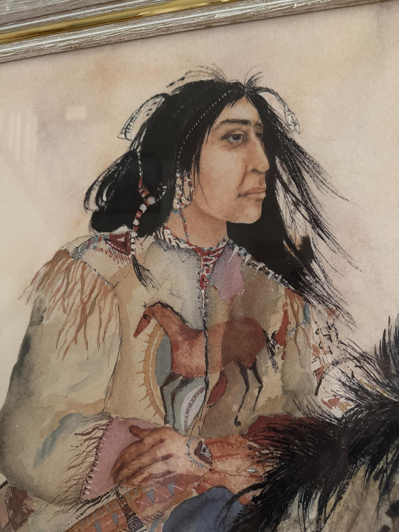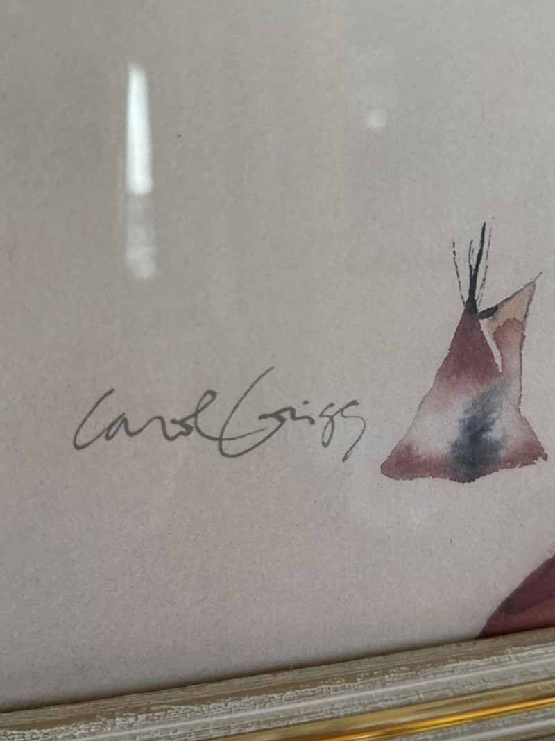 A framed Carol Grigg art print featuring her signature Native‑inspired figurative style. The artwork is presented behind glass in a wood frame with matting, ready for display. Classic soft‑toned palette and flowing form typical of Grigg’s work.