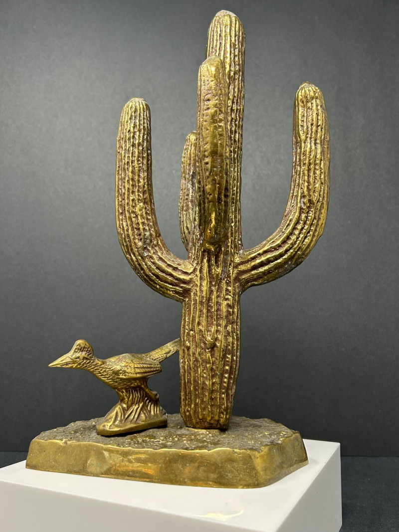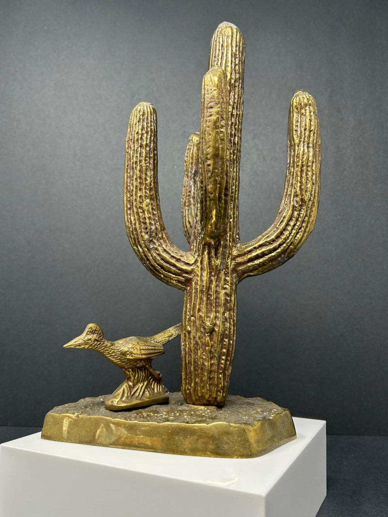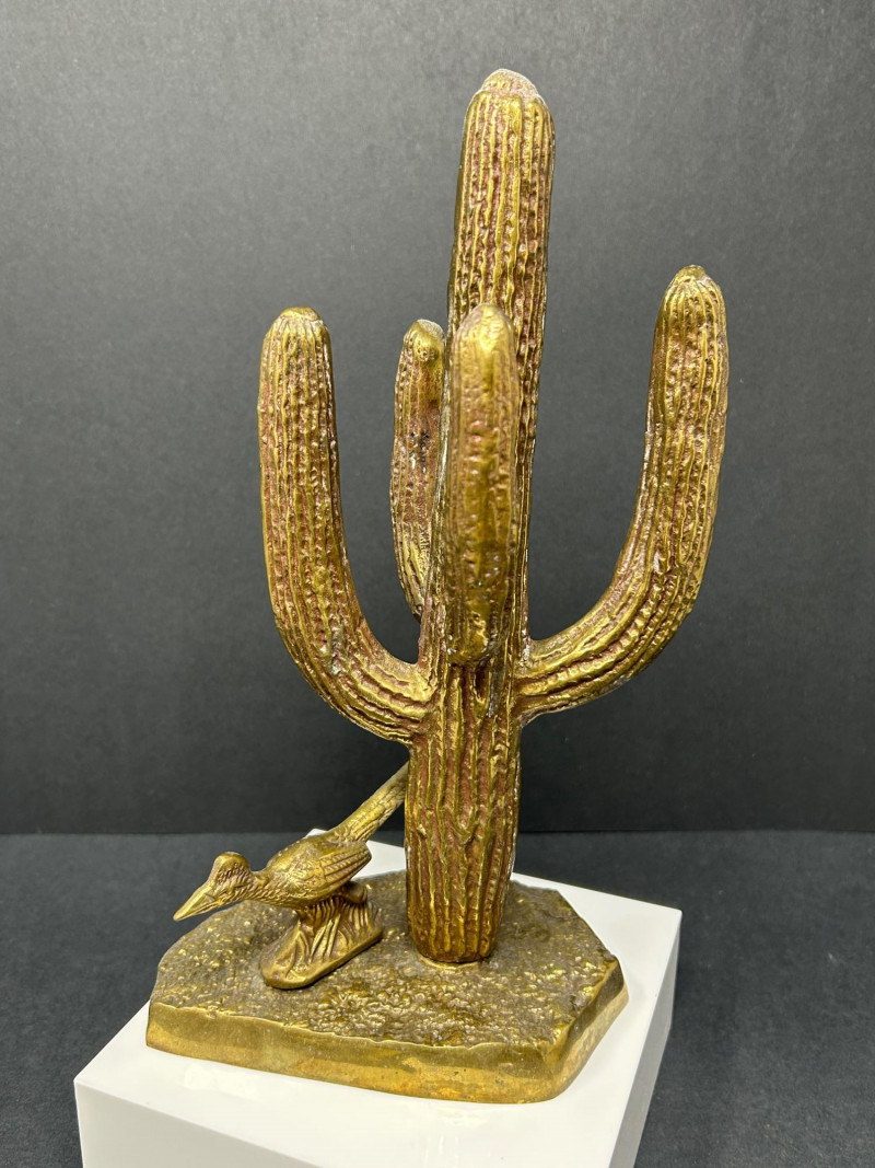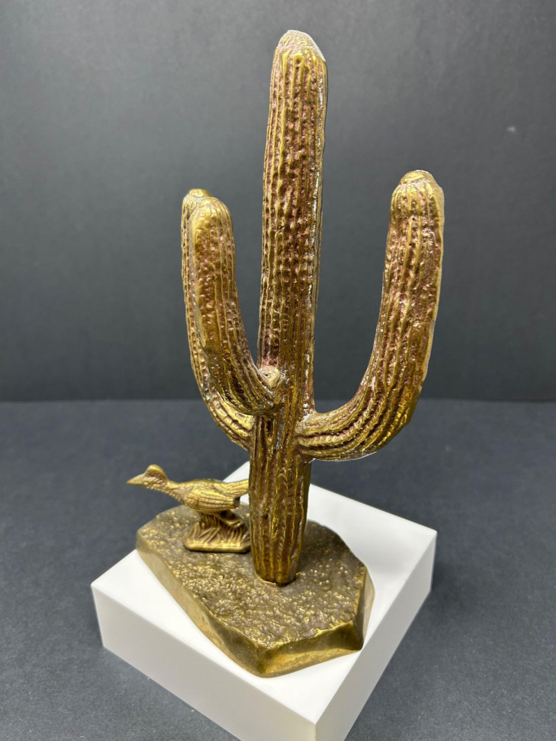 A charming brass sculpture featuring a textured saguaro cactus with multiple arms and a roadrunner poised at its base. Nicely detailed and mounted on a rectangular base, this piece brings classic Southwestern character to any display. 11” tall base 4” x 6”