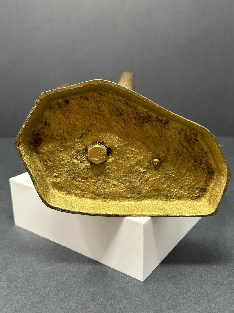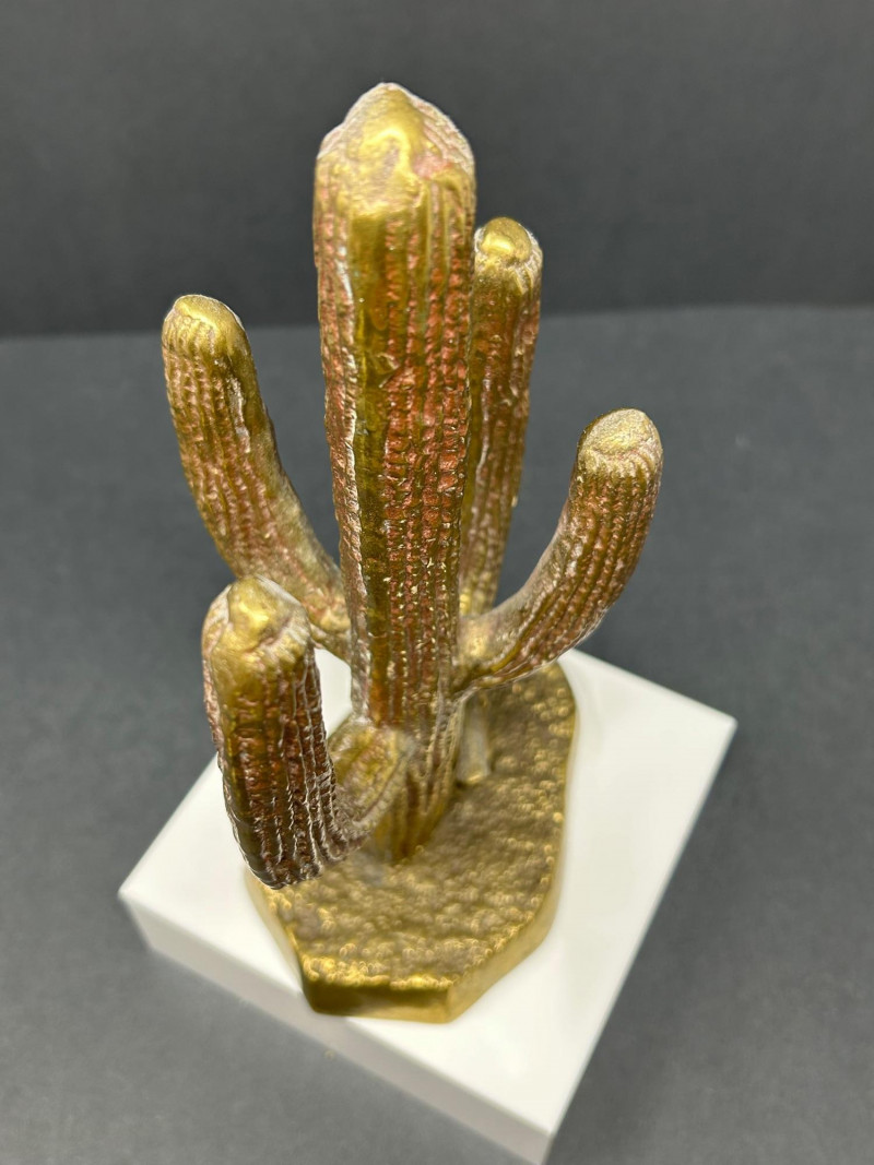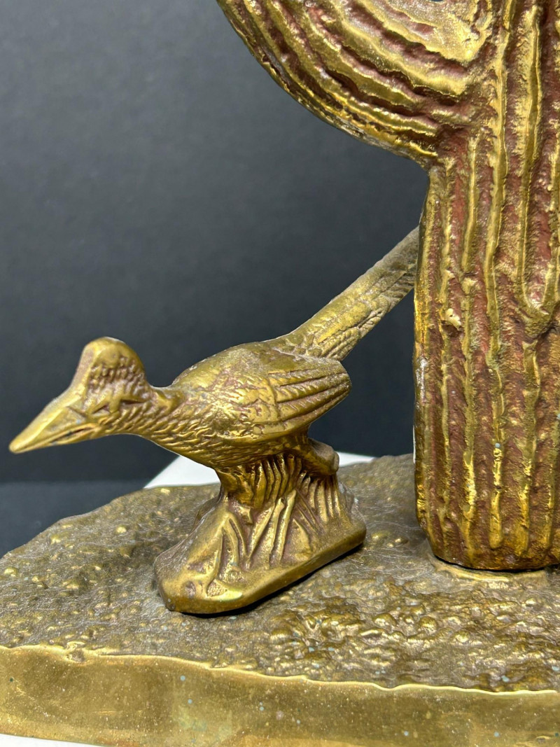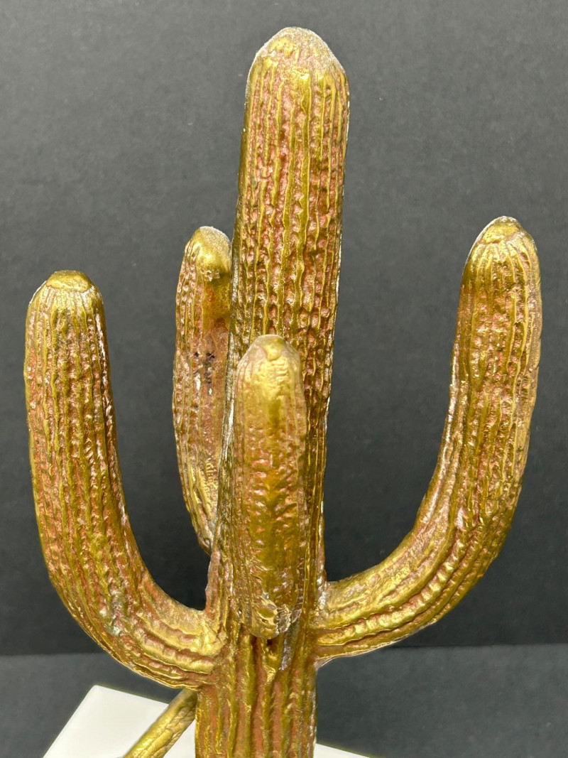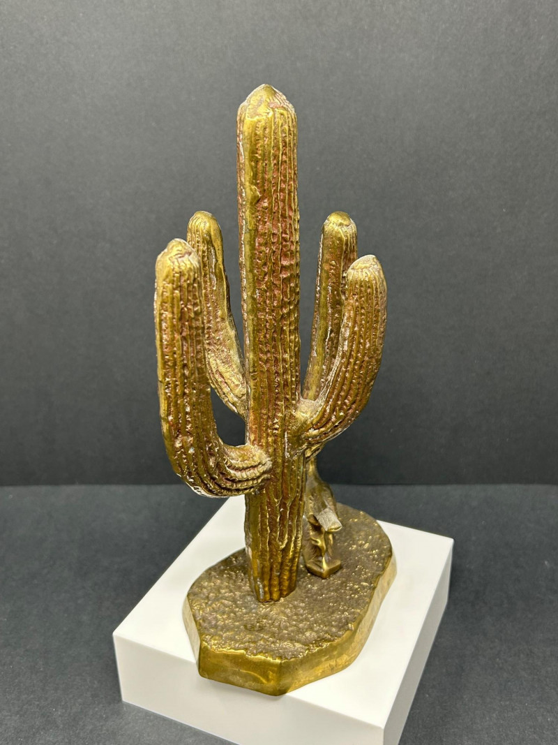A charming brass sculpture featuring a textured saguaro cactus with multiple arms and a roadrunner poised at its base. Nicely detailed and mounted on a rectangular base, this piece brings classic Southwestern character to any display. 11” tall base 4” x 6”