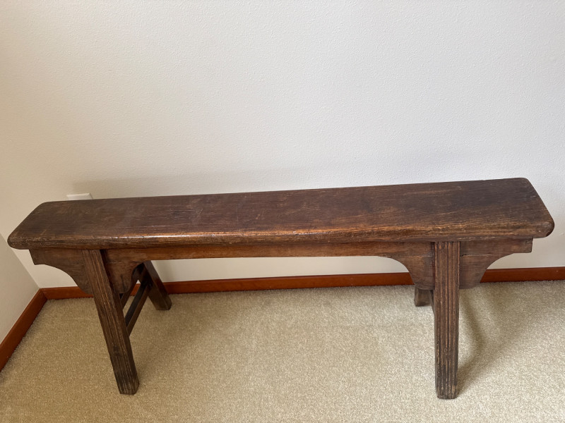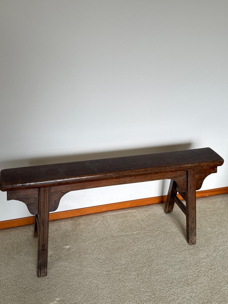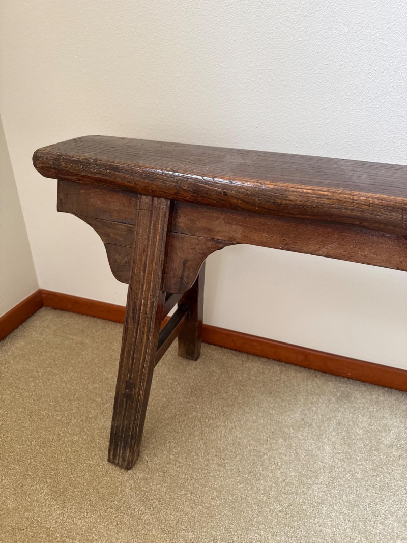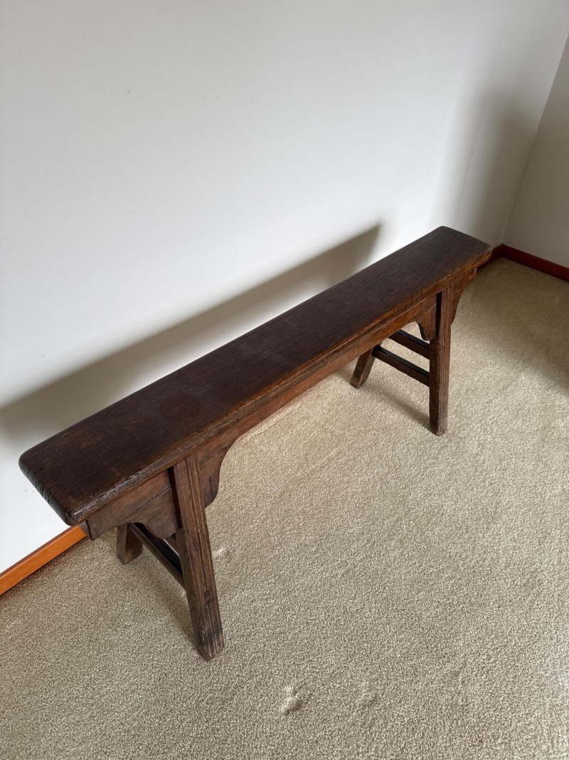 A simple, early-style wooden bench with a long narrow seat and cut‑out side supports, offering the classic look of a primitive farmhouse “shoe bench” or hall bench. The dark, time‑worn finish and visible grain give it authentic rustic character, and its compact footprint makes it easy to place in an entryway, mudroom, or as an accent piece. 43 W x 19 T x 5.5 D