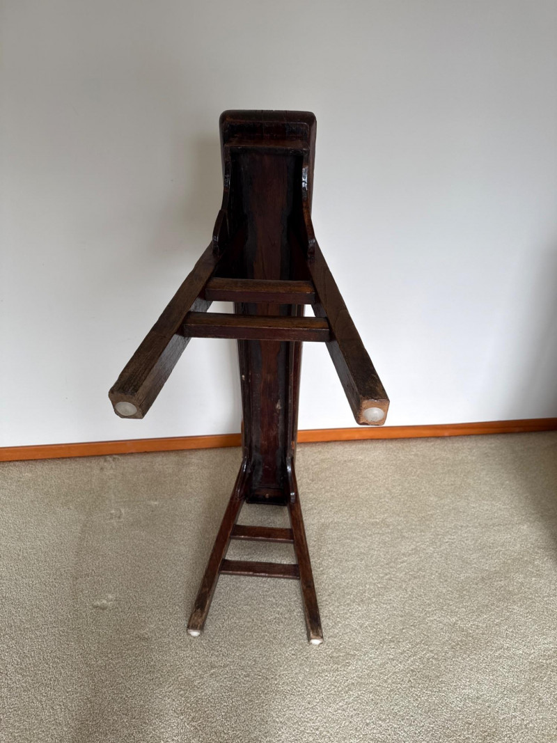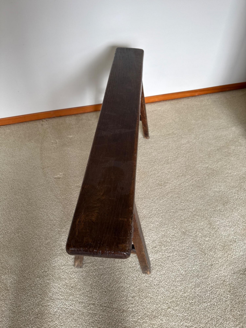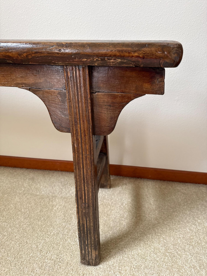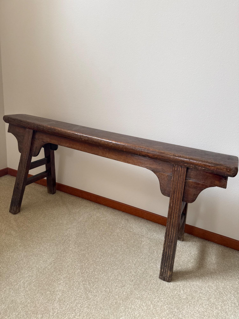 A simple, early-style wooden bench with a long narrow seat and cut‑out side supports, offering the classic look of a primitive farmhouse “shoe bench” or hall bench. The dark, time‑worn finish and visible grain give it authentic rustic character, and its compact footprint makes it easy to place in an entryway, mudroom, or as an accent piece. 43 W x 19 T x 5.5 D