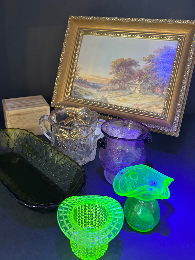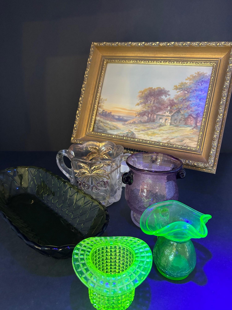 Lot # 18 - Mixed Glass Lot with Framed Print- Two Uranium Pieces