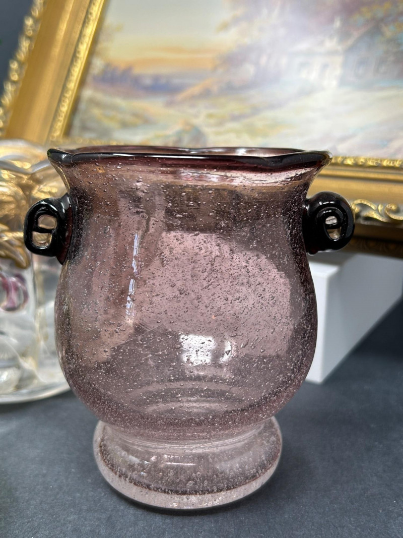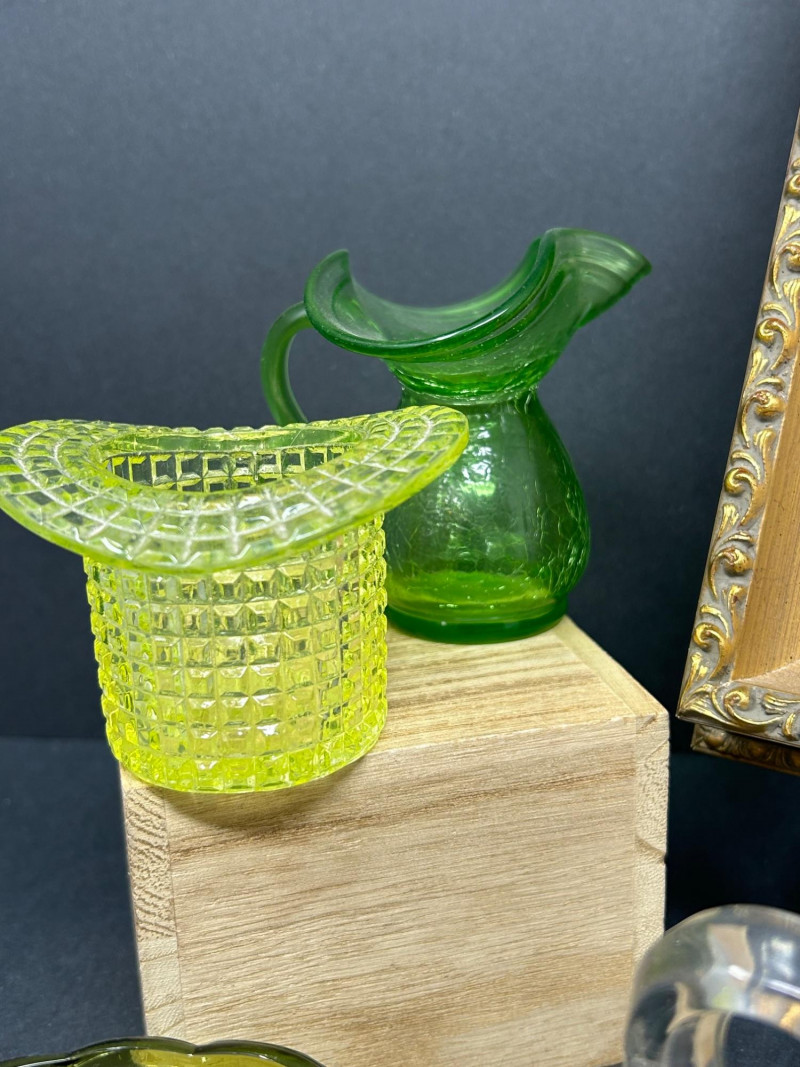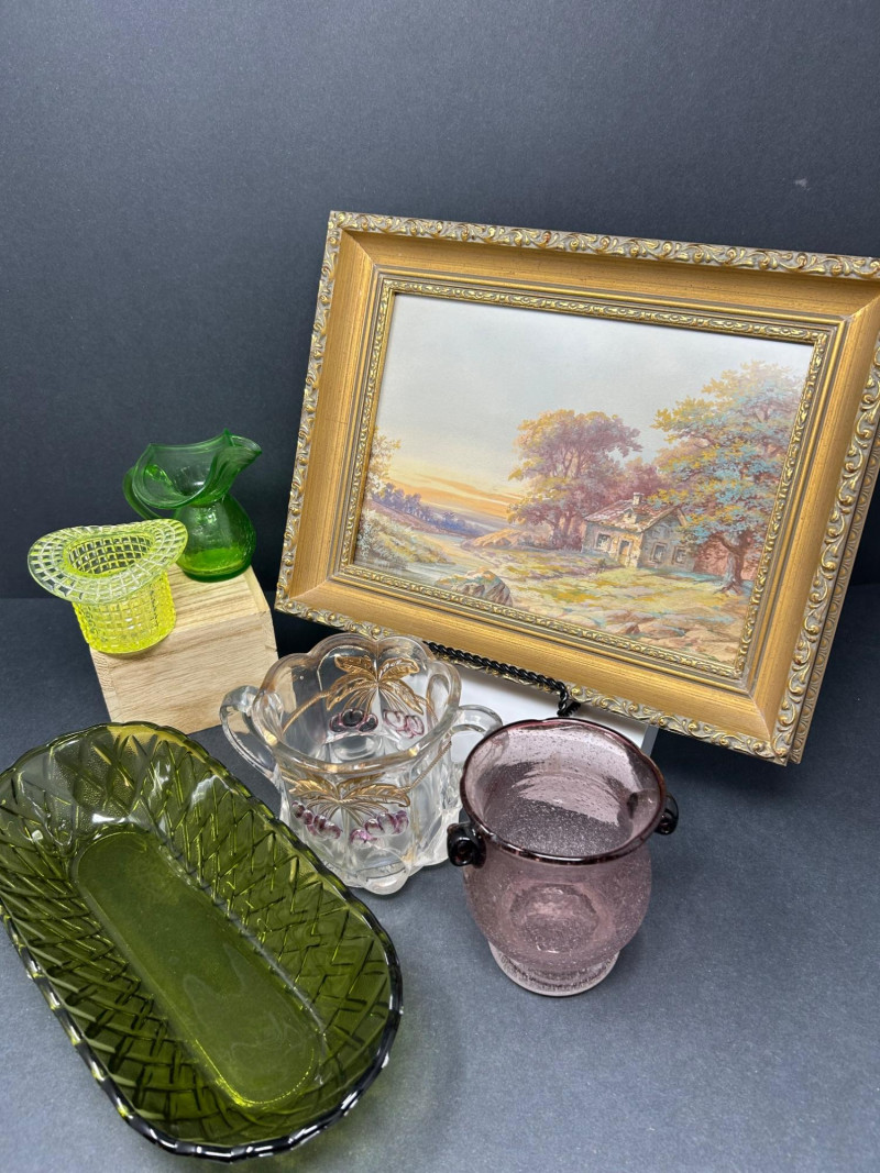 A mixed grouping of vintage glassware and a framed print, including: Green pressed‑glass dish with diamond pattern Clear glass creamer with floral design Small purple art‑glass vase with applied handles Green glass pitcher creamer- uranium glass Glass Eapg Vaseline Uranium Top Hat toothpick holder Framed countryside print in an ornate gold‑tone frame Picture 12 x 9 hat 2.5 tall purple 4” tall