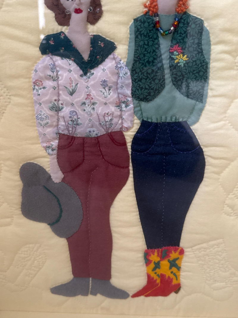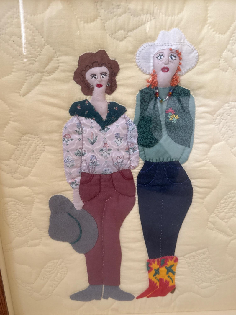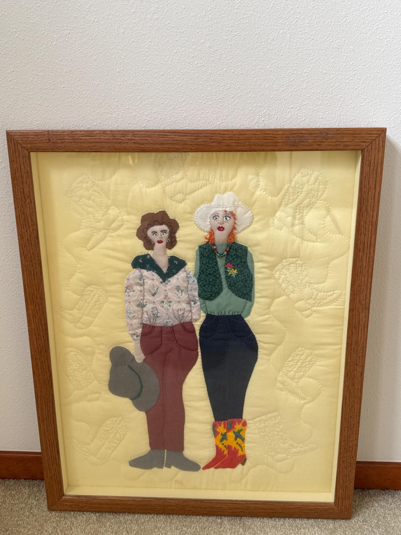 A handmade textile artwork featuring two cowgirl figures created from layered and stitched fabric pieces. Each figure is constructed from patterned and solid fabrics with detailed clothing elements, including hats, shirts, vests, pants, and boots. The background is quilted with a repeating cowboy‑themed print, and the piece is set in a wooden frame. 21.6 x 17.5