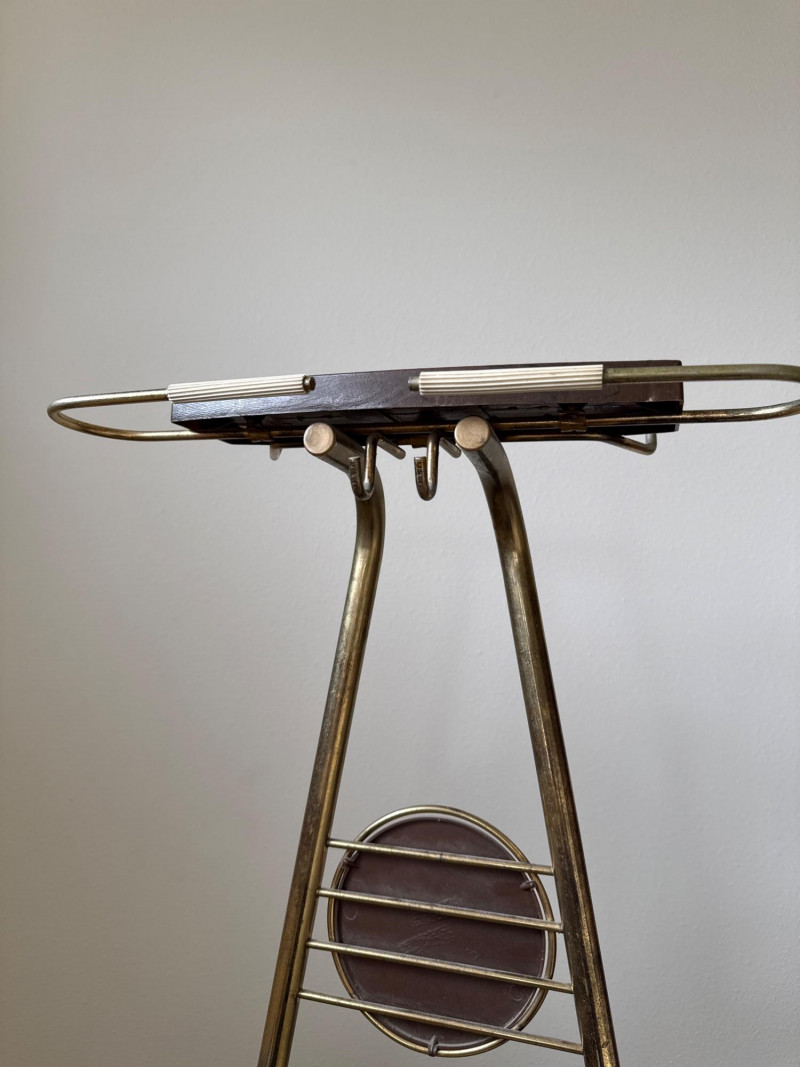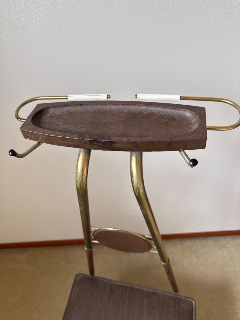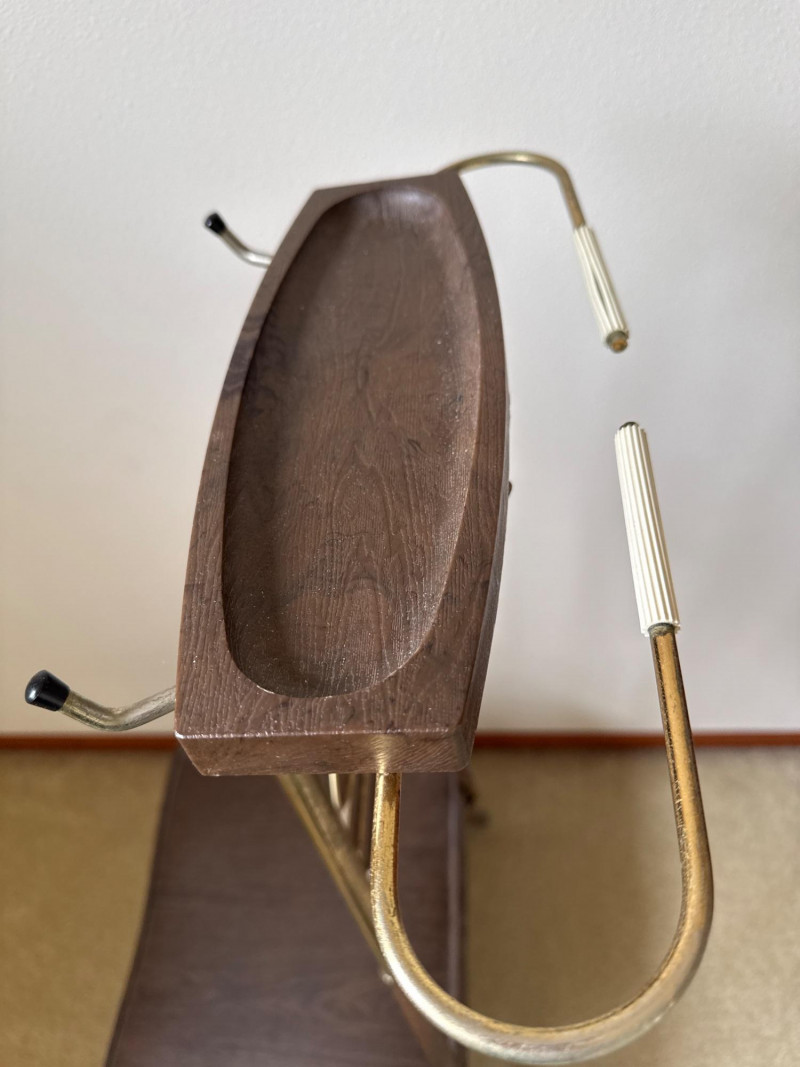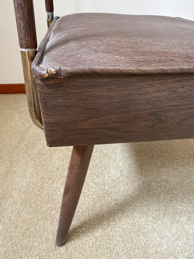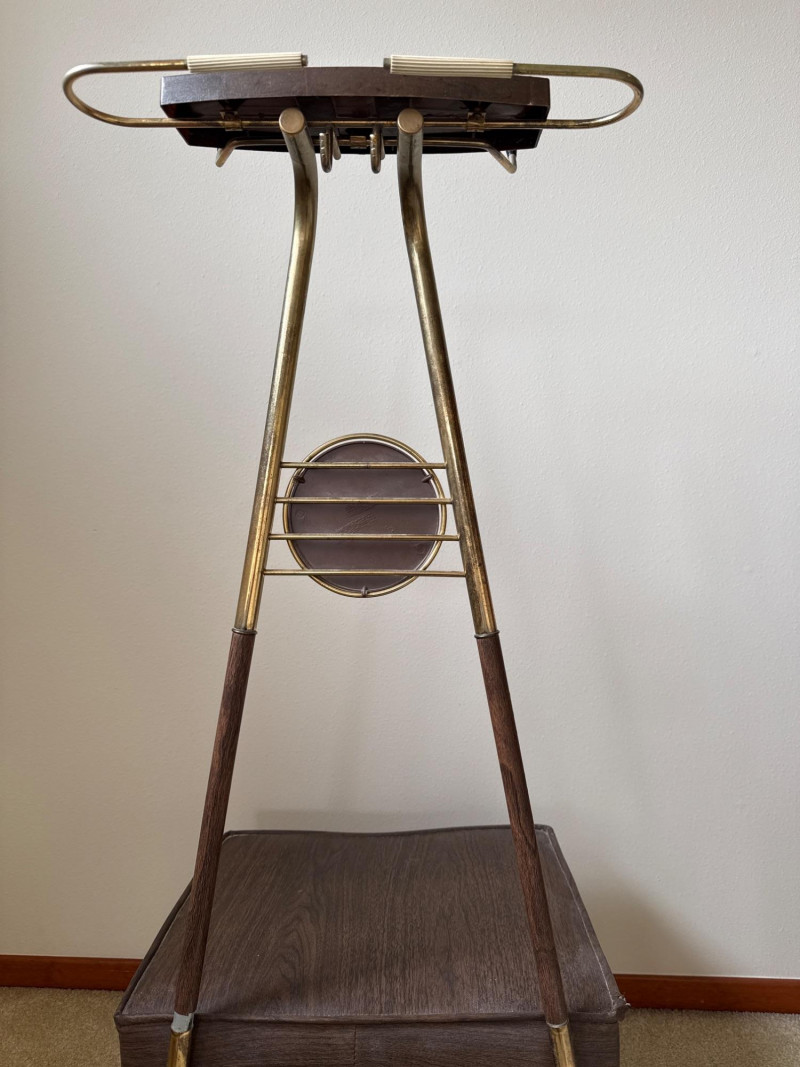 A mid‑century valet chair with a vinyl seat designed to resemble wood grain. The seat has a small tear in one corner. The upper structure is metal and includes a jacket hanger, accessory tray, and trouser bar, with a circular wooden accent at center. The chair stands on wooden legs. 18 W x 14.5 D x 43 T