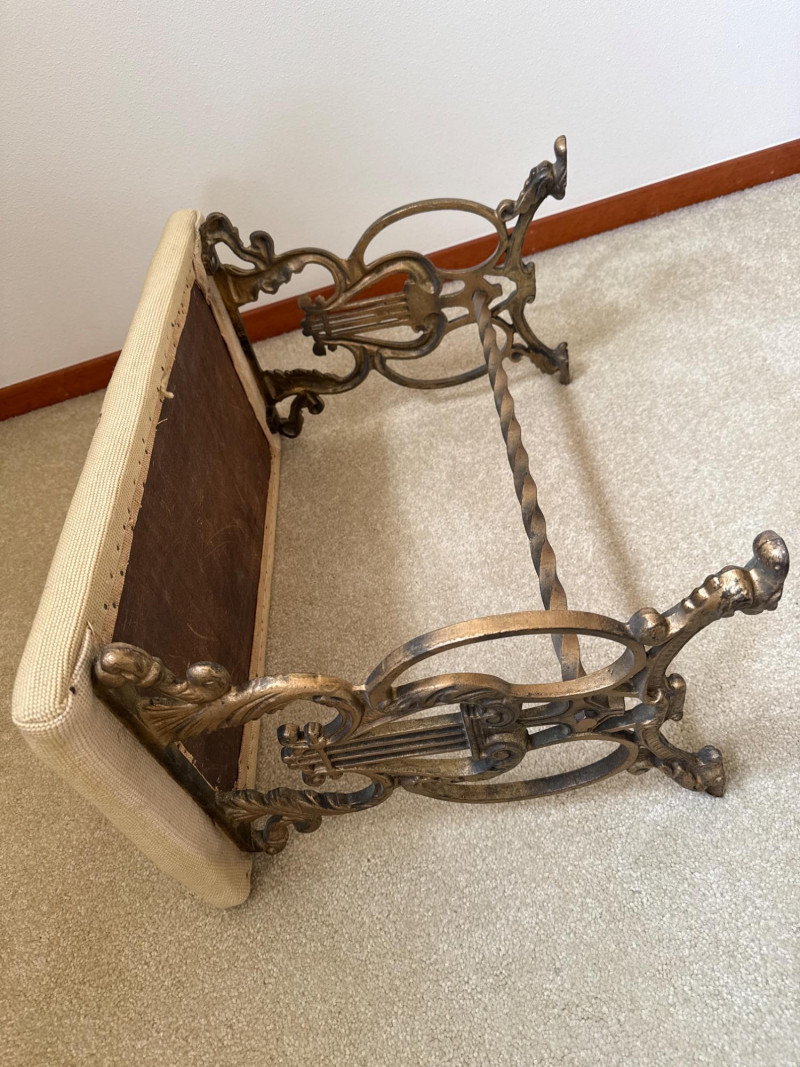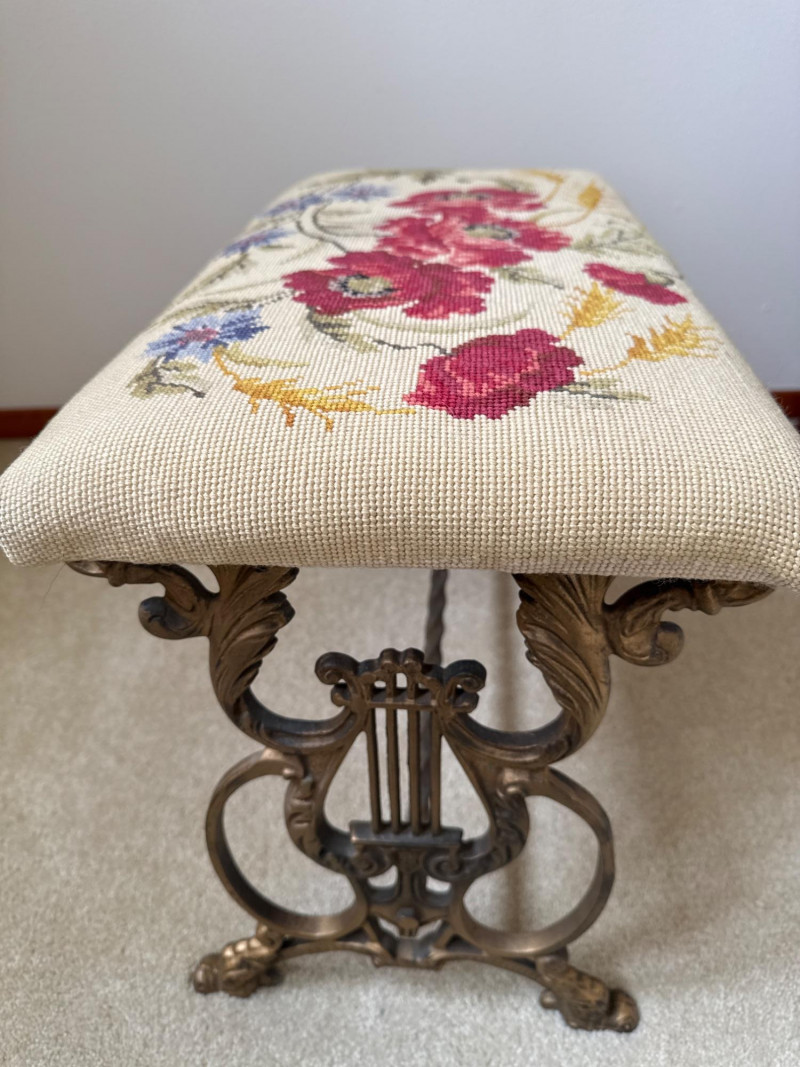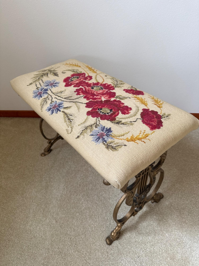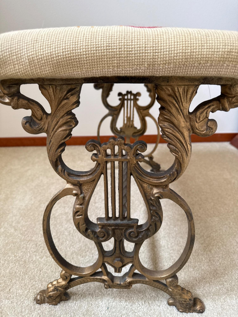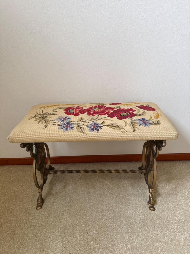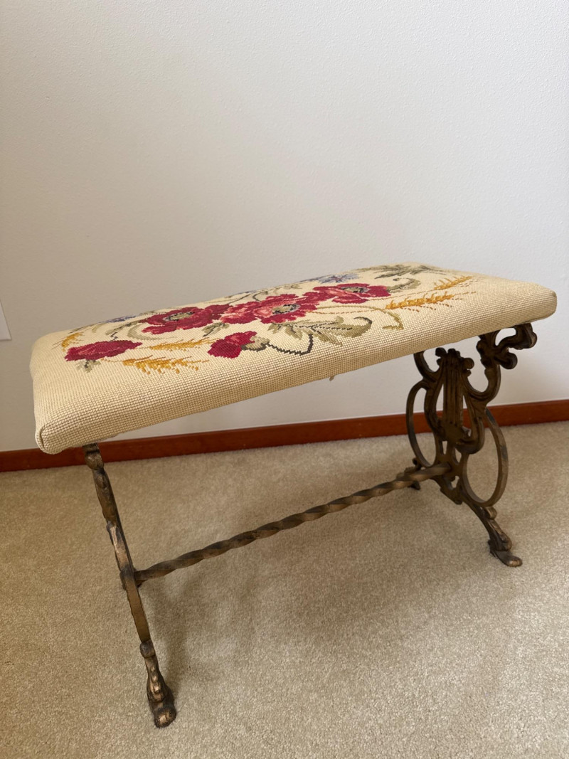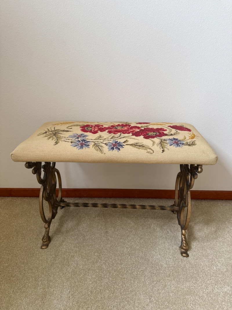 A vintage bench featuring a decorative metal base with scrollwork and lyre‑style side elements. The seat is upholstered in a floral needlework tapestry. Heavy base, appears to be cast iron. 23.5 L x 12 W x 16 T