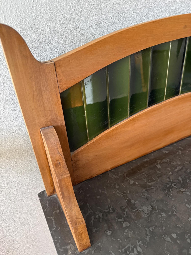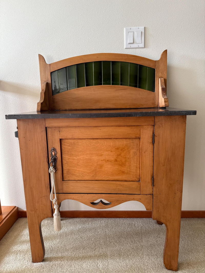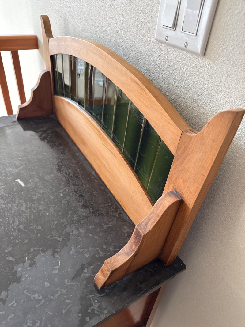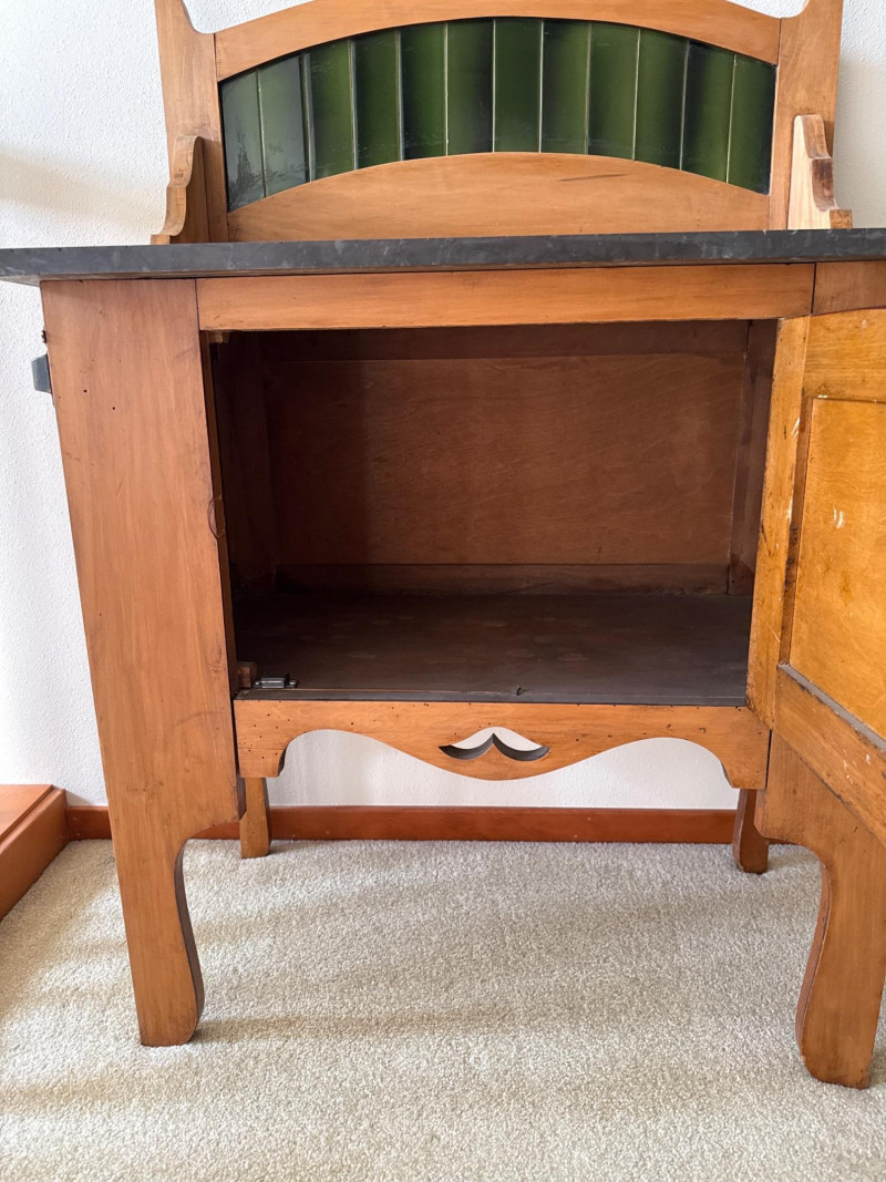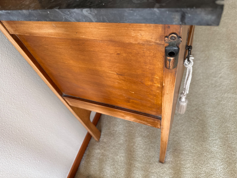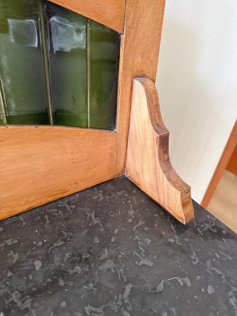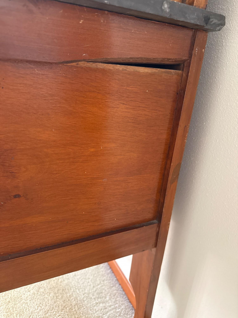 A vintage wooden side cabinet with a marble top and an attached backsplash fitted with vertical green stained‑glass panels. The cabinet features a single lower door with a metal pull, shaped legs, and a decorative cut‑out at the lower center. The stained‑glass back rises above the cabinet and is framed in matching wood. PLEASE NOTE- THE TOP OF THE MARBLE IS NOT DAMAGED THAT WHITE MARK IS PART OF THE GRANITE. THERE IS MINIMAL DAMAGE TO THE CABINET, ONE TOWARD FRONT (PICTURED), THE OTHER ONE IS ON THE SIDE OF THE CABINET, THIS MORE SIGNIFICANT (PICTURED)