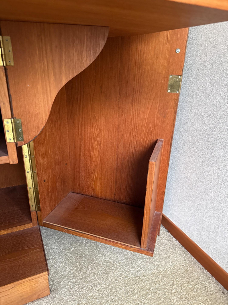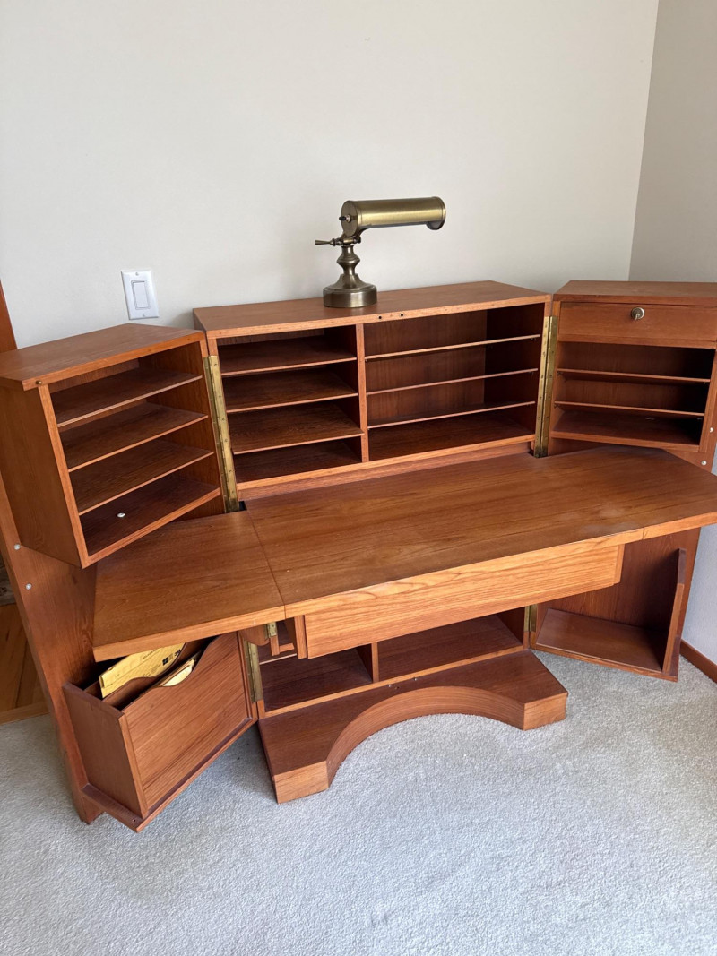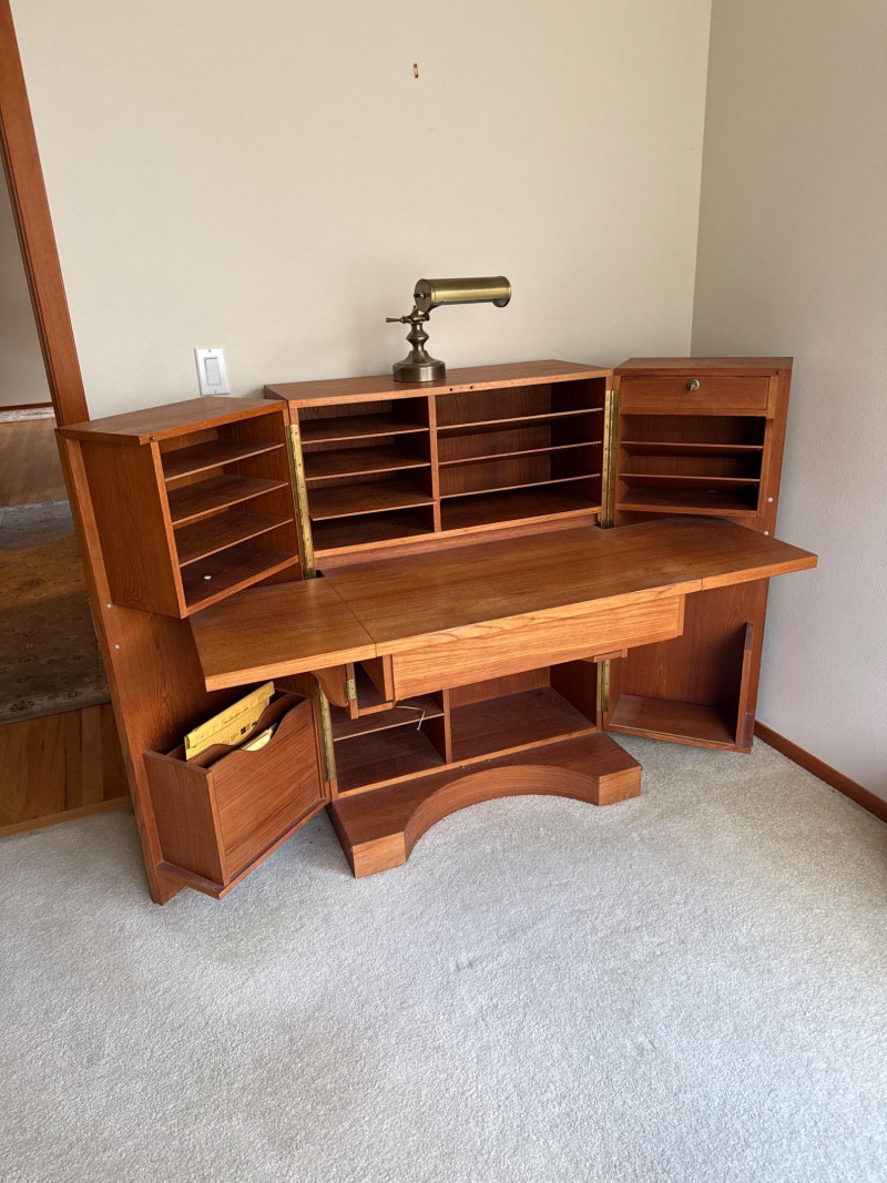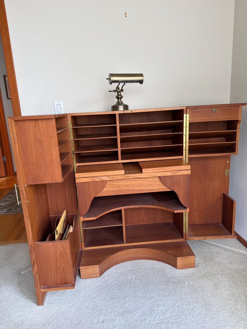 A vintage Magic Box desk crafted in teak, designed with a fold‑out workstation that opens to reveal multiple interior storage compartments. The upper section includes open cubbies and side cabinets with doors, while the lower portion offers additional shelving and a central drawer. When closed, the unit forms a compact cabinet; when opened, it expands into a full workspace. Brass desk lamp included. Picture of desk closed is not the actual piece for sale. The one for sale is much more intricate. Closed- 32 x 20.5 x 45 Tall 64.5" OpenTeak Magic Box Desk