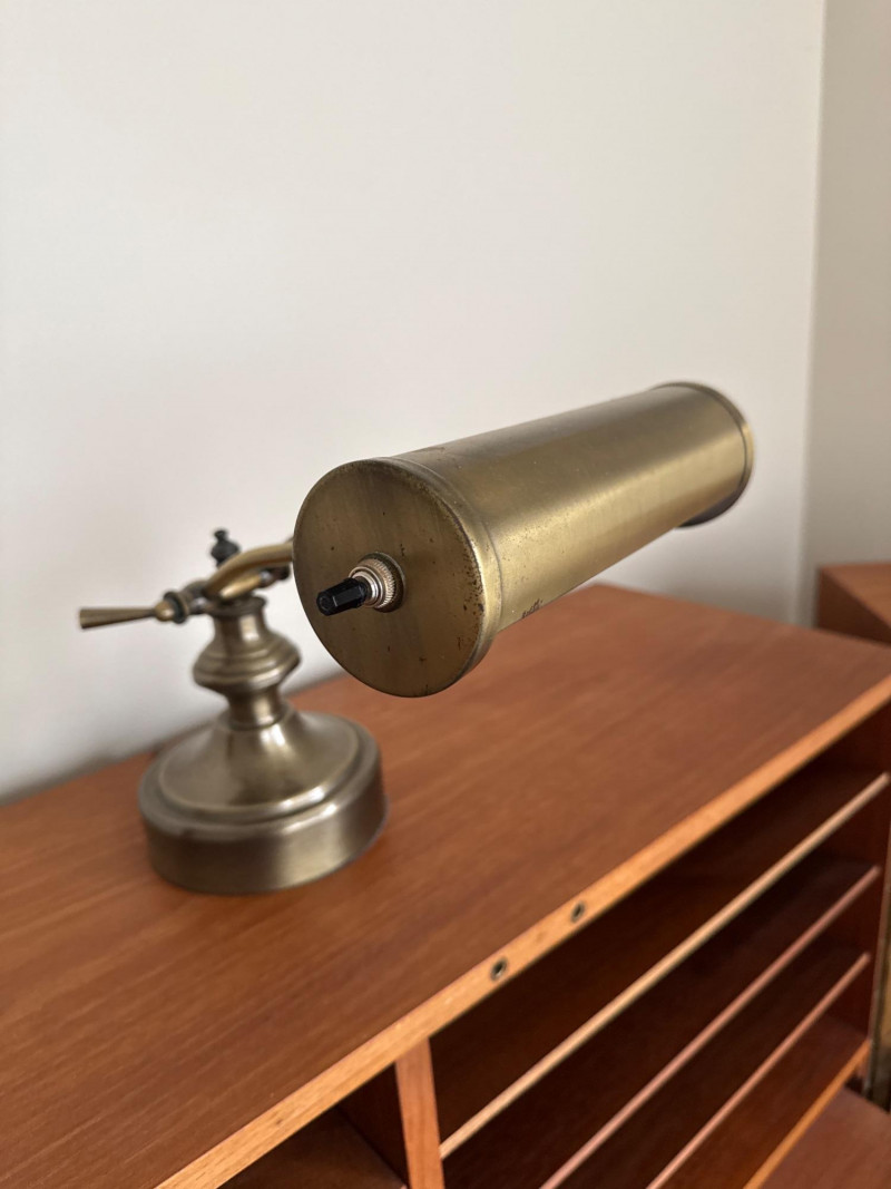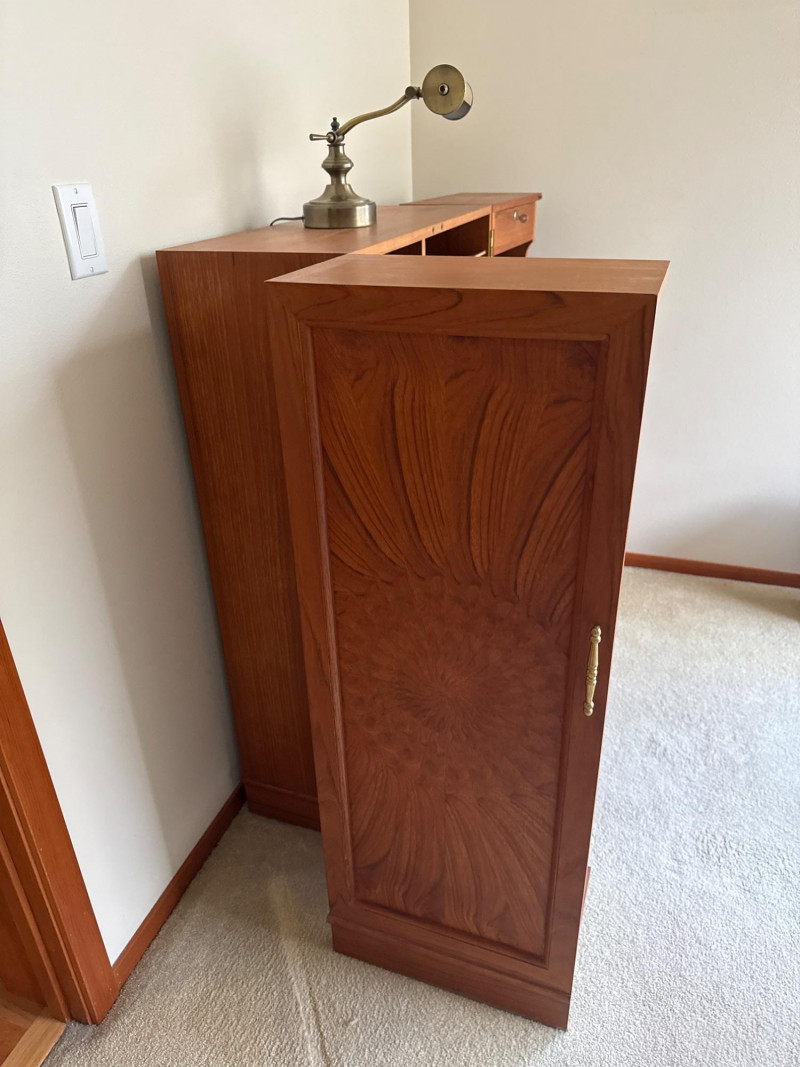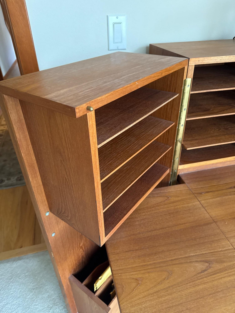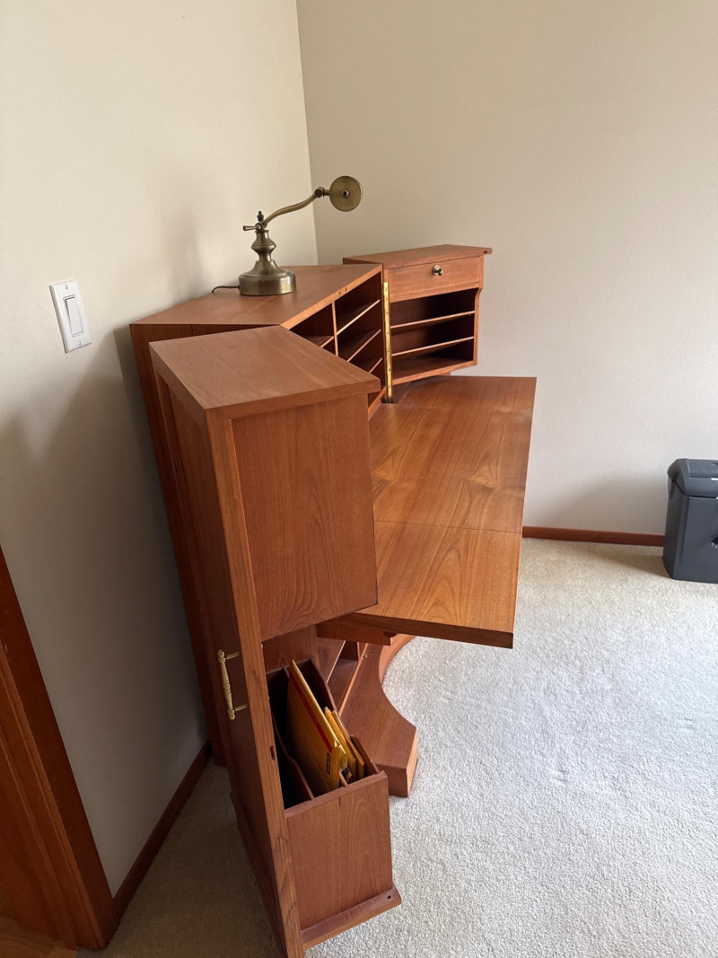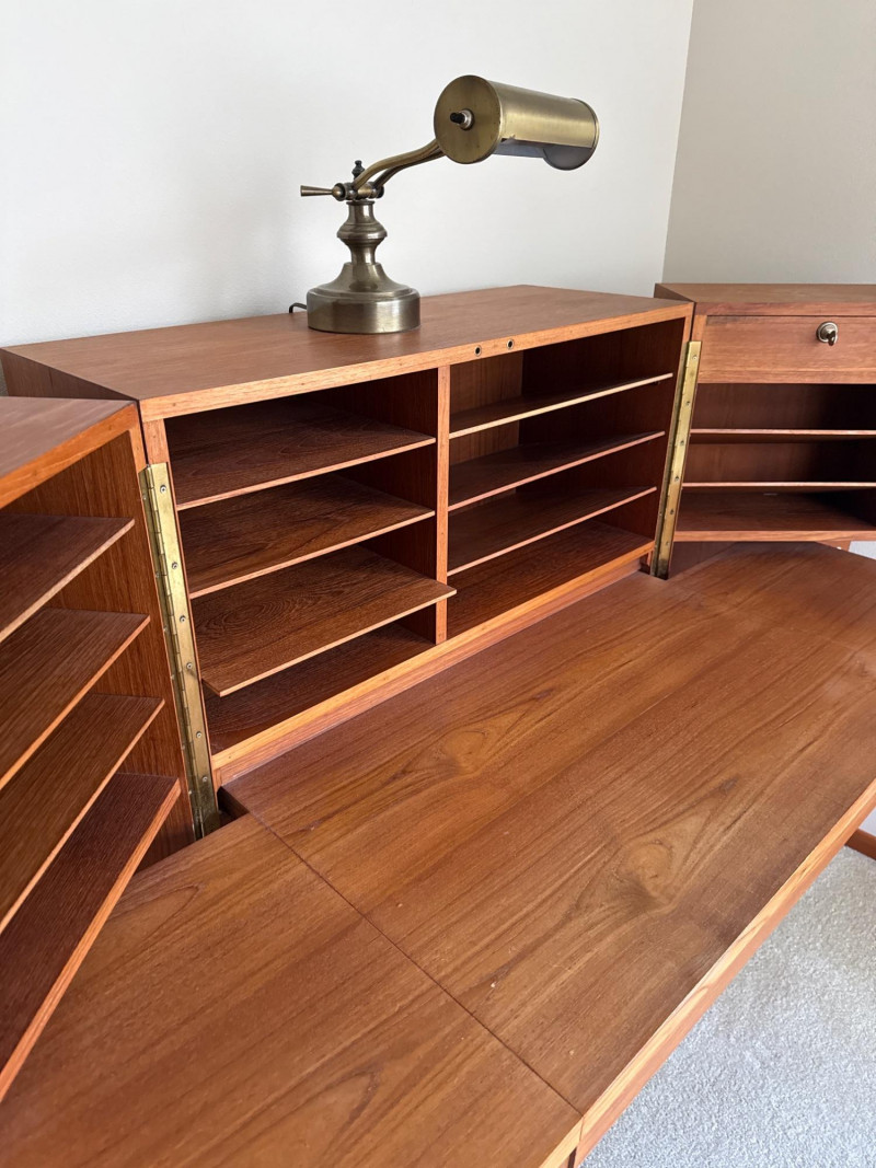 A vintage Magic Box desk crafted in teak, designed with a fold‑out workstation that opens to reveal multiple interior storage compartments. The upper section includes open cubbies and side cabinets with doors, while the lower portion offers additional shelving and a central drawer. When closed, the unit forms a compact cabinet; when opened, it expands into a full workspace. Brass desk lamp included. Picture of desk closed is not the actual piece for sale. The one for sale is much more intricate. Closed- 32 x 20.5 x 45 Tall 64.5" OpenTeak Magic Box Desk