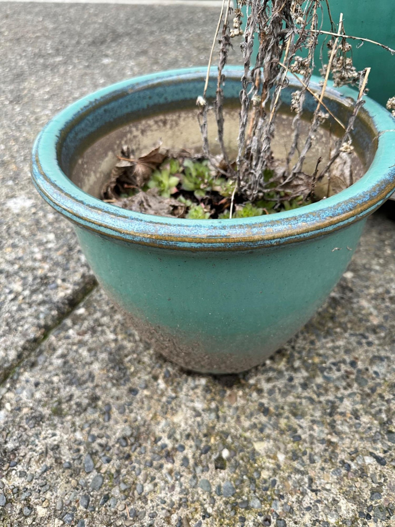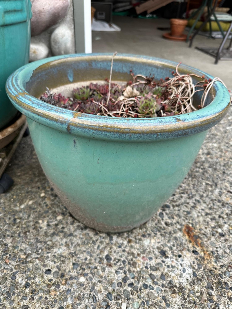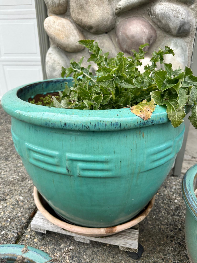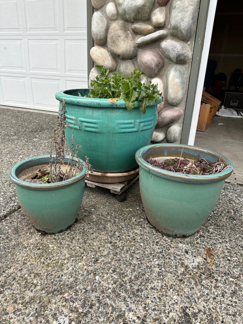 Set of three ceramic planters in matching turquoise drip‑glaze finish. The group includes three different sizes, each with the same glaze style and color. Largest- 21 x 18 Medium- 14 x 12 Smallest- 11.5 x 10