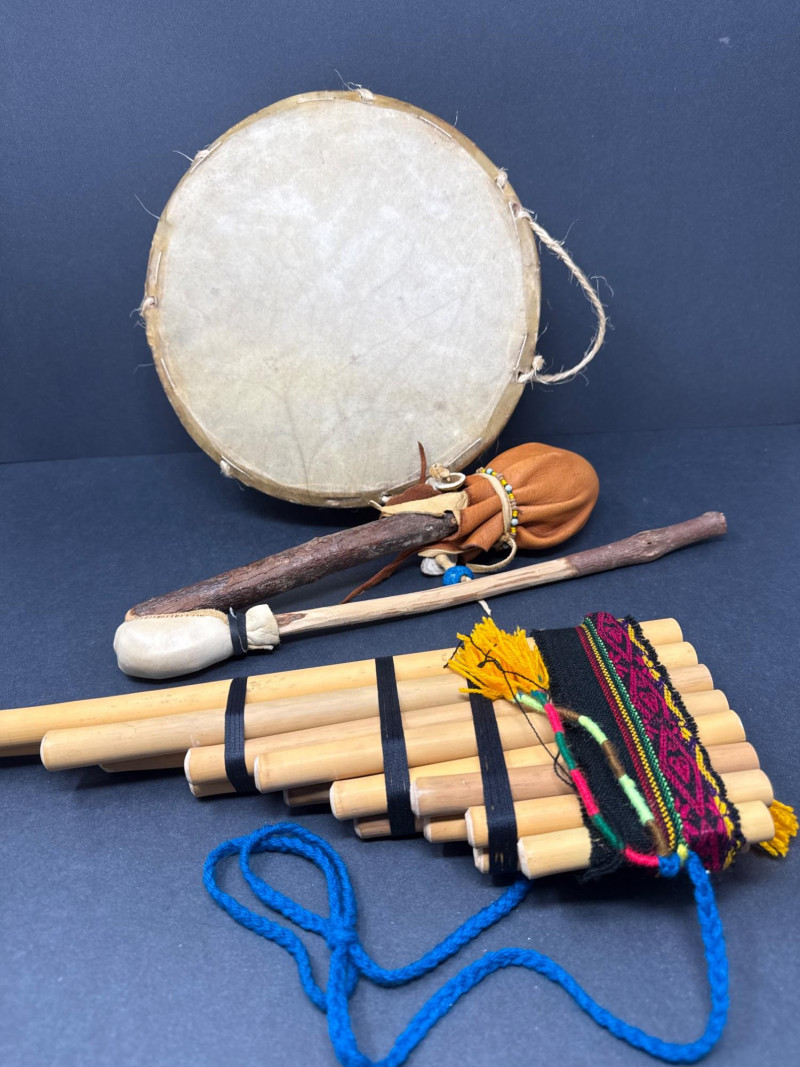 Measures: 10.5" diameter × 3" tall One padded beater One decorative beater with beads and leather accents A handcrafted bamboo pan flute with graduated pipes, wrapped with woven textile bands and finished with colorful tassels and a braided hanging cord.Frame Drum