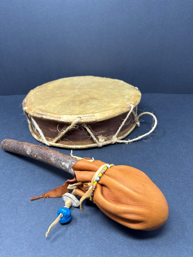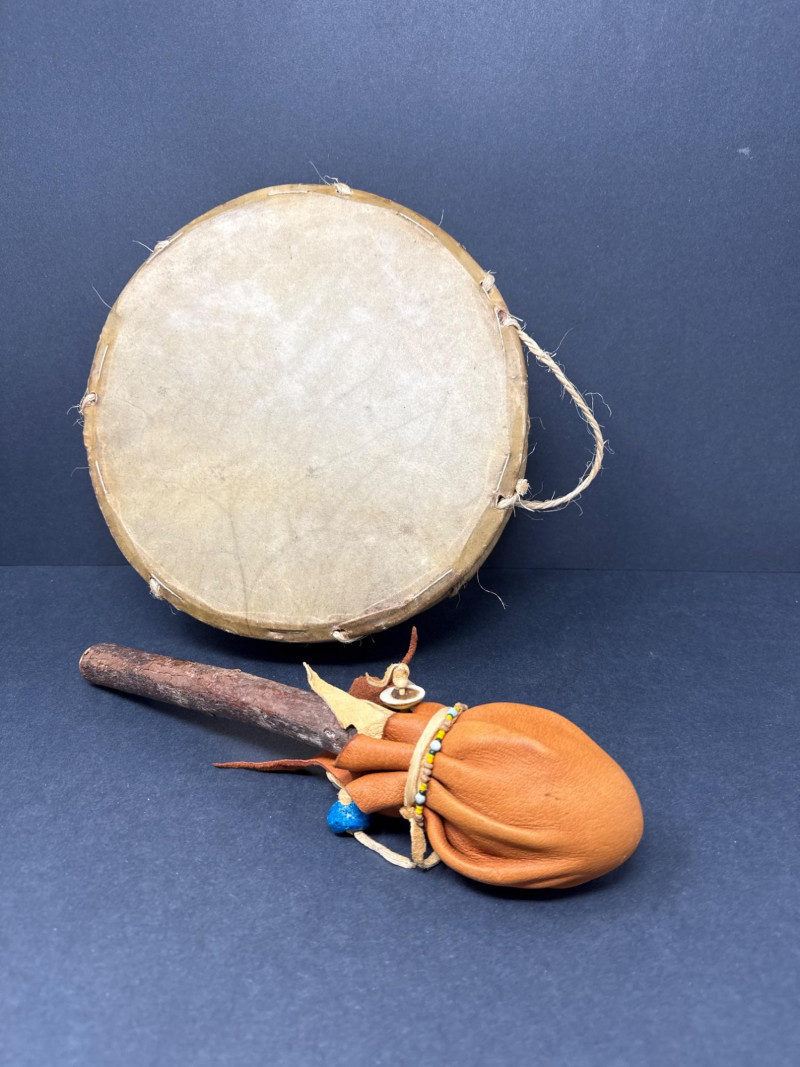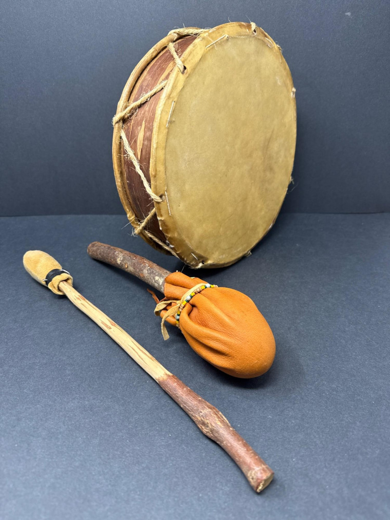 A small percussion and wind‑instrument grouping that includes: A traditional round frame drum with natural hide head and rope handle.