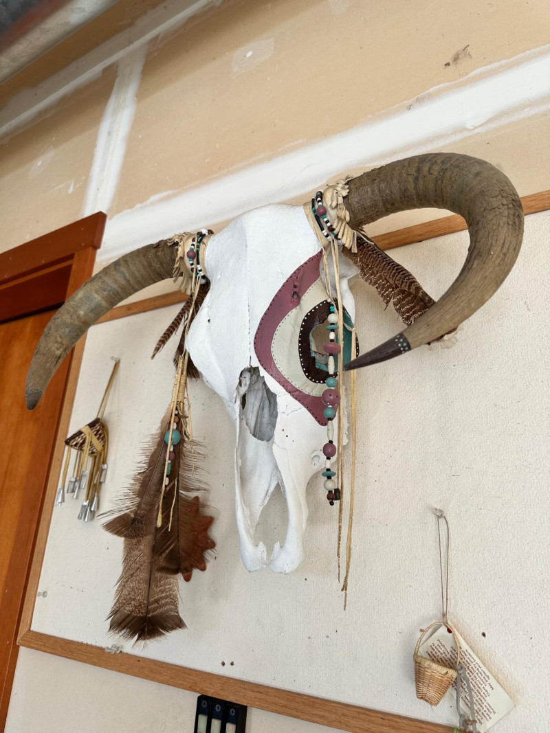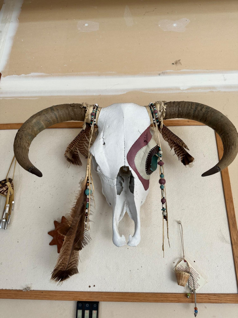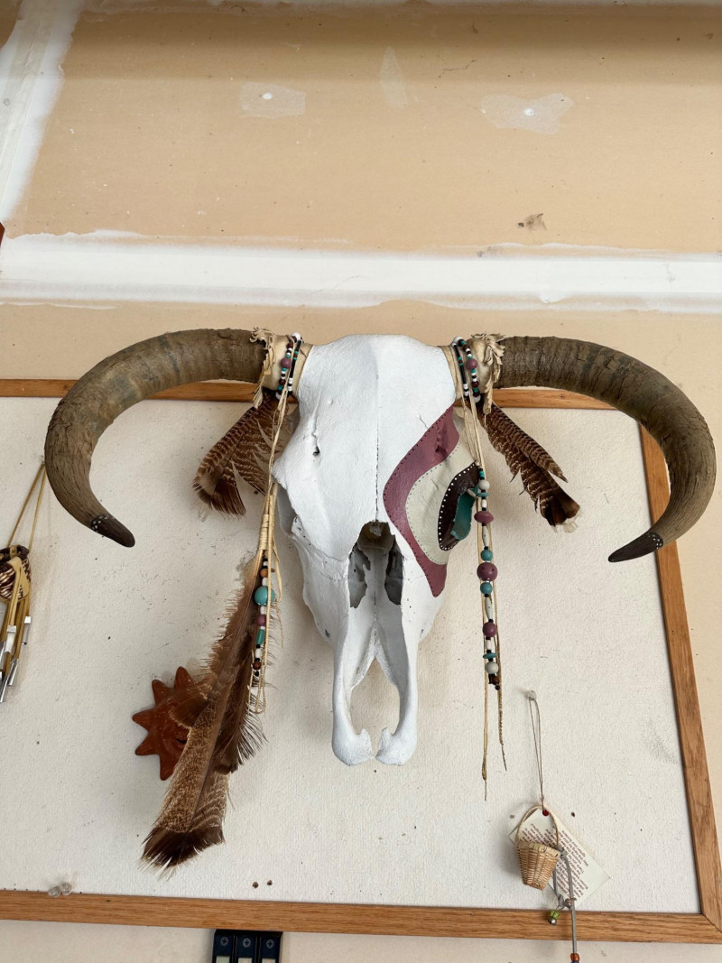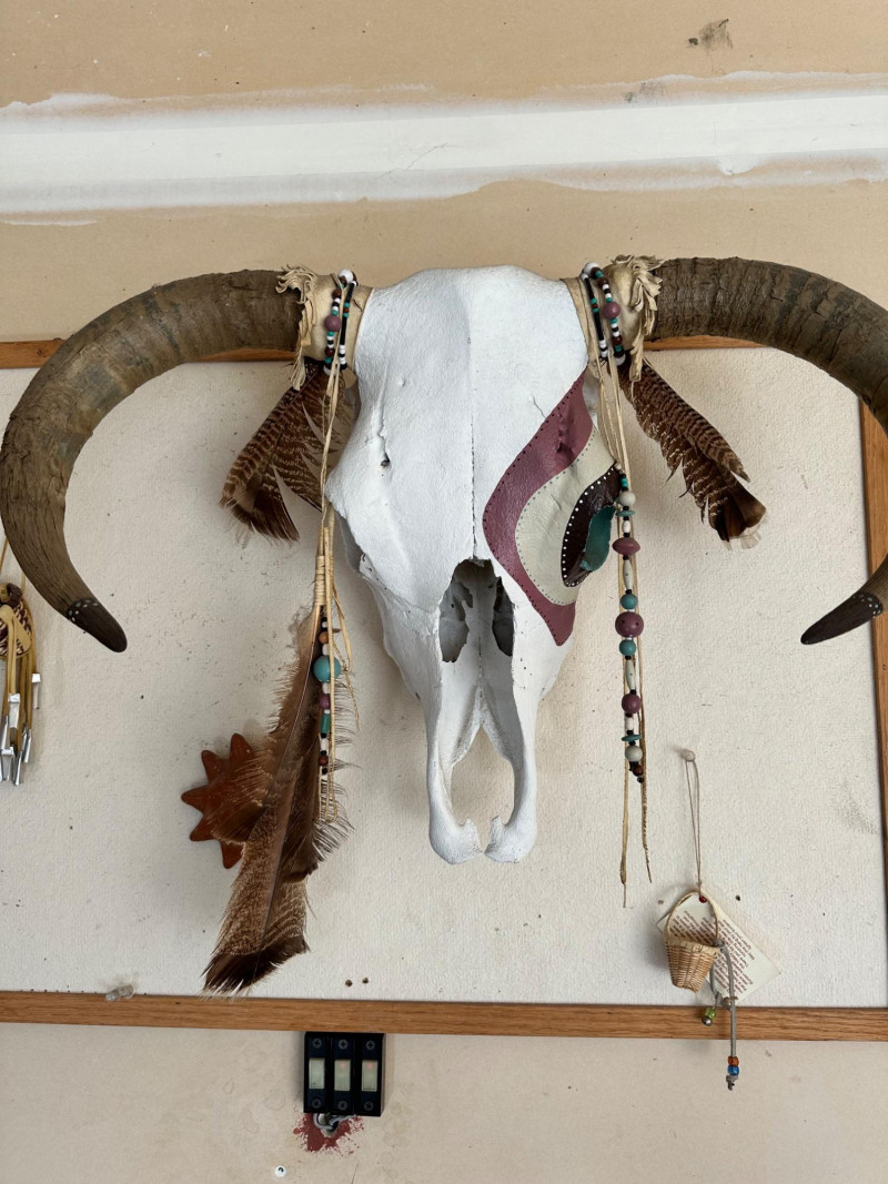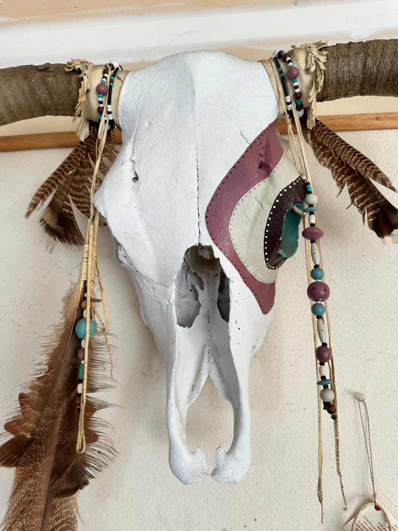 Bull skull with intact horns, painted in white and maroon and accented with beadwork, feathers, and leather details. Designed for wall display.