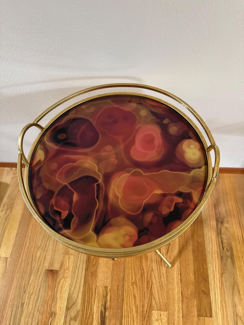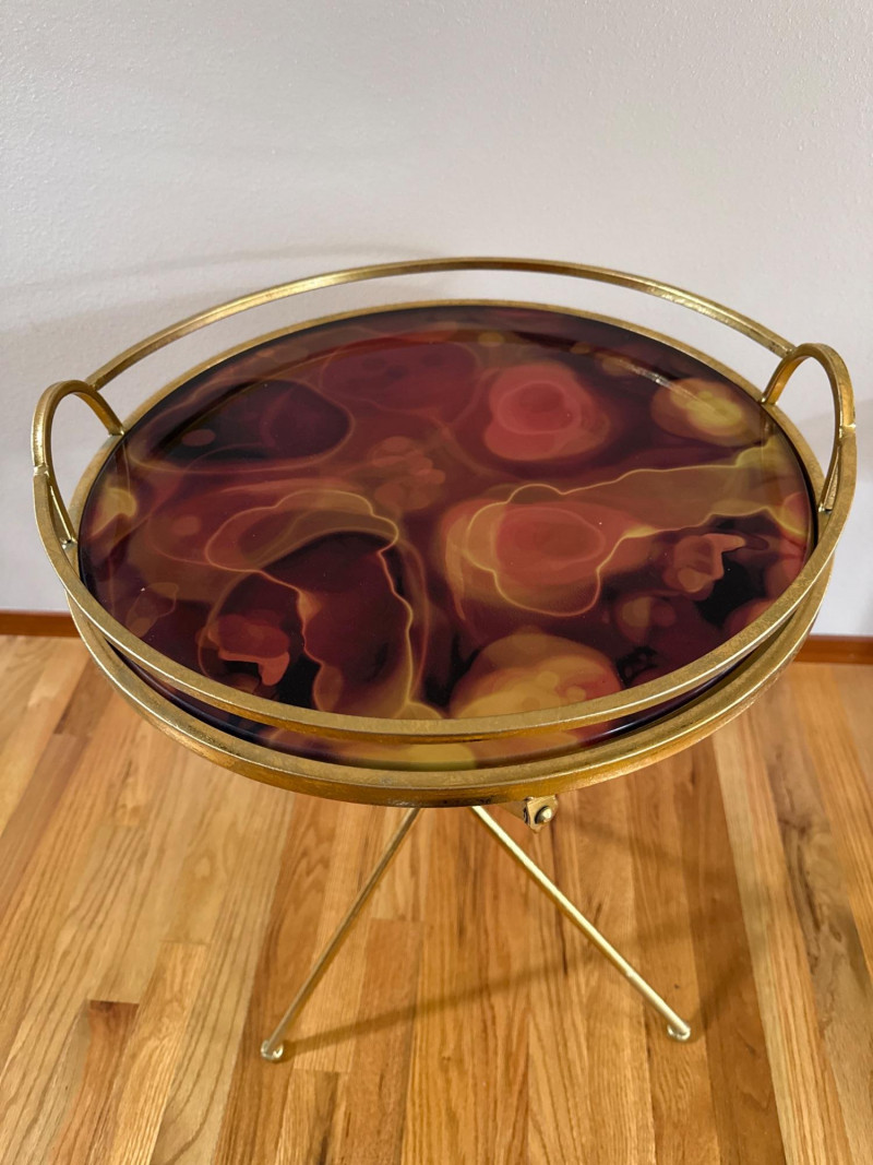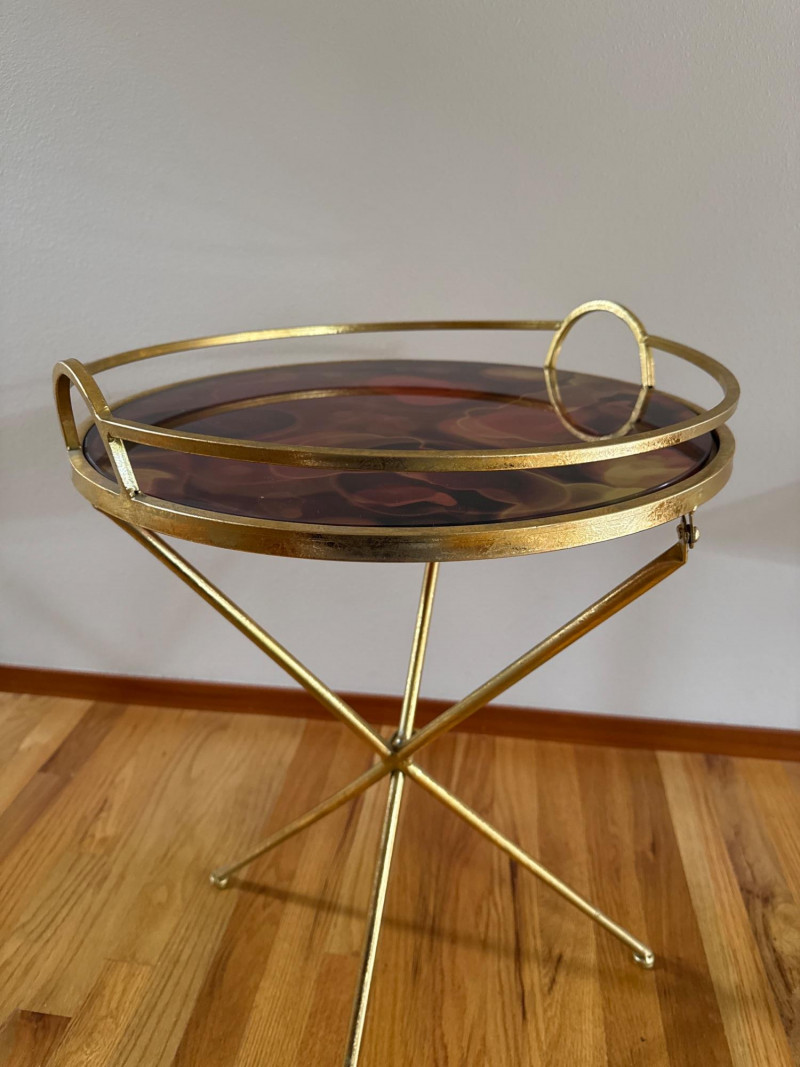 A modern round side table with a glass top featuring a warm marbled design beneath. Supported by a gold‑tone metal base with crossed legs for a light, contemporary look.