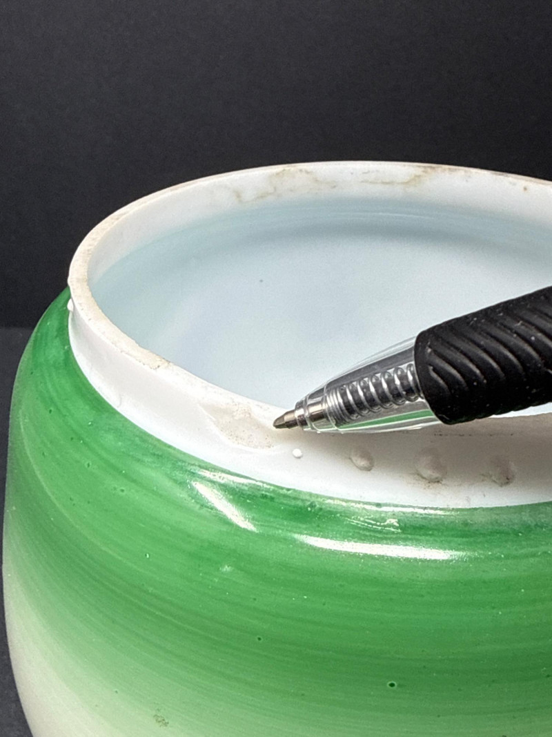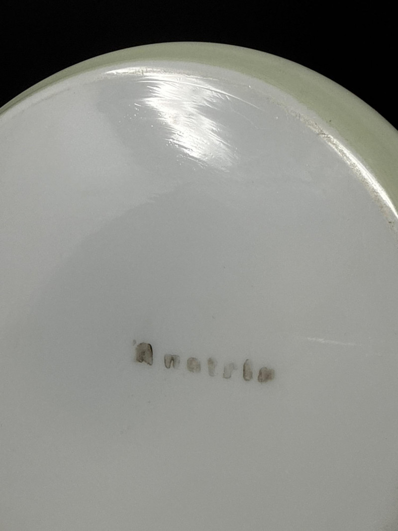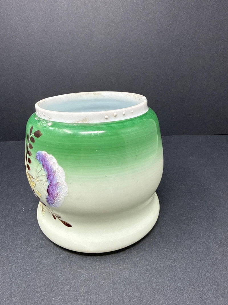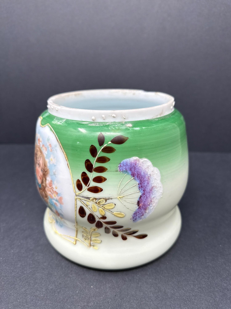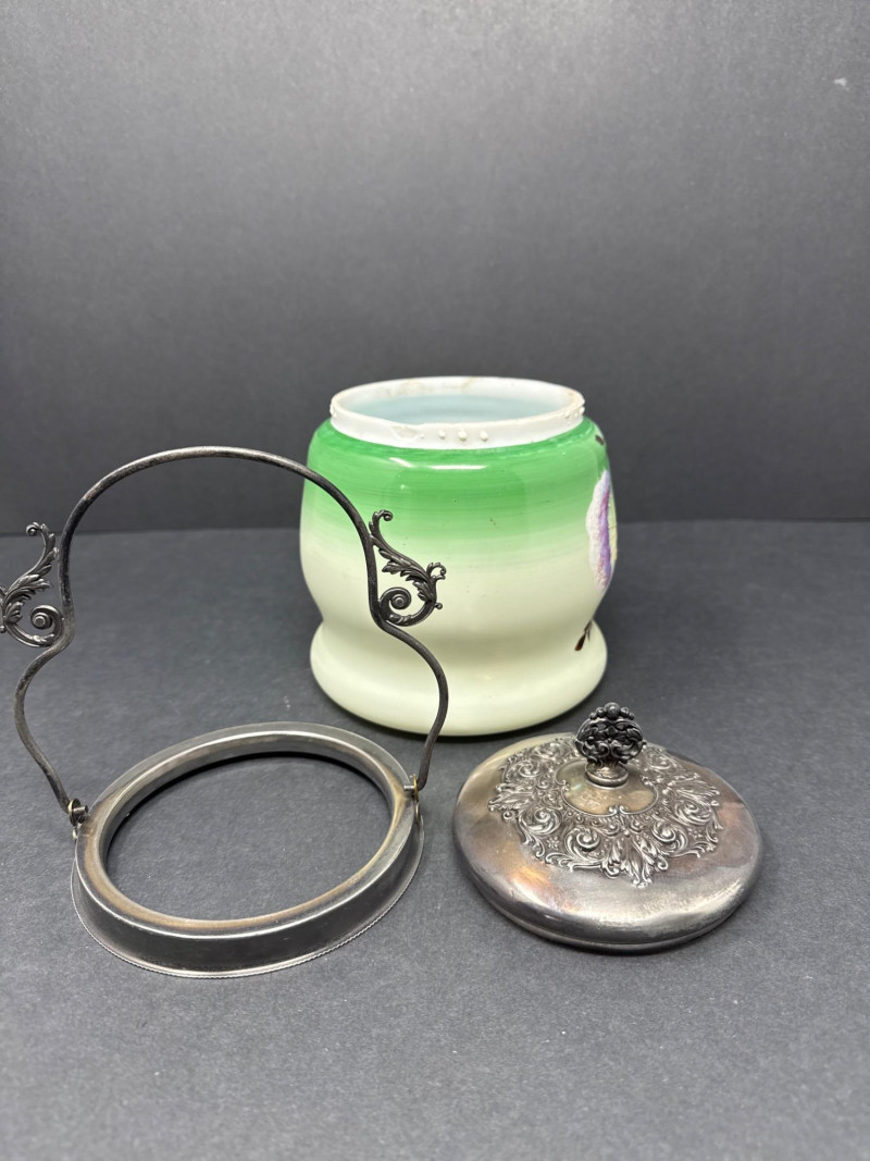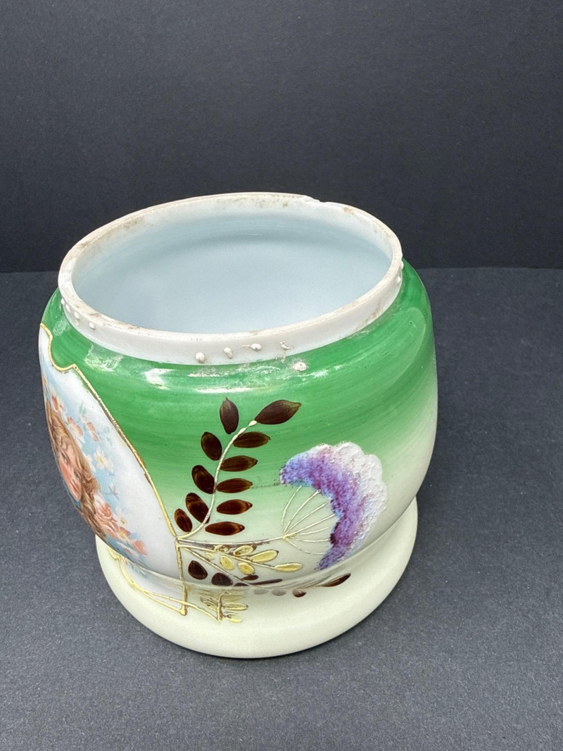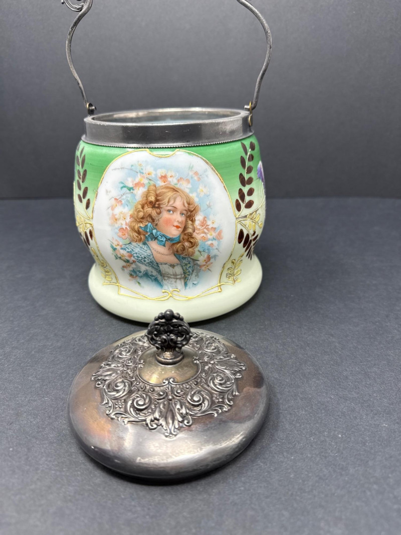 Hand‑painted porcelain biscuit jar featuring a gilt‑framed portrait of a blonde Victorian woman, set against green, white, and maroon panels with gold leaf accents. Finished with an ornate engraved metal lid and decorative swing handle. Condition: Small chip located under the rim, not visible unless the metal collar is removed.