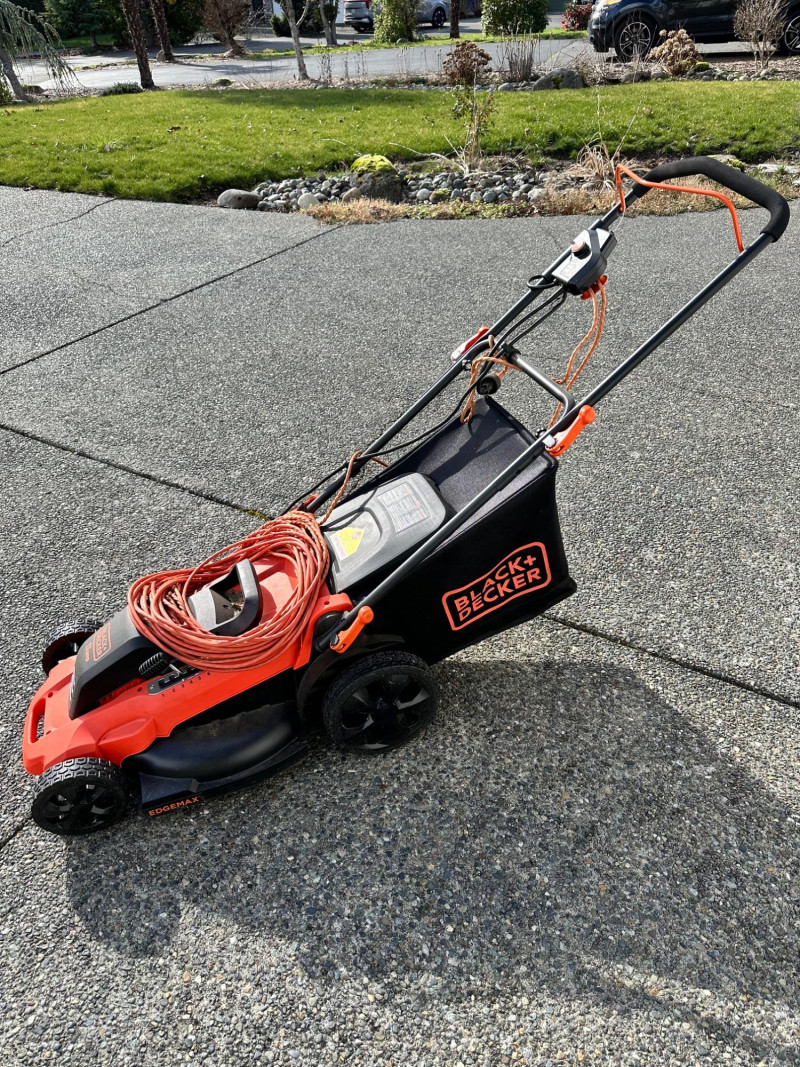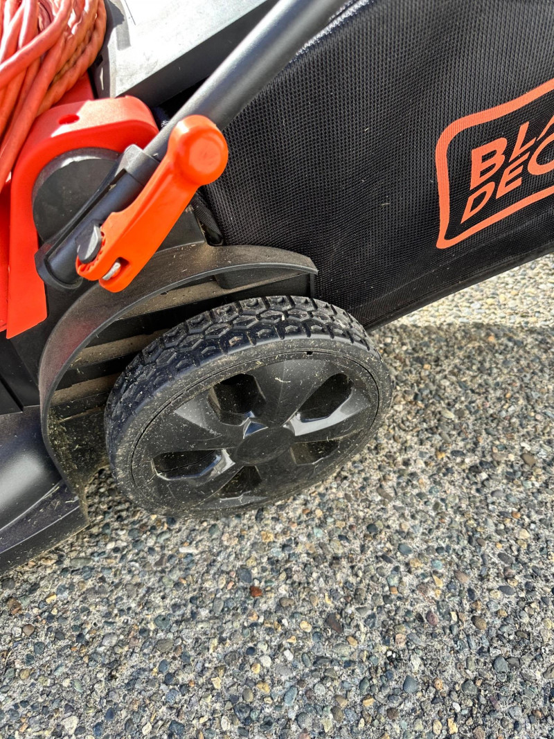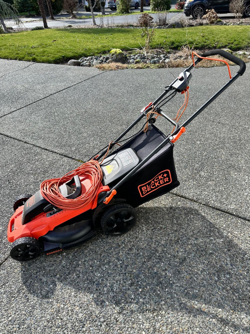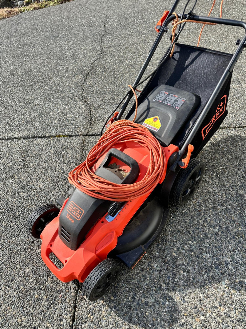 Black+Decker electric lawn mower with rear grass‑collection bag and corded operation. Features a red and black body with an upright handle and control panel. An orange extension cord is shown placed on top of the mower deck. Not tested but looks relatively new.