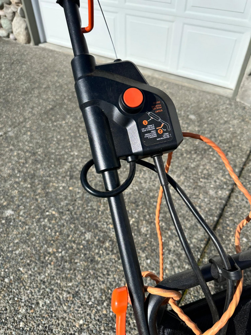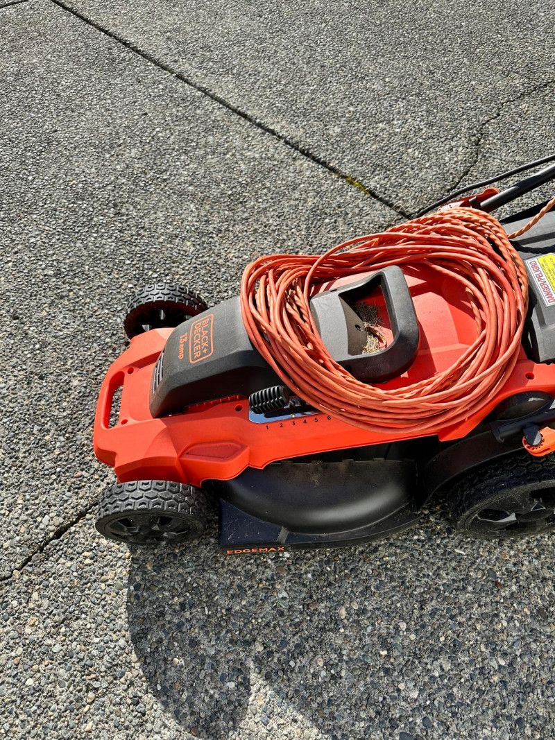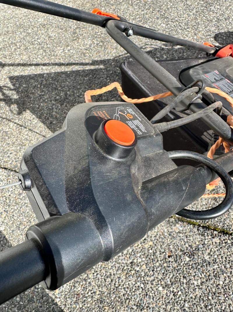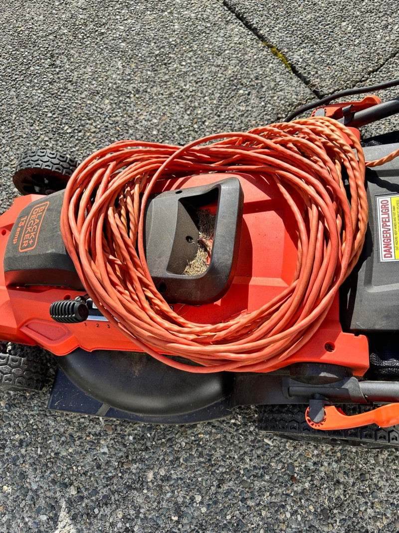 Black+Decker electric lawn mower with rear grass‑collection bag and corded operation. Features a red and black body with an upright handle and control panel. An orange extension cord is shown placed on top of the mower deck. Not tested but looks relatively new.