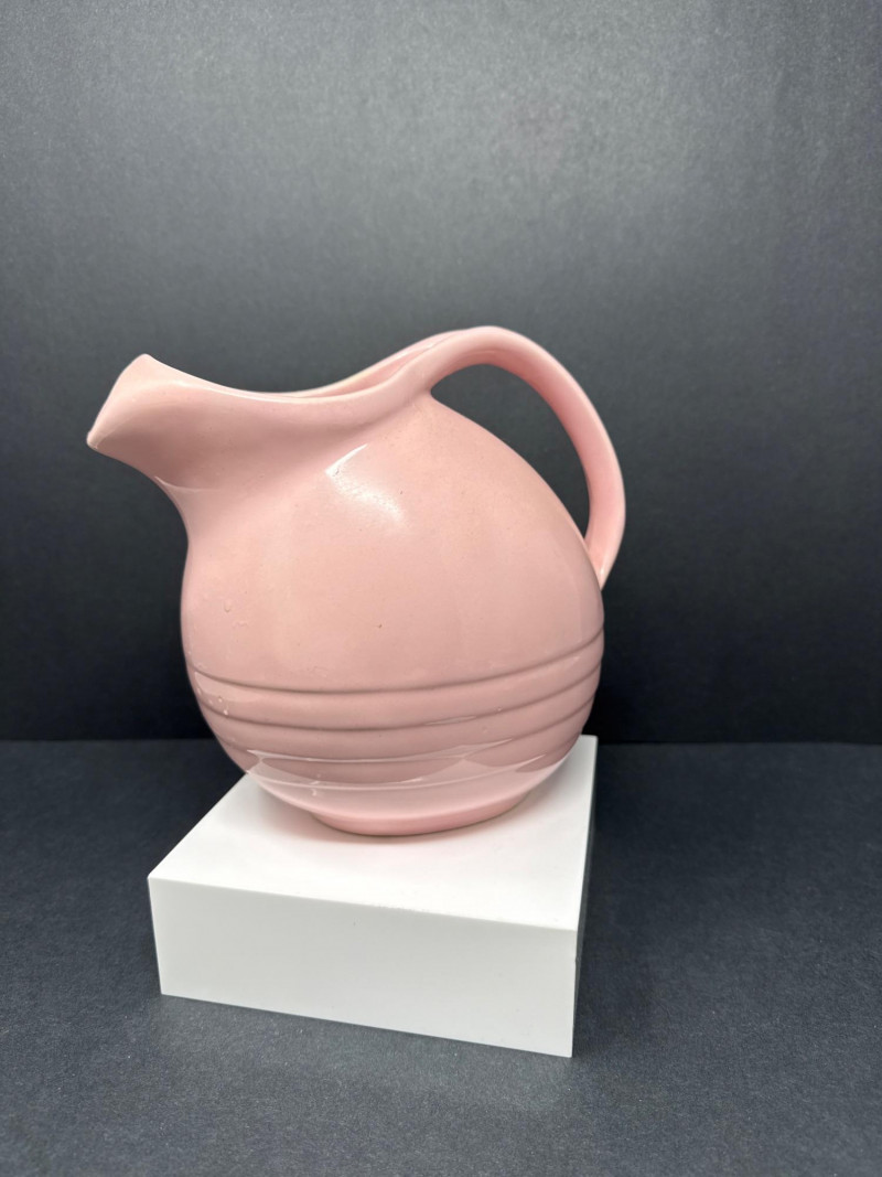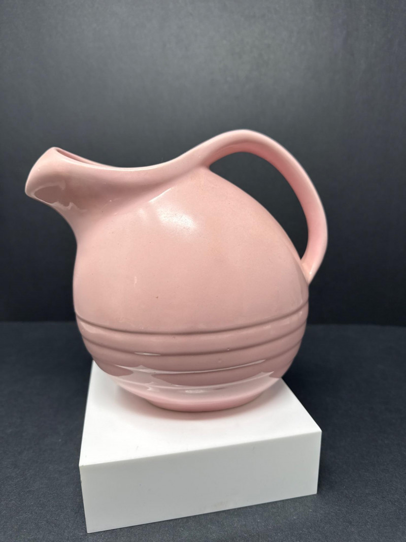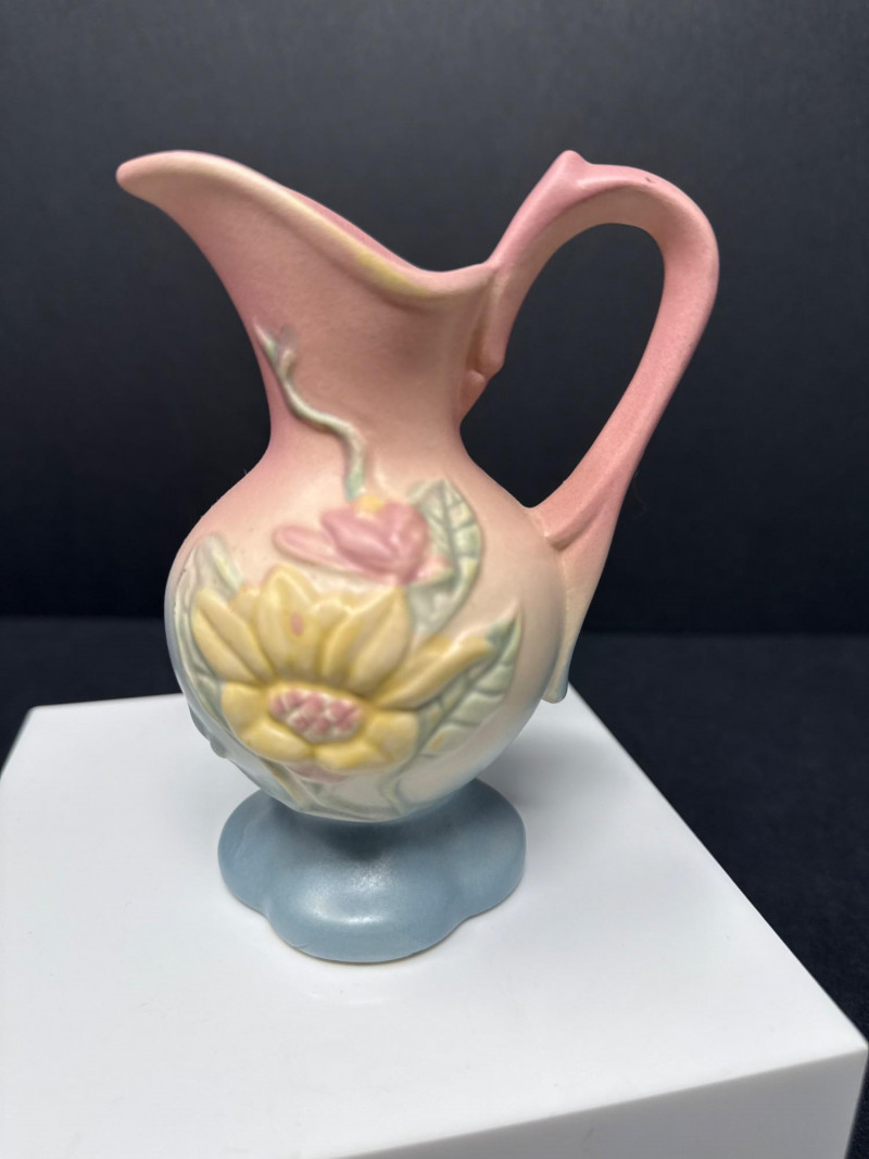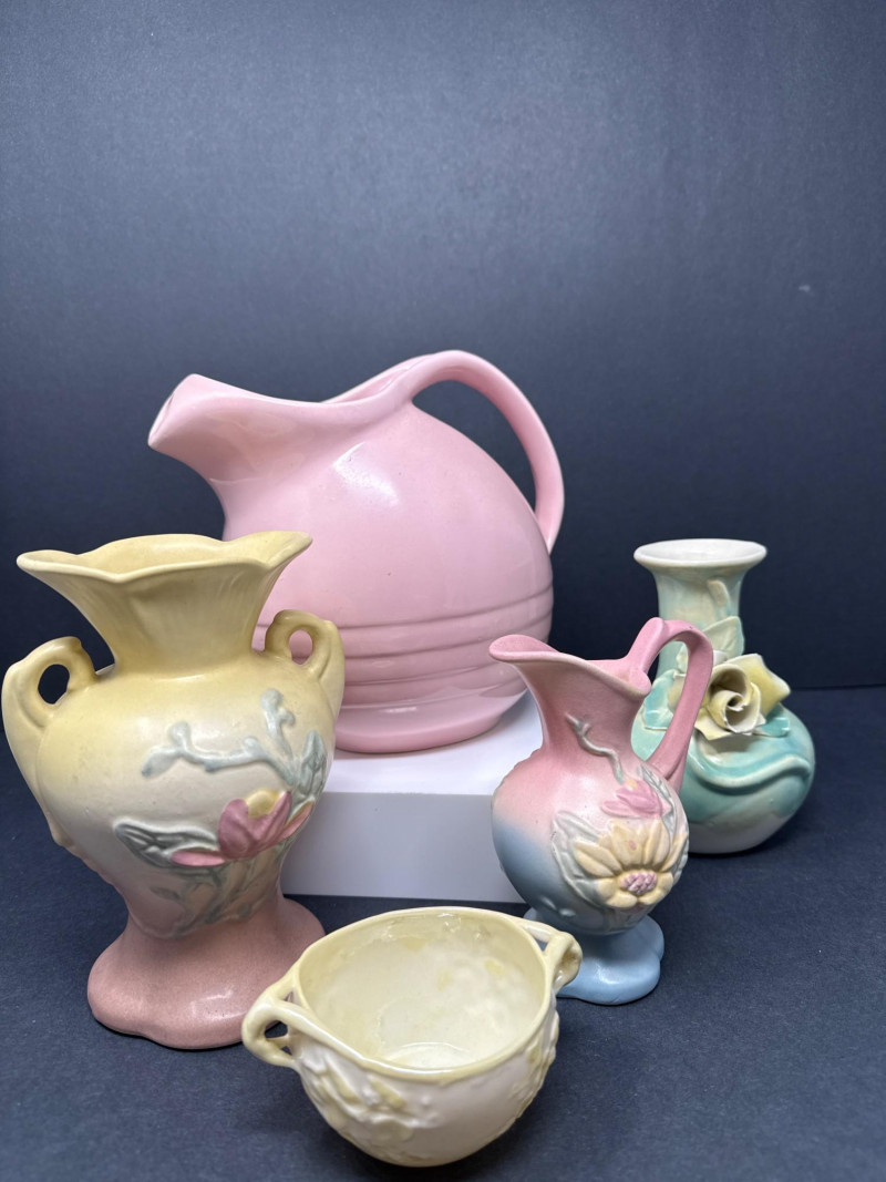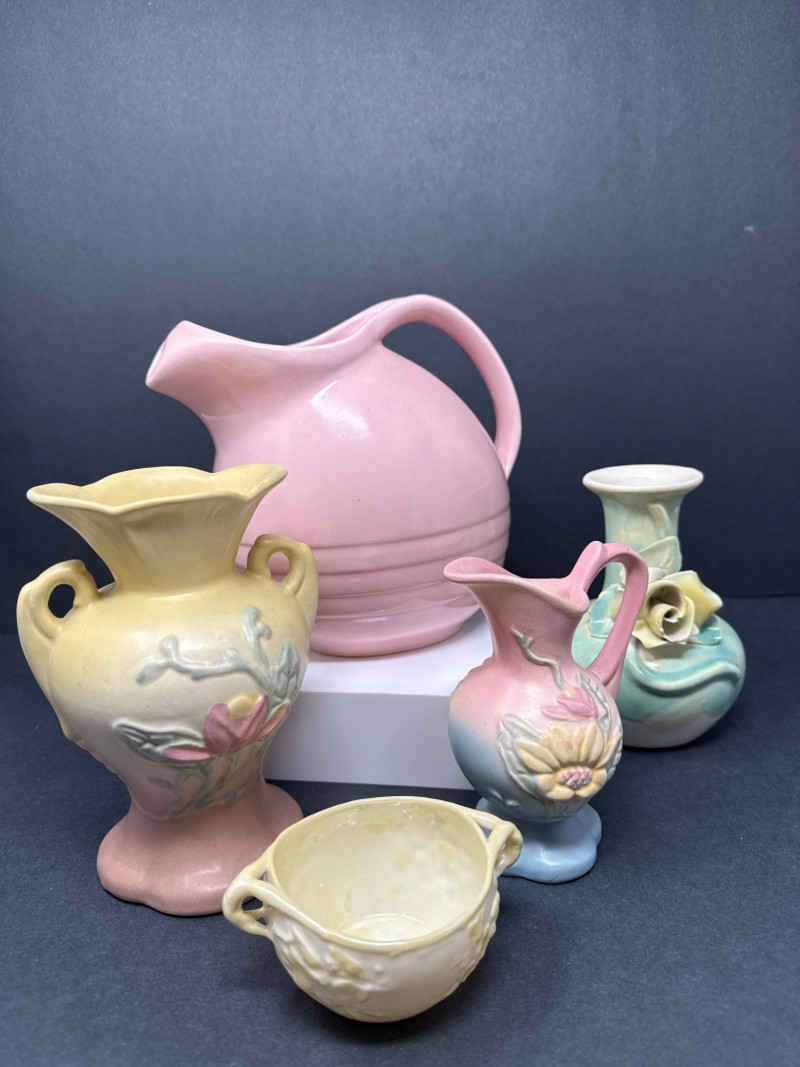 Lovely mixed lot of identified vintage ceramics including a pink Marcrest pitcher, two Hull Pottery vases, and an embossed Belleek Ireland lidded sugar bowl. The Marcrest pitcher features the classic mid‑century form and soft pink glaze. The Hull vases display the brand’s signature pastel tones and floral relief styling. The Belleek sugar bowl is finely crafted with embossed detailing and the characteristic creamy porcelain body. Pitcher- 7” T x 7.5 W smallest- 4 W x 2.35 T