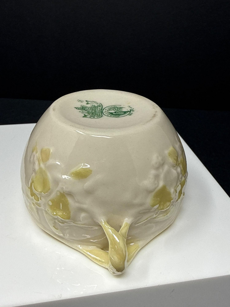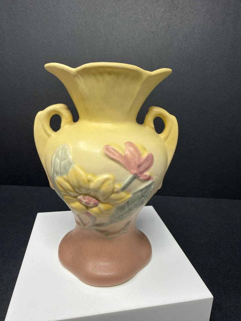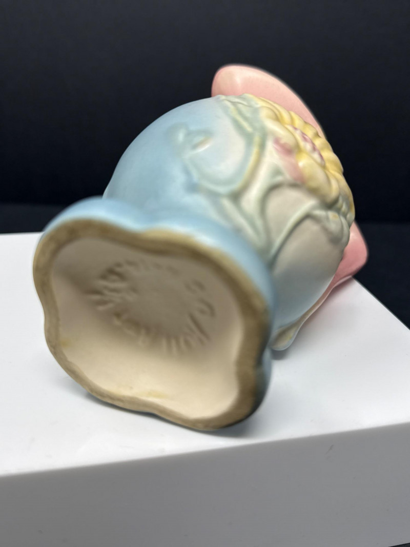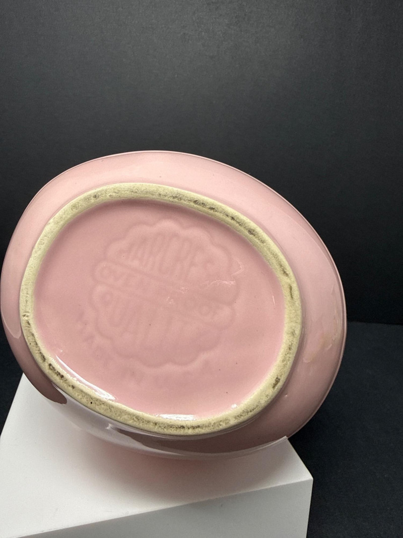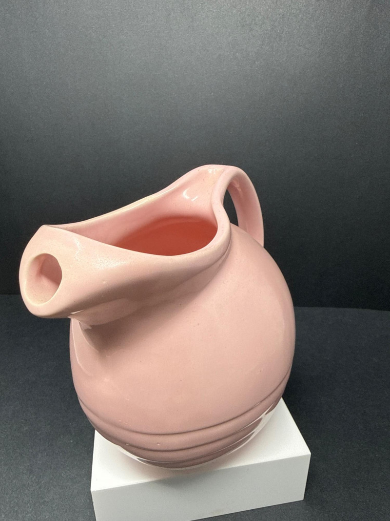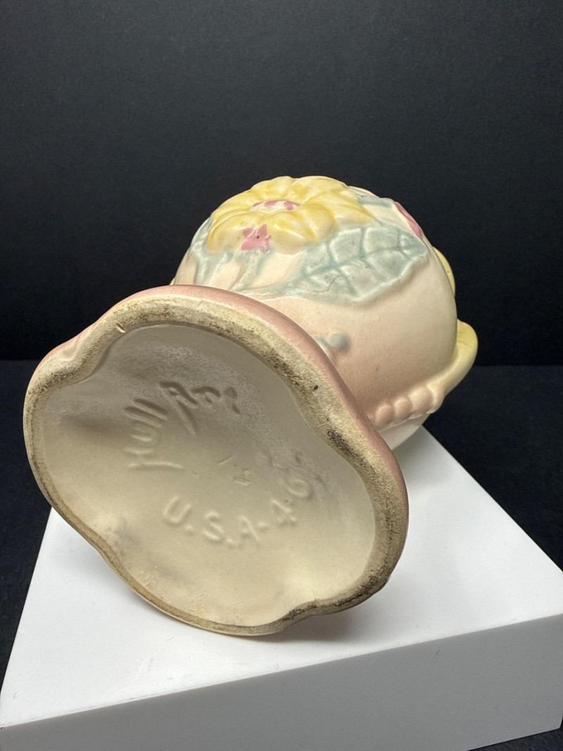 Lovely mixed lot of identified vintage ceramics including a pink Marcrest pitcher, two Hull Pottery vases, and an embossed Belleek Ireland lidded sugar bowl. The Marcrest pitcher features the classic mid‑century form and soft pink glaze. The Hull vases display the brand’s signature pastel tones and floral relief styling. The Belleek sugar bowl is finely crafted with embossed detailing and the characteristic creamy porcelain body. Pitcher- 7” T x 7.5 W smallest- 4 W x 2.35 T
