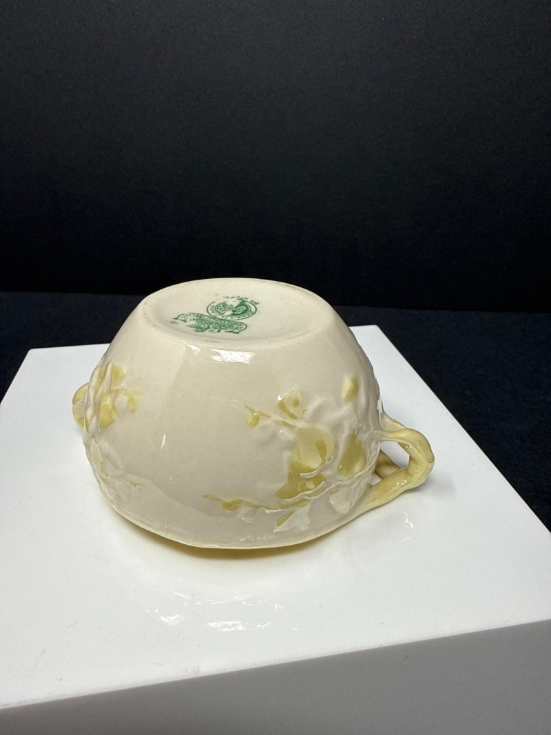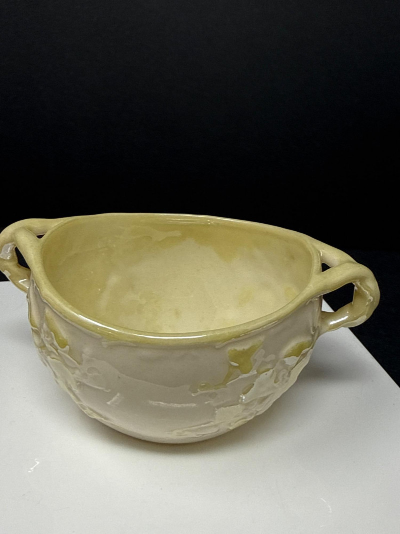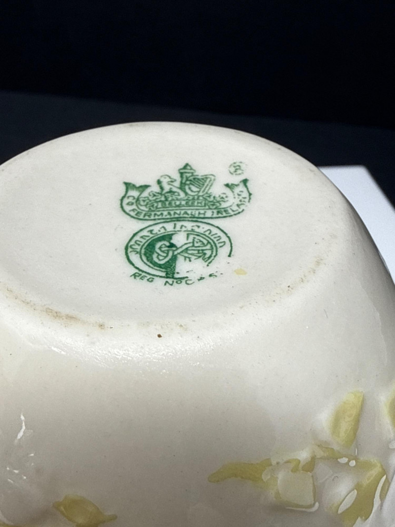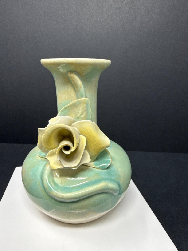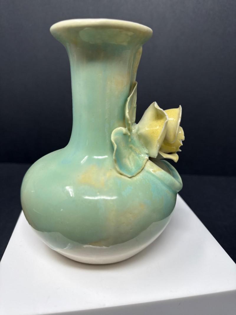 Lovely mixed lot of identified vintage ceramics including a pink Marcrest pitcher, two Hull Pottery vases, and an embossed Belleek Ireland lidded sugar bowl. The Marcrest pitcher features the classic mid‑century form and soft pink glaze. The Hull vases display the brand’s signature pastel tones and floral relief styling. The Belleek sugar bowl is finely crafted with embossed detailing and the characteristic creamy porcelain body. Pitcher- 7” T x 7.5 W smallest- 4 W x 2.35 T