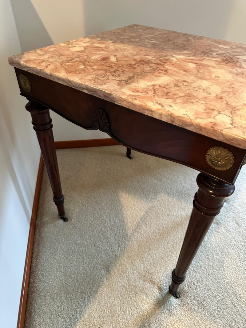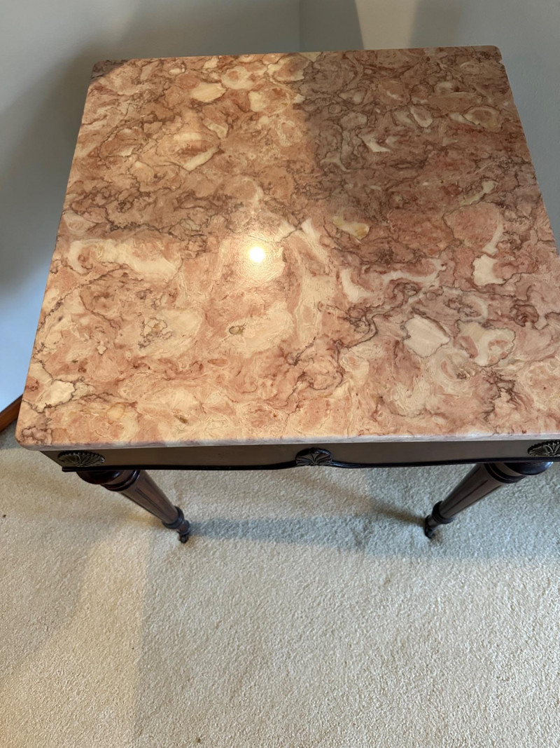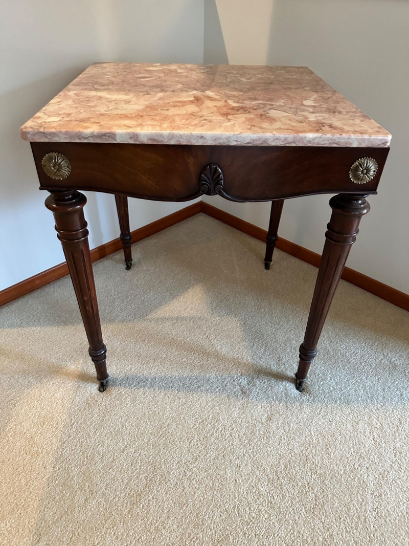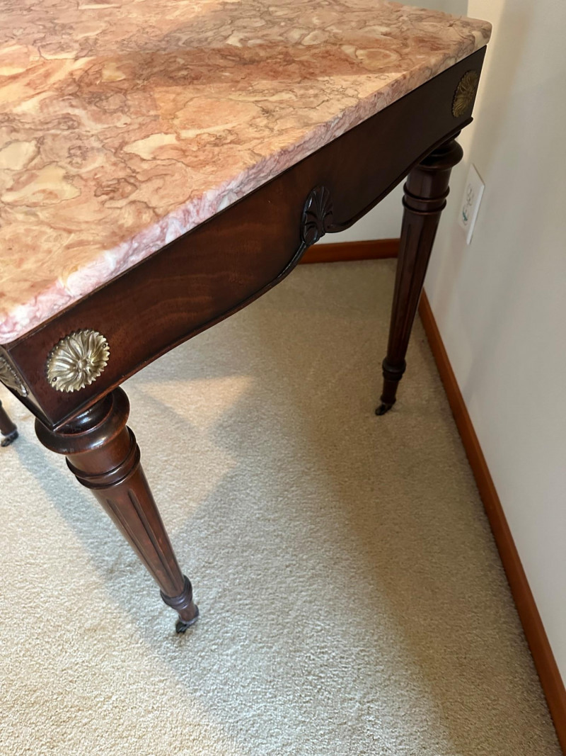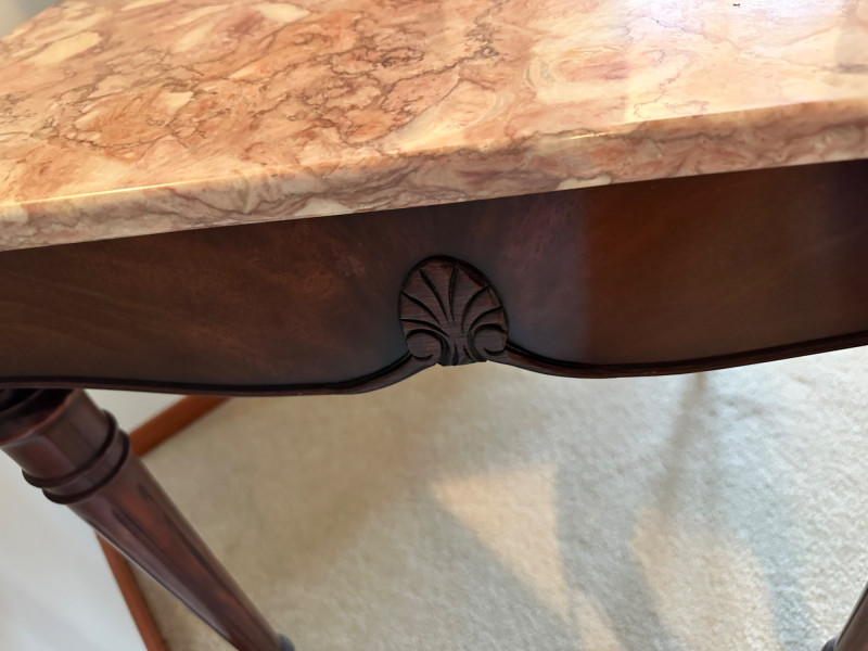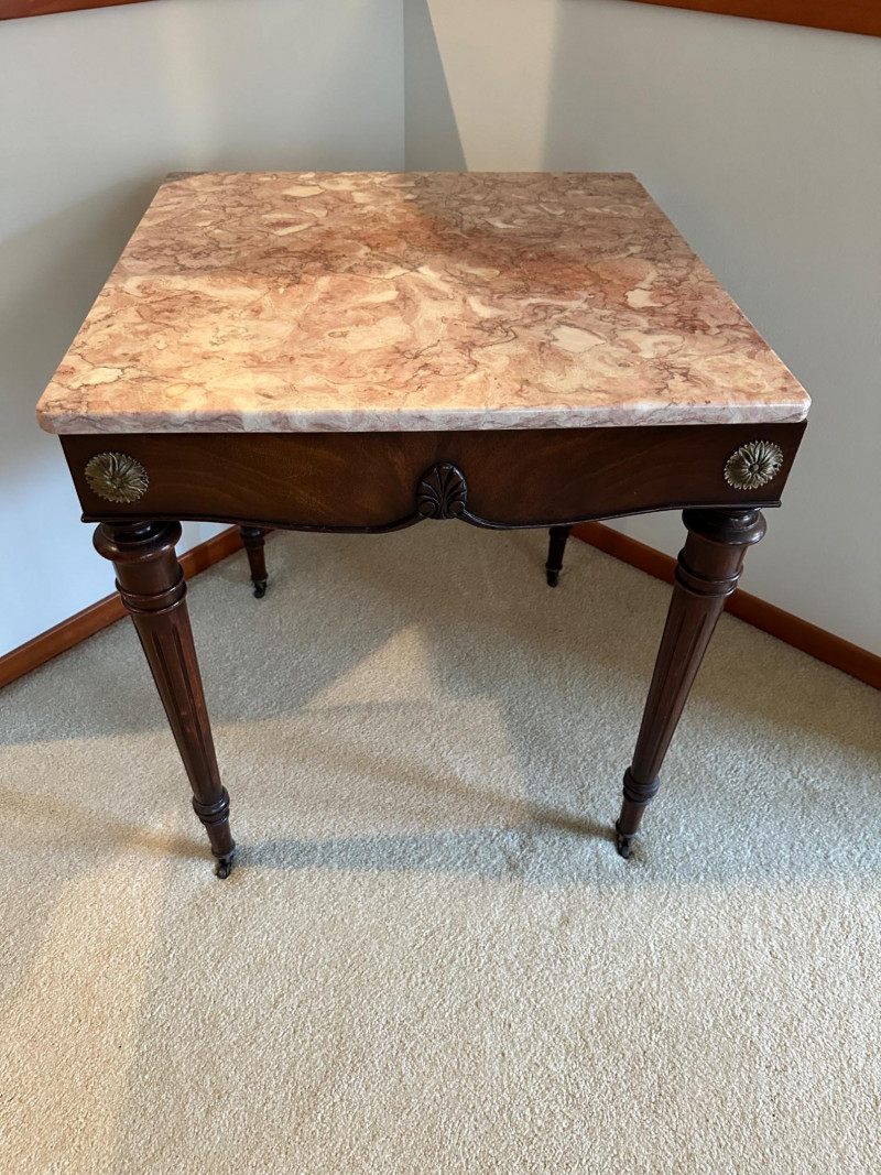 This is a beautifully crafted vintage marble‑top side table featuring a richly carved wooden base and classic Victorian‑inspired details. The table stands on four turned legs, each fitted with original casters, and is joined by a shaped lower stretcher for added stability. The apron is adorned with ornate carved motifs, including a central leaf design and two round floral medallions. The top is fitted with a polished pink marble slab showcasing natural veining that adds elegance and visual warmth. 24 x 24 x 27" Tall