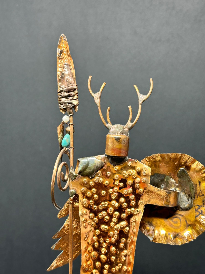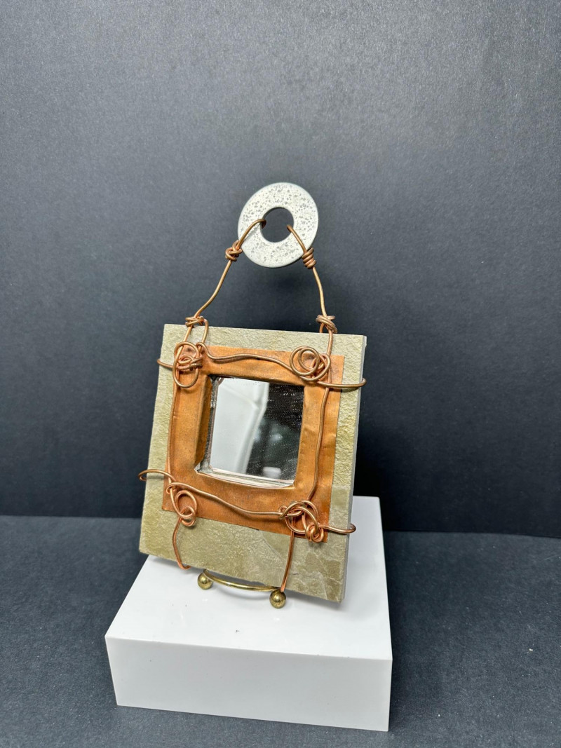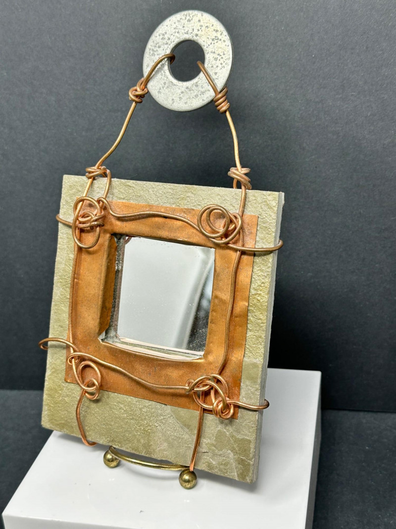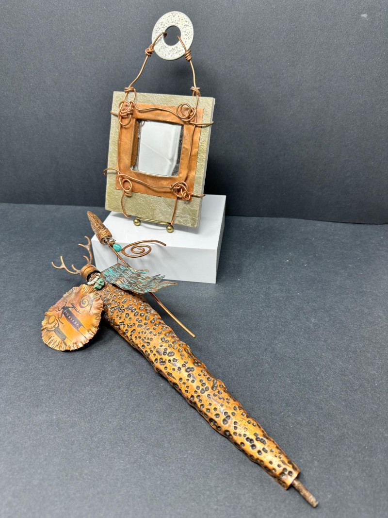 Lot includes two handcrafted mixed‑media pieces. The first is a wall‑hanging figure crafted with copper, patinated metal, and wire elements, designed in the form of a stylized warrior holding a shield and arrow. The second piece is a small wall mirror framed with textured material and wrapped copper wire detailing, suspended from a circular hanger. Mirror- 9.5 Tall to top of wire hanger x 5" W Warrior figure- 16" Tall x 5"W