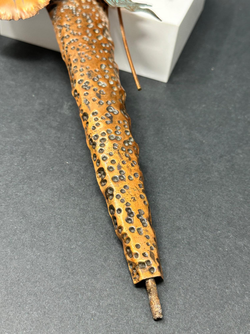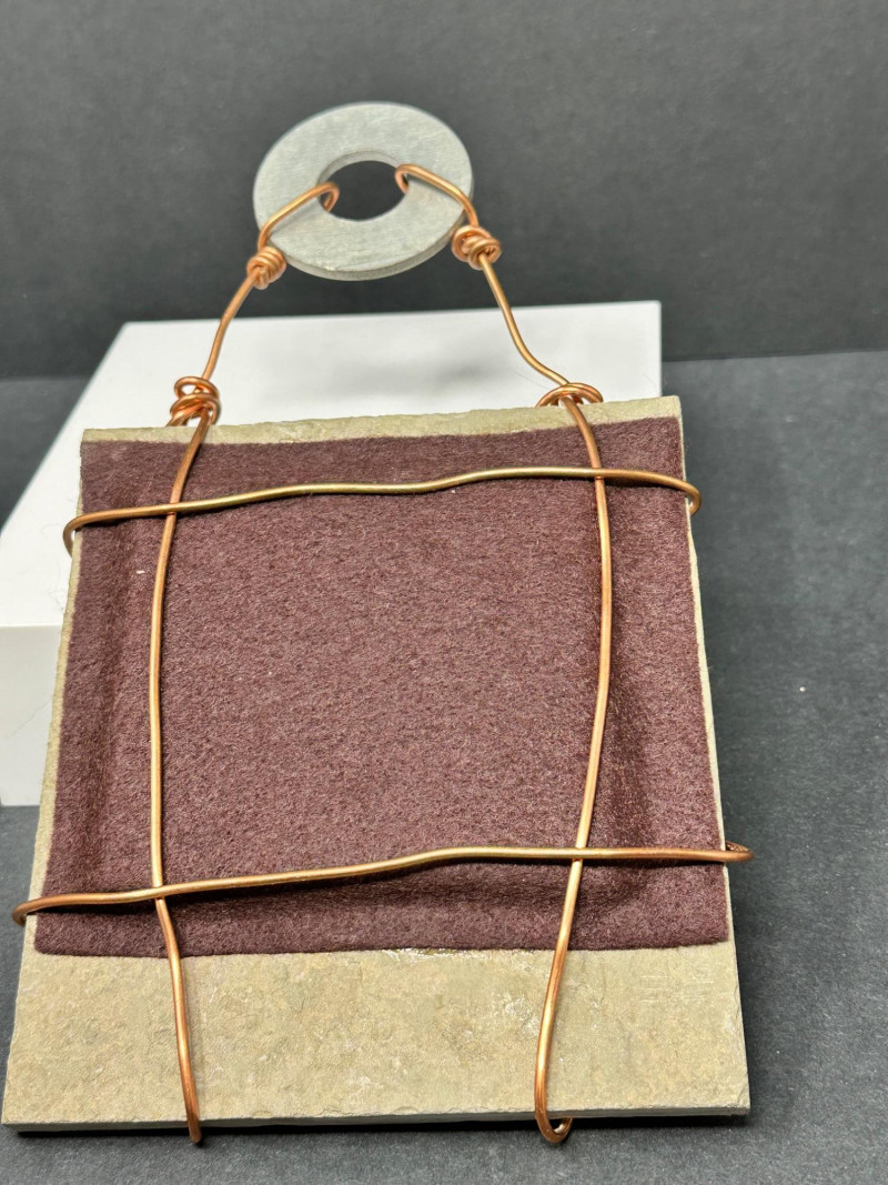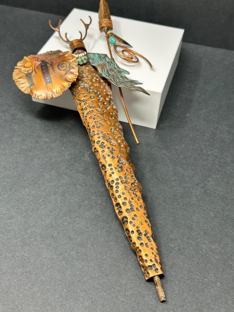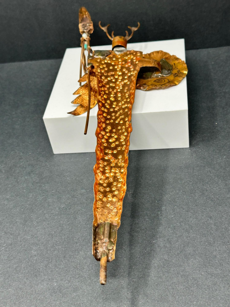 Lot includes two handcrafted mixed‑media pieces. The first is a wall‑hanging figure crafted with copper, patinated metal, and wire elements, designed in the form of a stylized warrior holding a shield and arrow. The second piece is a small wall mirror framed with textured material and wrapped copper wire detailing, suspended from a circular hanger. Mirror- 9.5 Tall to top of wire hanger x 5" W Warrior figure- 16" Tall x 5"W