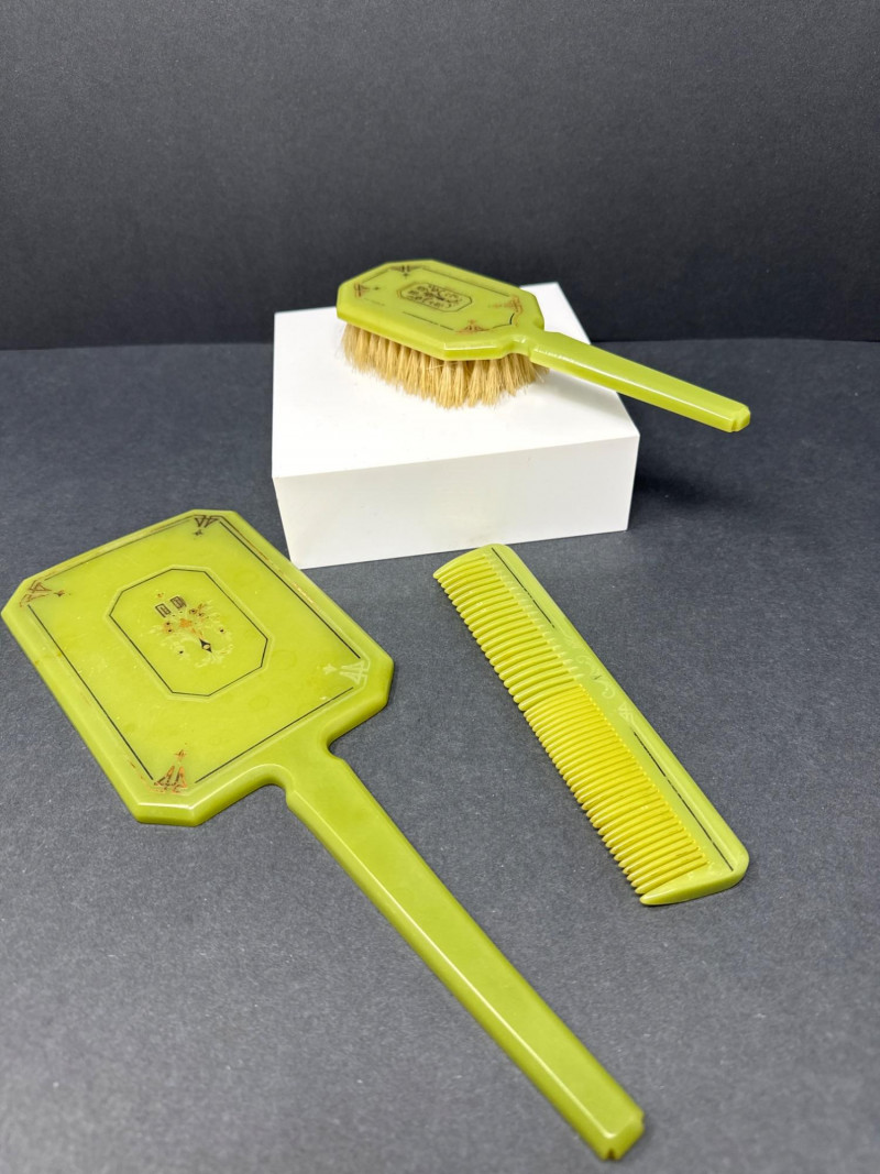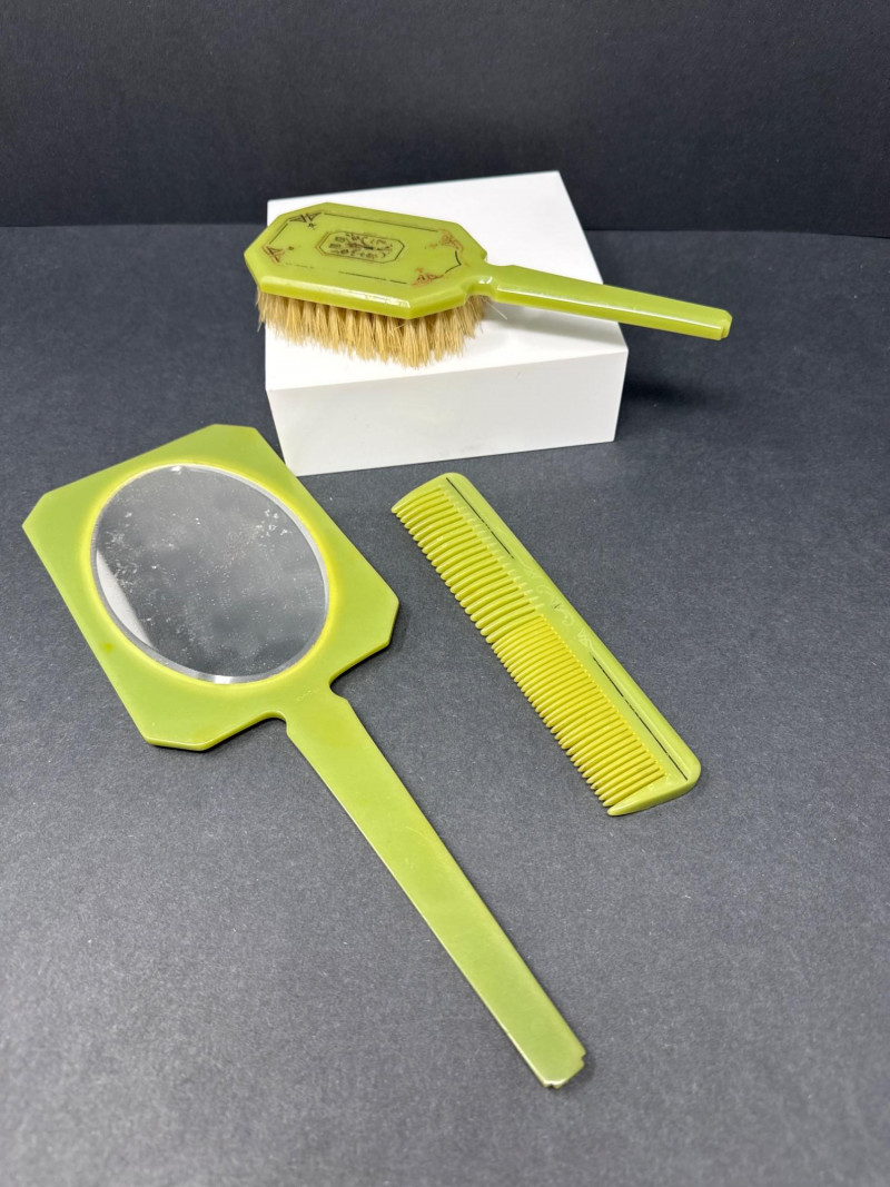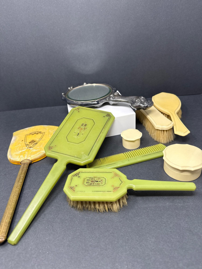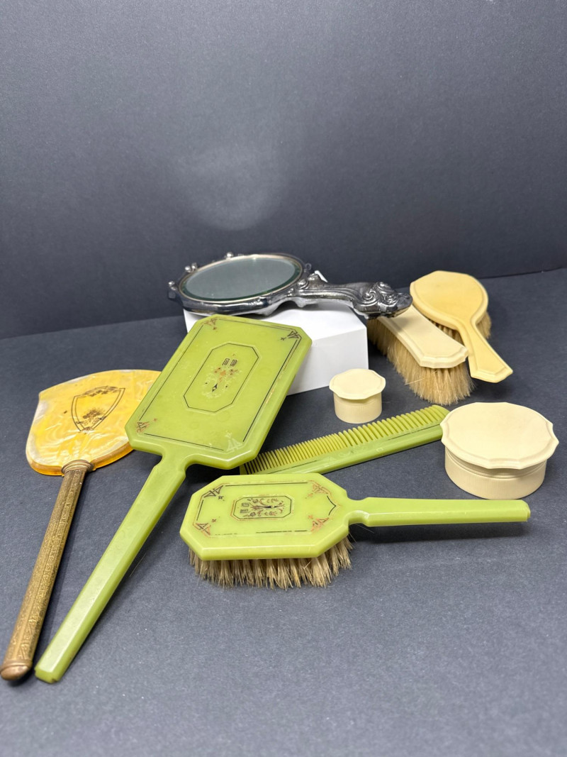 Charming early‑ to mid‑20th‑century celluloid vanity set including hand mirrors, brushes, a comb, and small toiletry jars in coordinated pastel tones. The pieces feature classic celluloid characteristics—lightweight construction, soft green and yellow coloring, molded handles, and natural bristle brushes. Also included is a decorative metal‑framed hand mirror. Largest piece measures 13" × 5", smallest 1.75" × 1".
