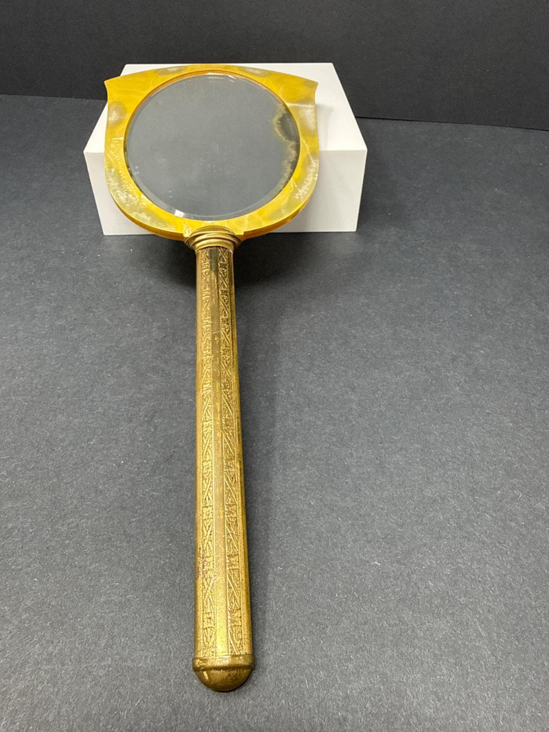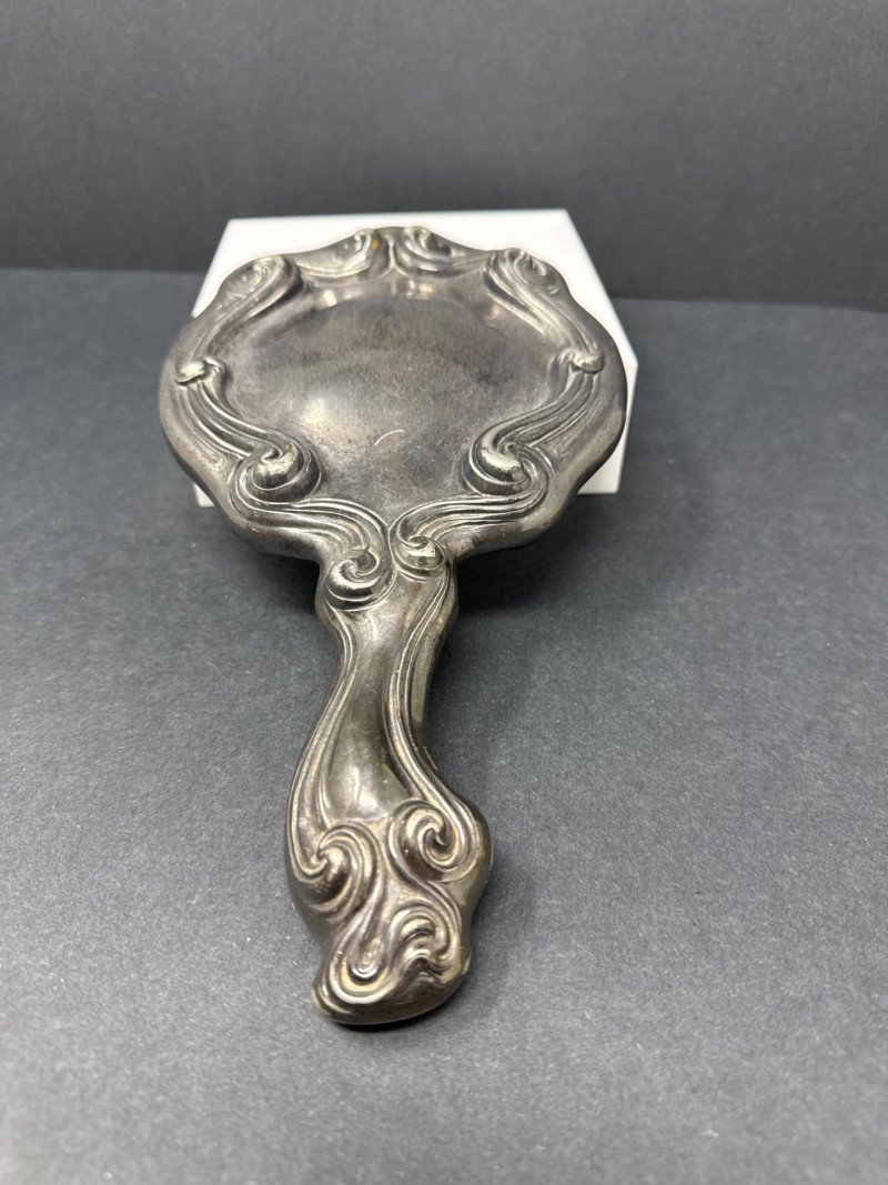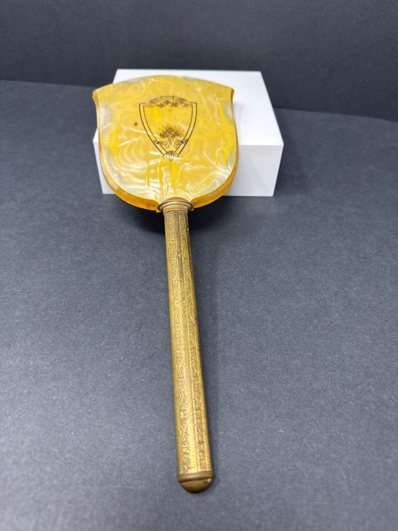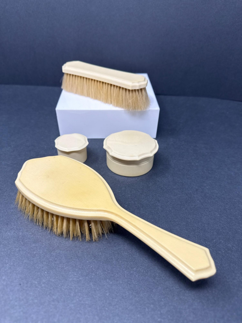 Charming early‑ to mid‑20th‑century celluloid vanity set including hand mirrors, brushes, a comb, and small toiletry jars in coordinated pastel tones. The pieces feature classic celluloid characteristics—lightweight construction, soft green and yellow coloring, molded handles, and natural bristle brushes. Also included is a decorative metal‑framed hand mirror. Largest piece measures 13" × 5", smallest 1.75" × 1".