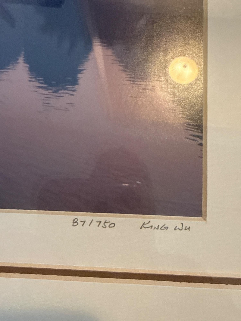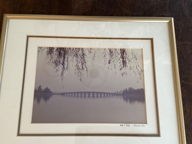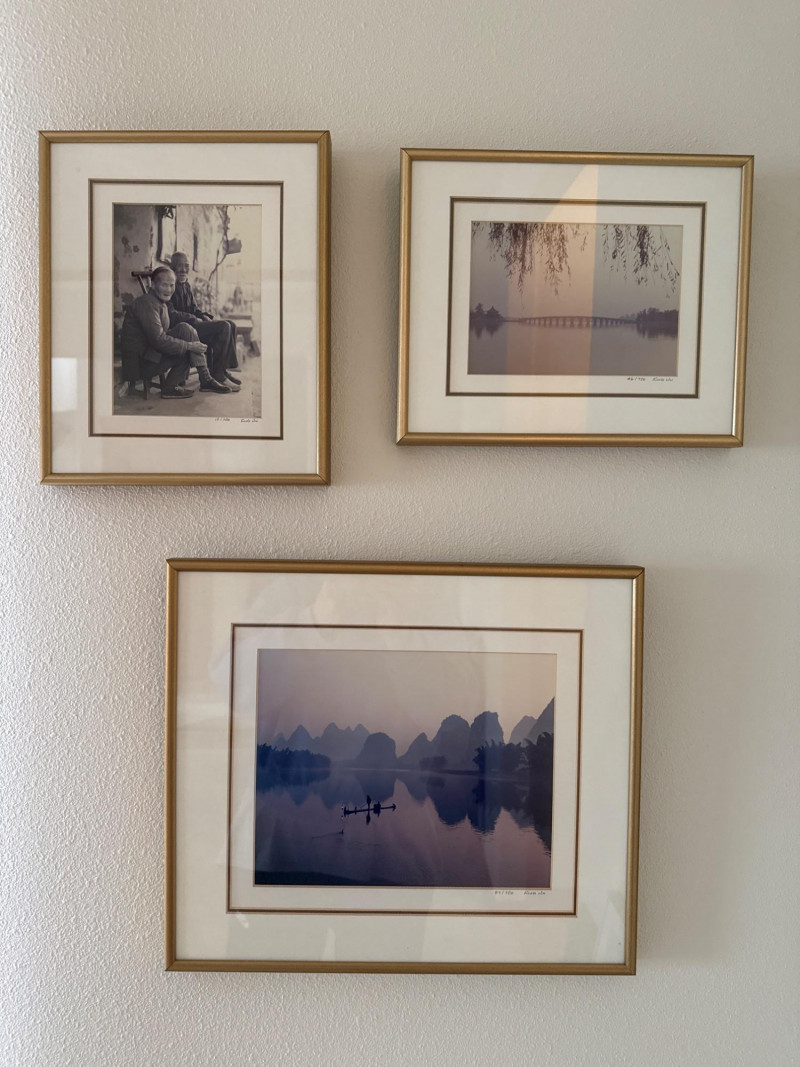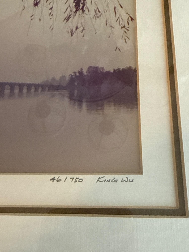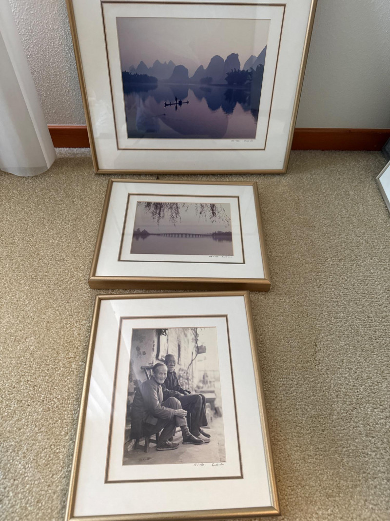 A beautifully coordinated trio of signed, limited‑edition photographs by artist King Wu, each professionally framed in gold-tone frames with white mats and thin inner borders. Black‑and‑white portrait of two elderly individuals seated together, numbered 8/100 Color landscape with bridge over water, numbered 46/100 Color lake scene with two figures in a small boat, numbered 87/100 Each piece reflects King Wu’s calm, contemplative style—balancing human connection, nature, and atmosphereIncluded Works