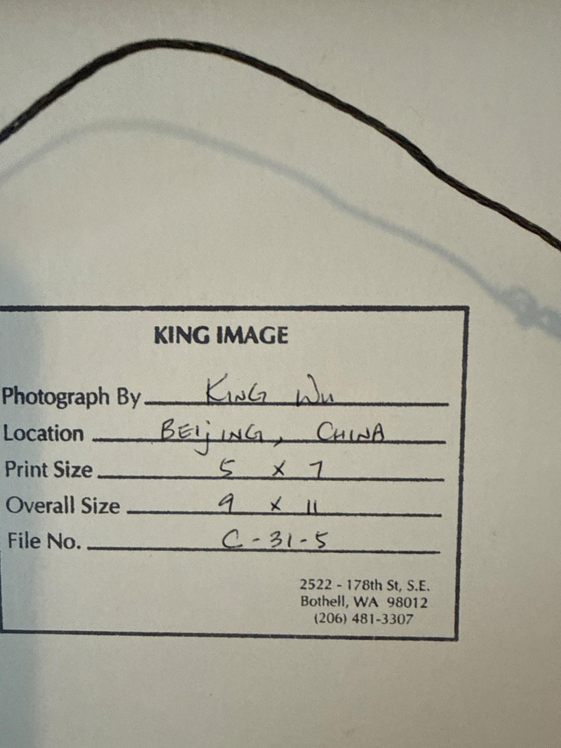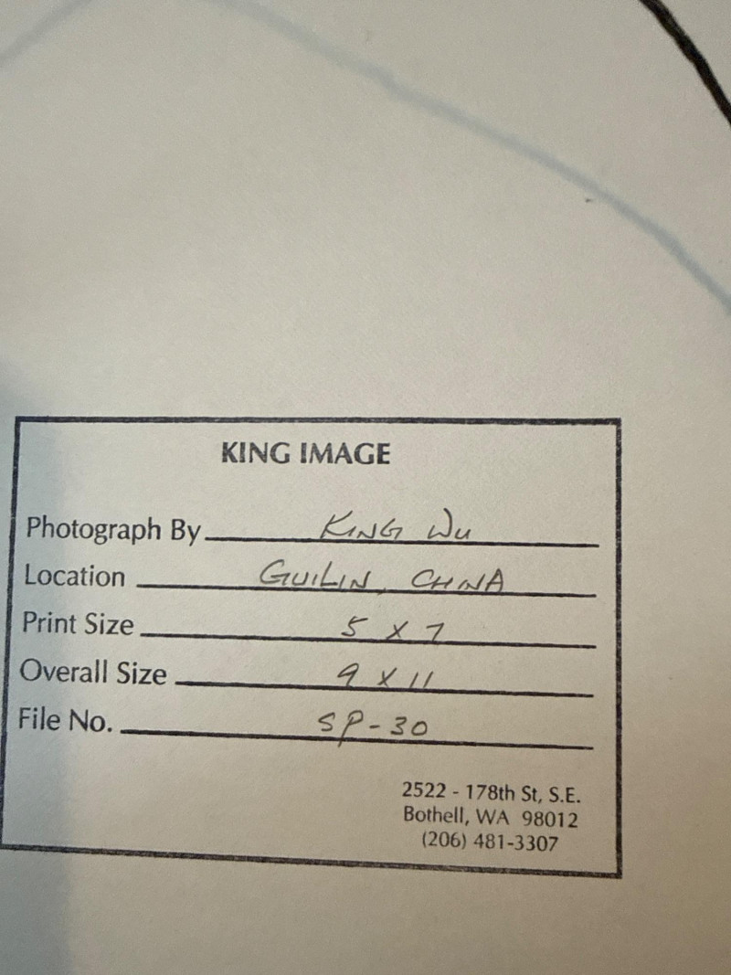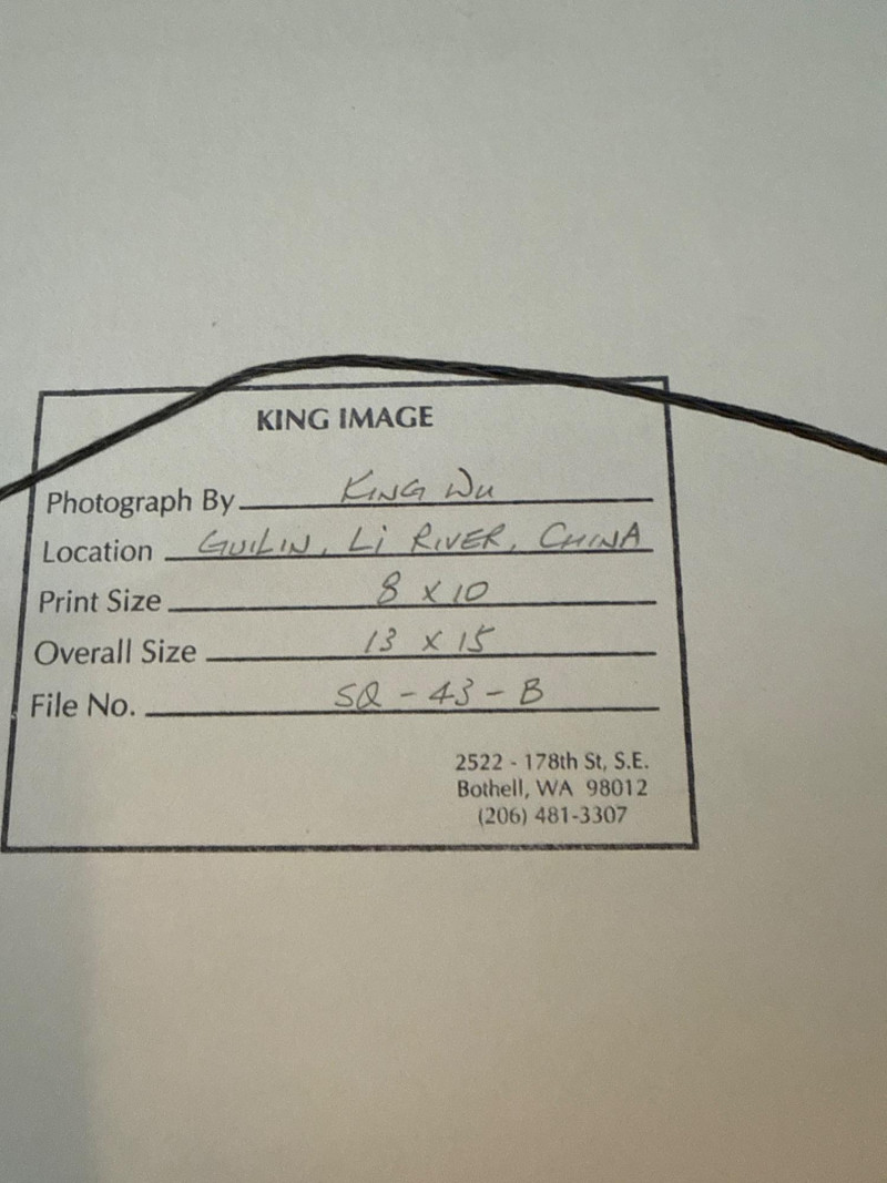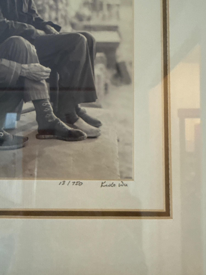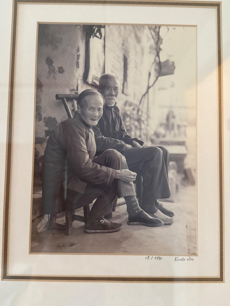 A beautifully coordinated trio of signed, limited‑edition photographs by artist King Wu, each professionally framed in gold-tone frames with white mats and thin inner borders. Black‑and‑white portrait of two elderly individuals seated together, numbered 8/100 Color landscape with bridge over water, numbered 46/100 Color lake scene with two figures in a small boat, numbered 87/100 Each piece reflects King Wu’s calm, contemplative style—balancing human connection, nature, and atmosphereIncluded Works