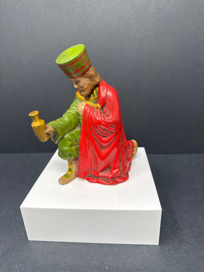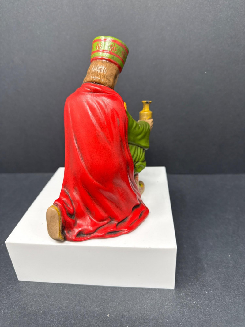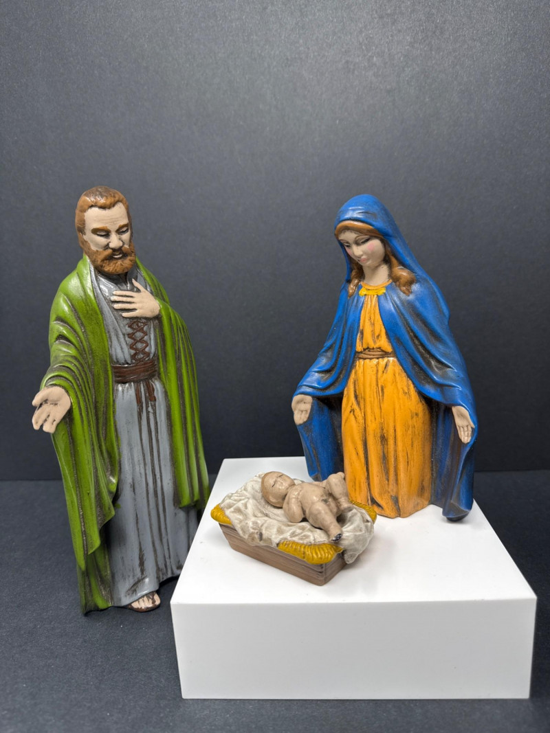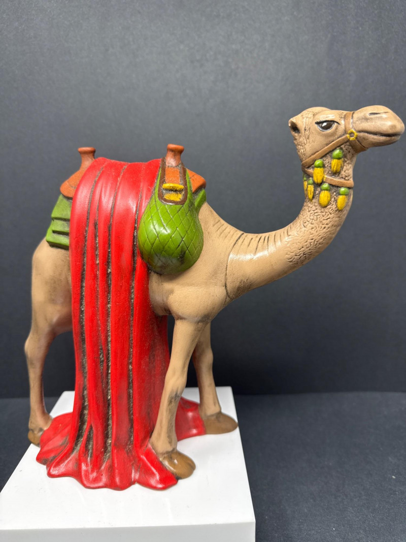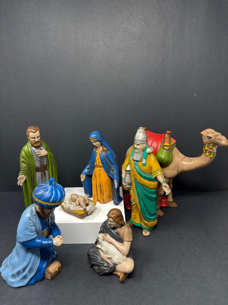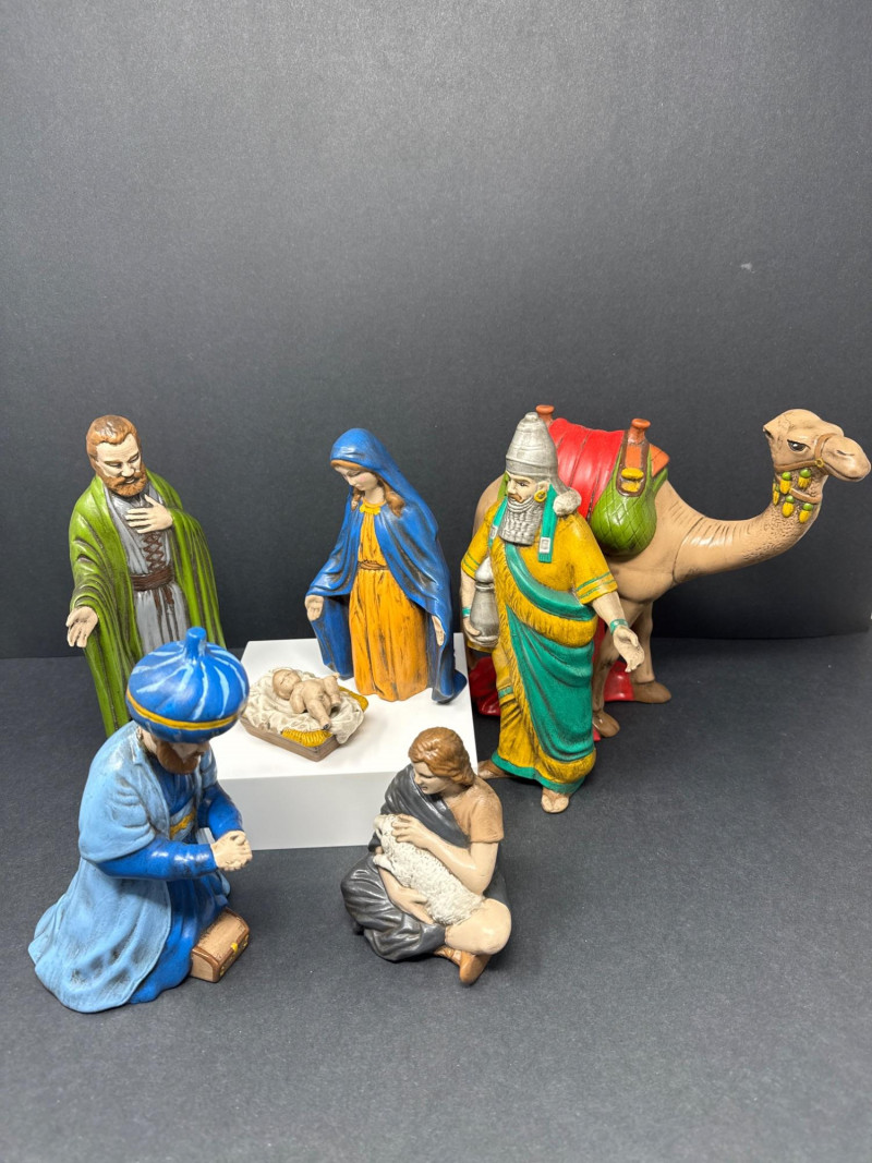 Vintage ceramic nativity set including baby in manger, Mary, Joseph, three wise men, a shepherd with sheep, and a camel figure. Each piece is hand‑painted in traditional colors and displayed as a complete grouping.