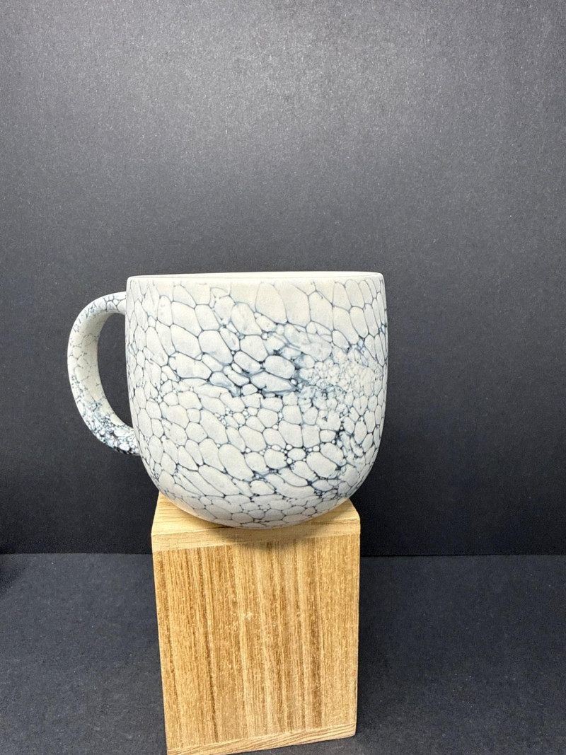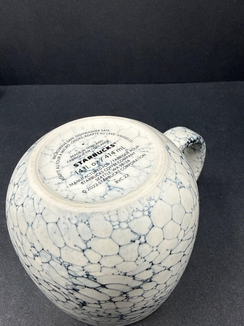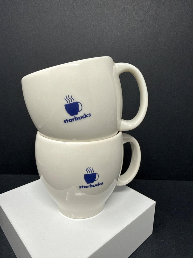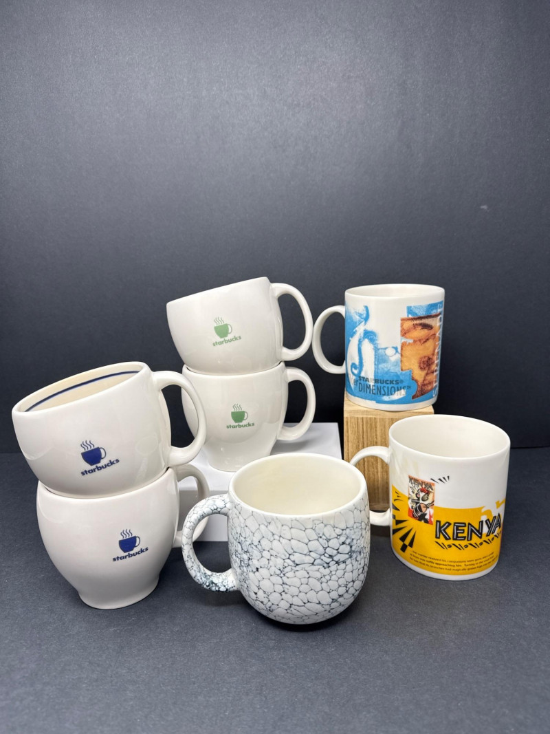 (Each in the classic tall cylindrical form) Starbucks Dimensions mug with blue and orange geometric design Crackle‑finish mug in white and black Starbucks “Kenya” mug featuring bold lettering and a lion graphicLogo Mugs