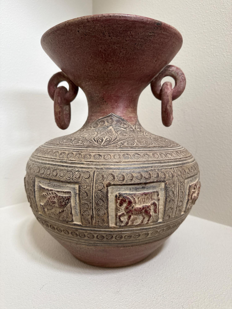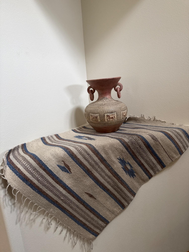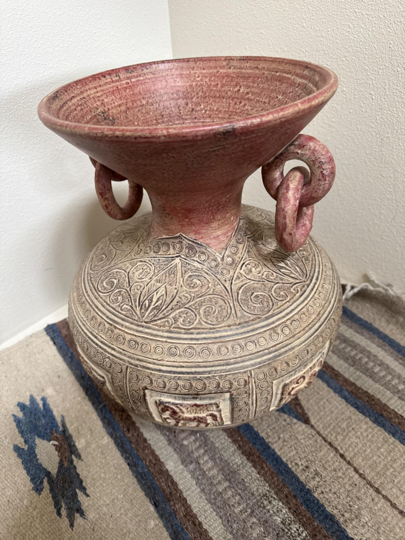 A decorative carved ceramic vessel featuring deep relief panels of stylized animals—horses and lions—set within framed sections around the body. The upper portion is adorned with swirling foliate patterns, and two large looped handles rise from the neck, giving the piece a bold sculptural presence. The wide flared mouth completes the form, making it an eye‑catching display piece. Approx. Size: 14.5" T × 11.5" W A compact woven rug in warm, earthy tones—ideal as an entry mat, under a plant stand, or layered in a vignette. Approx. Size:40" × 31" Carved Ceramic Jug / Vase