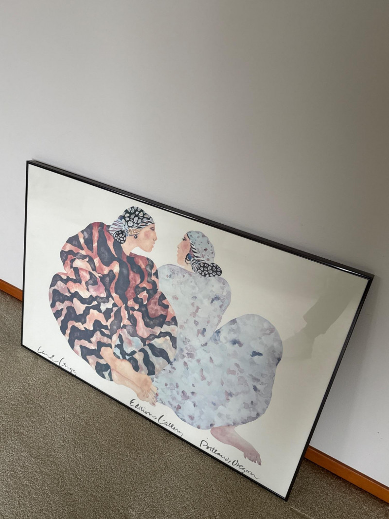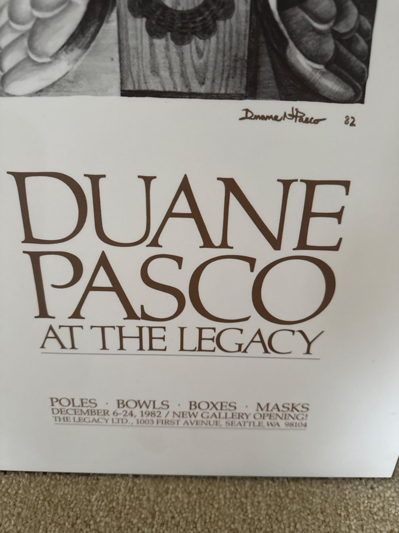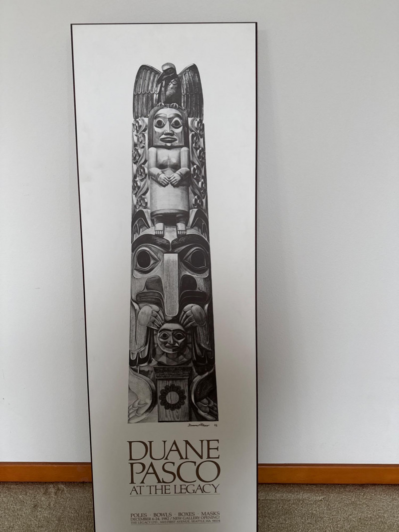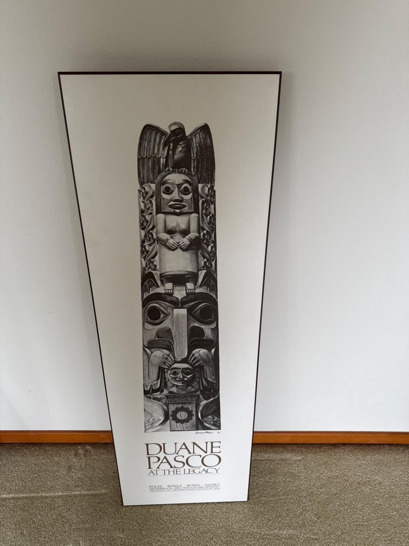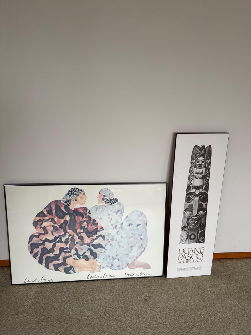 Pair of framed art prints. The first is a Carol Grigg print featuring two stylized figures in patterned robes, marked with the Editions Gallery, Portland, Oregon. The second is a Duane Pasco exhibition poster depicting a carved totem pole, originally produced for “The Legacy” at Seattle Center in 1989.