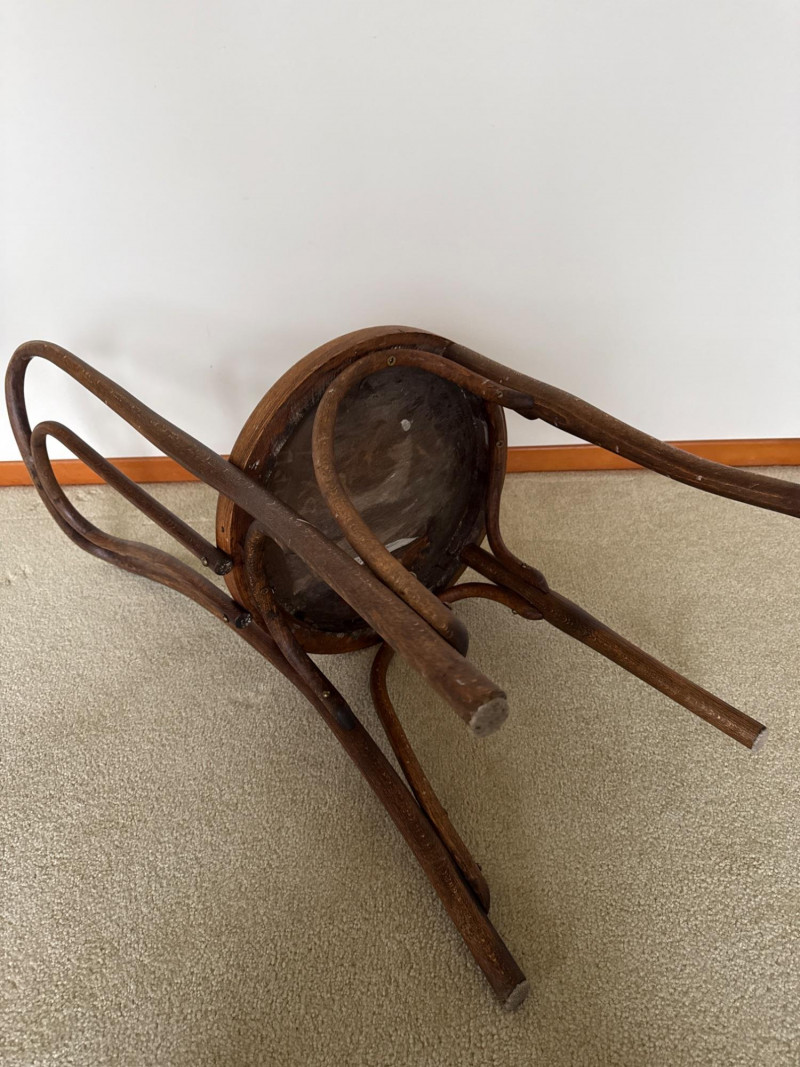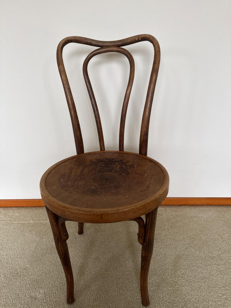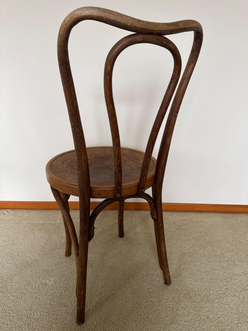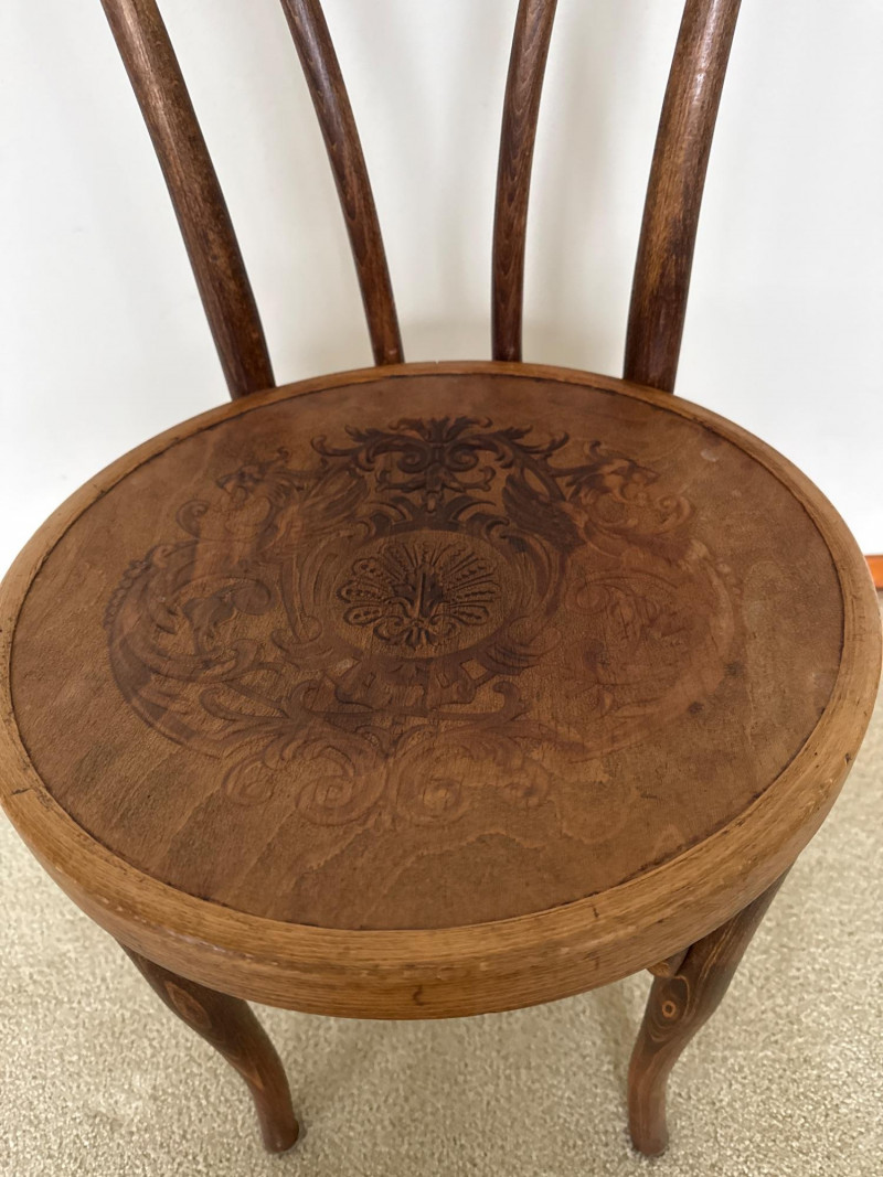 A classic vintage bentwood chair featuring an elegant curved backrest and a round carved seat. The seat shows light indentations consistent with age and use.