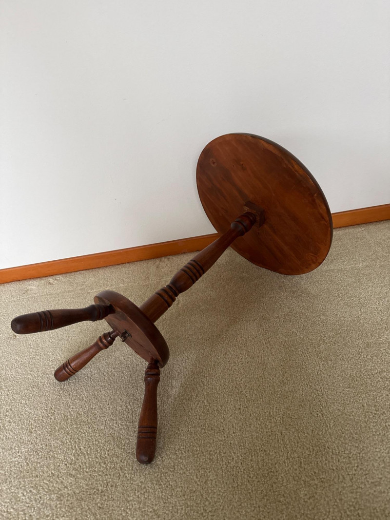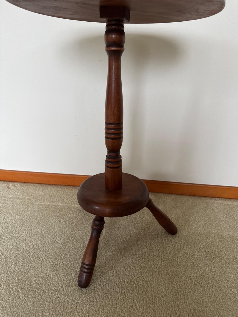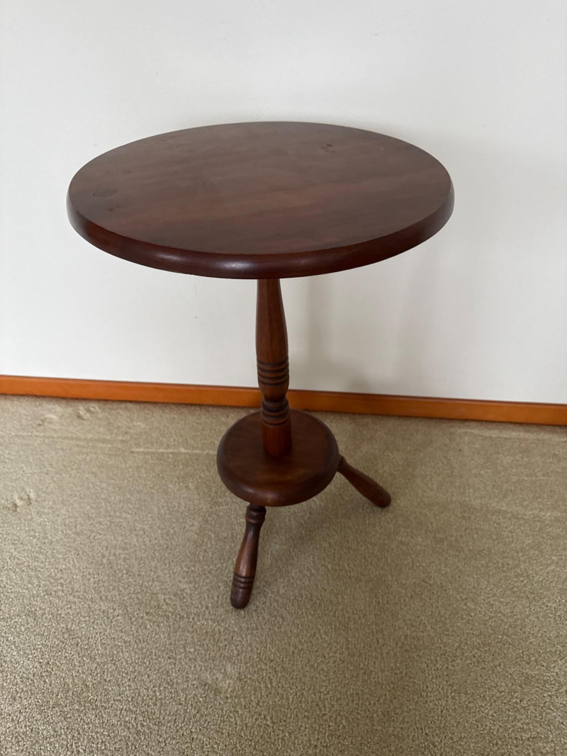 Approx. Size: 16" W × 35" T A small wooden pedestal side table with a round top and three curved legs—simple, traditional, and well‑proportioned for an entryway, reading nook, or accent vignette.