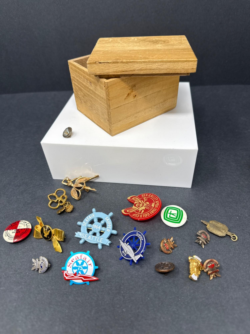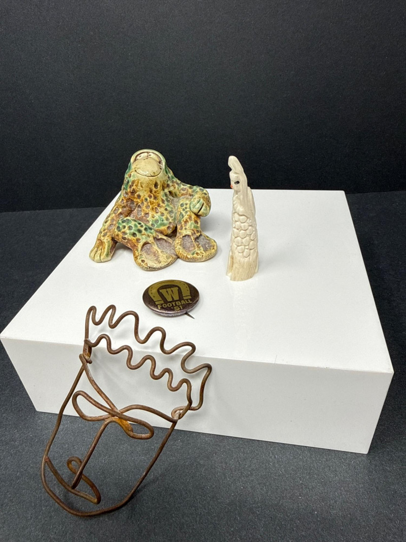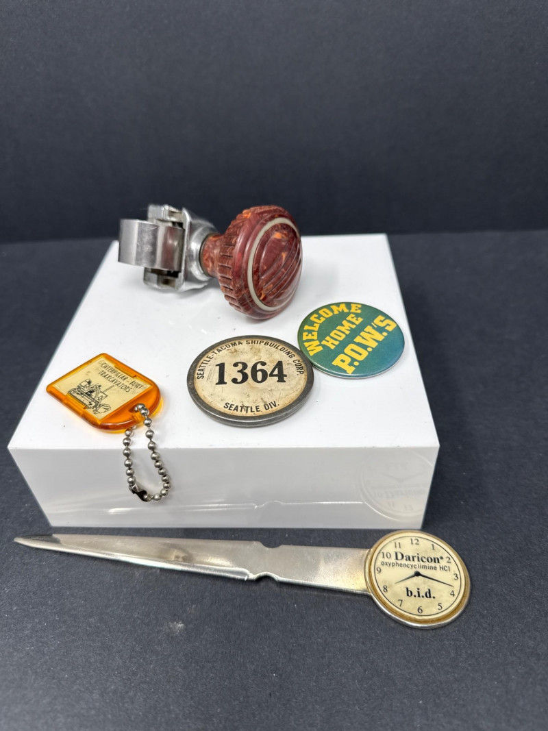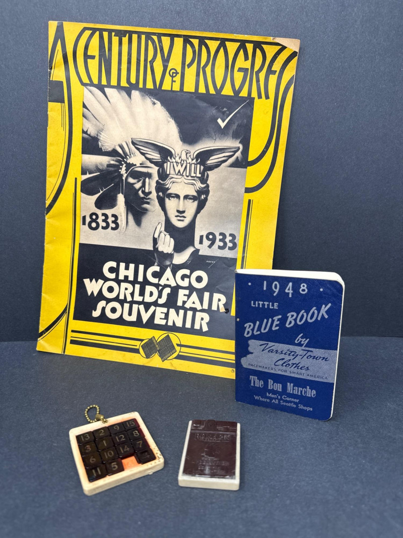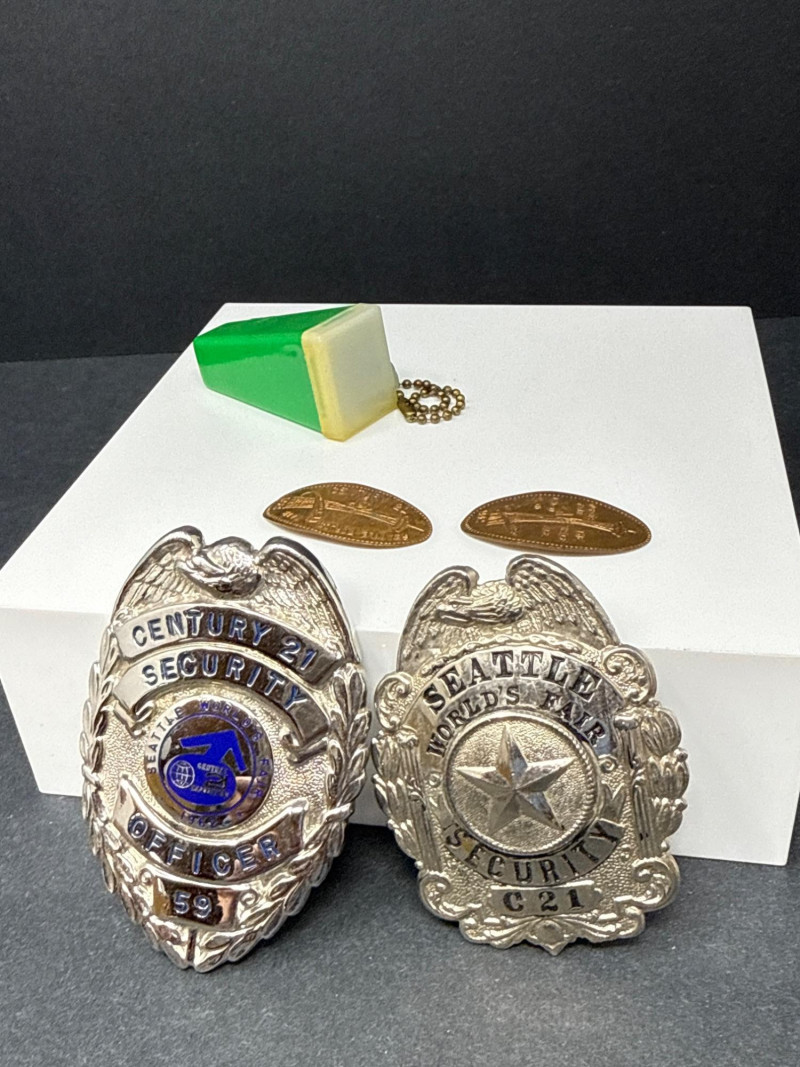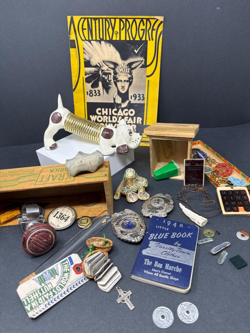 1933 Chicago World’s Fair “A Century of Progress” souvenir booklet Record‑holder spring‑body dog figurine (classic novelty collectible) Vintage “Play Police” badges Assorted vintage pins & novelty trinketsKey Items