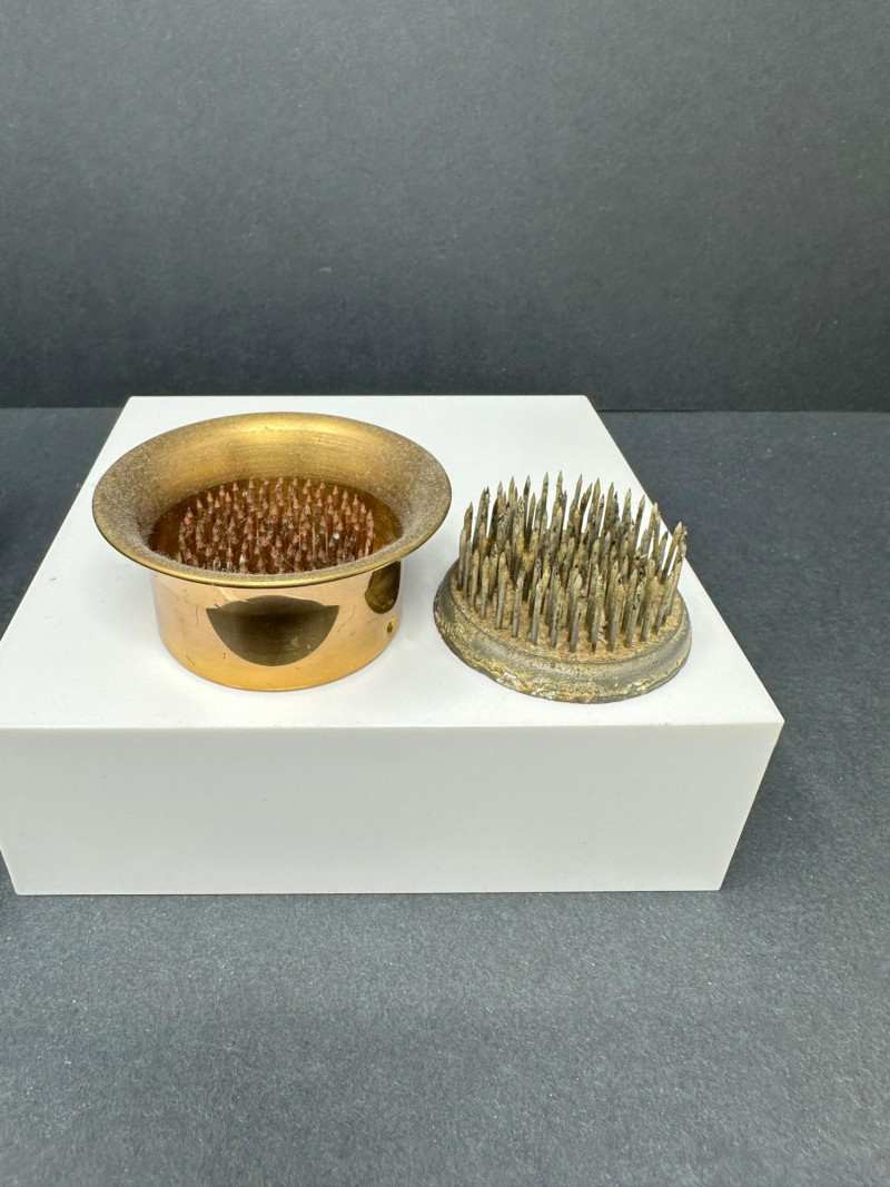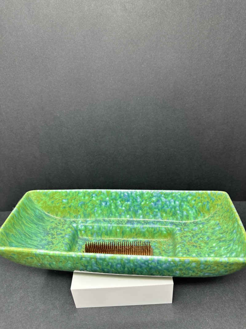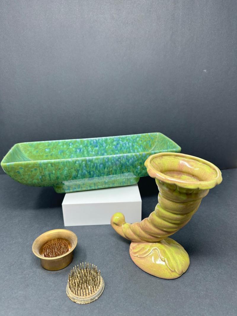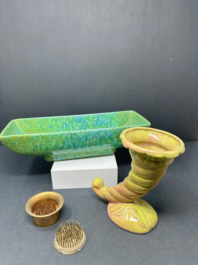 Lot includes a rectangular ceramic vase with blue‑green glaze, a vintage cornucopia‑style ceramic vase with pastel yellow and pink tones, and two metal flower frogs—one cup‑style and one flat pin‑type. Pot Measures- 13.5 L x 5 W Vase measures-6.5 T