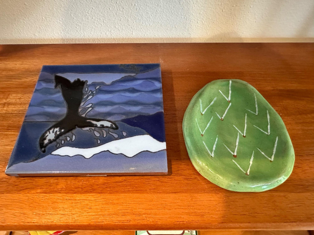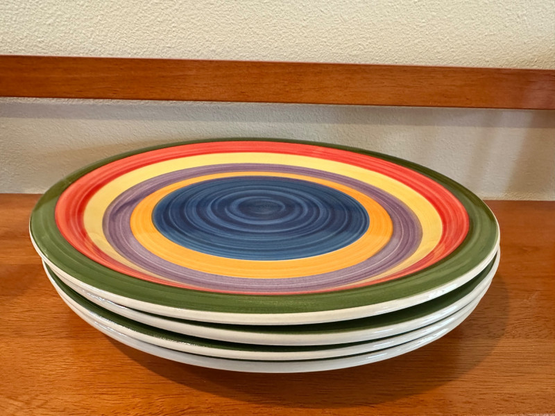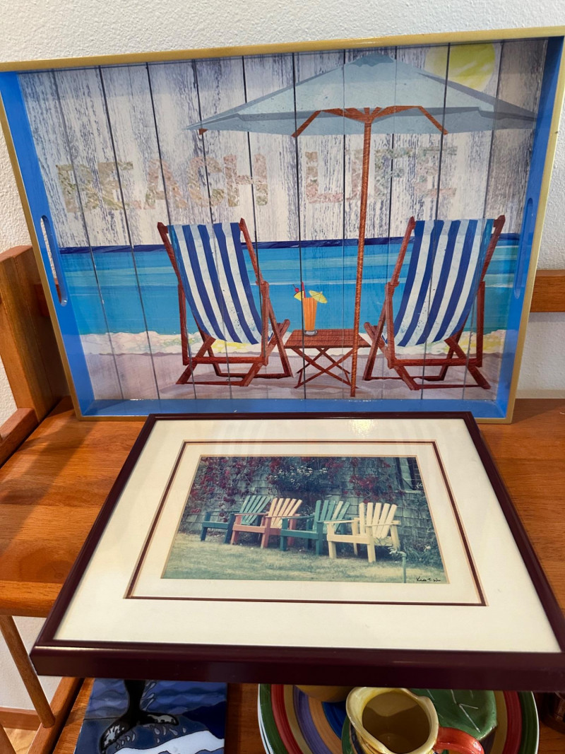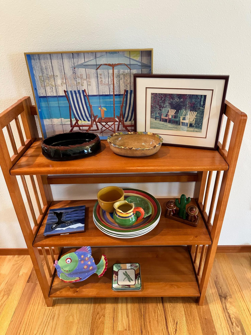 A cheerful, eclectic grouping of summer‑inspired décor and colorful ceramics displayed on a three‑tier wooden shelf. Includes: Two pieces of wall and tabletop art: Beach‑themed serving tray featuring two striped deck chairs beneath a sun umbrella Framed garden print with three brightly colored Adirondack chairs Ceramic bowls: One glossy black bowl and one tan bowl with a decorative rim. Middle‑shelf ceramics: Stack of multicolored plates Green ceramic pitcher Yellow cup Small green leaf‑shaped dish Square ceramic tile with a whale motif Ceramic cactus salt & pepper shakers Bottom‑shelf accents: Brightly colored ceramic fish sculpture Square ceramic tile with a dragonfly design