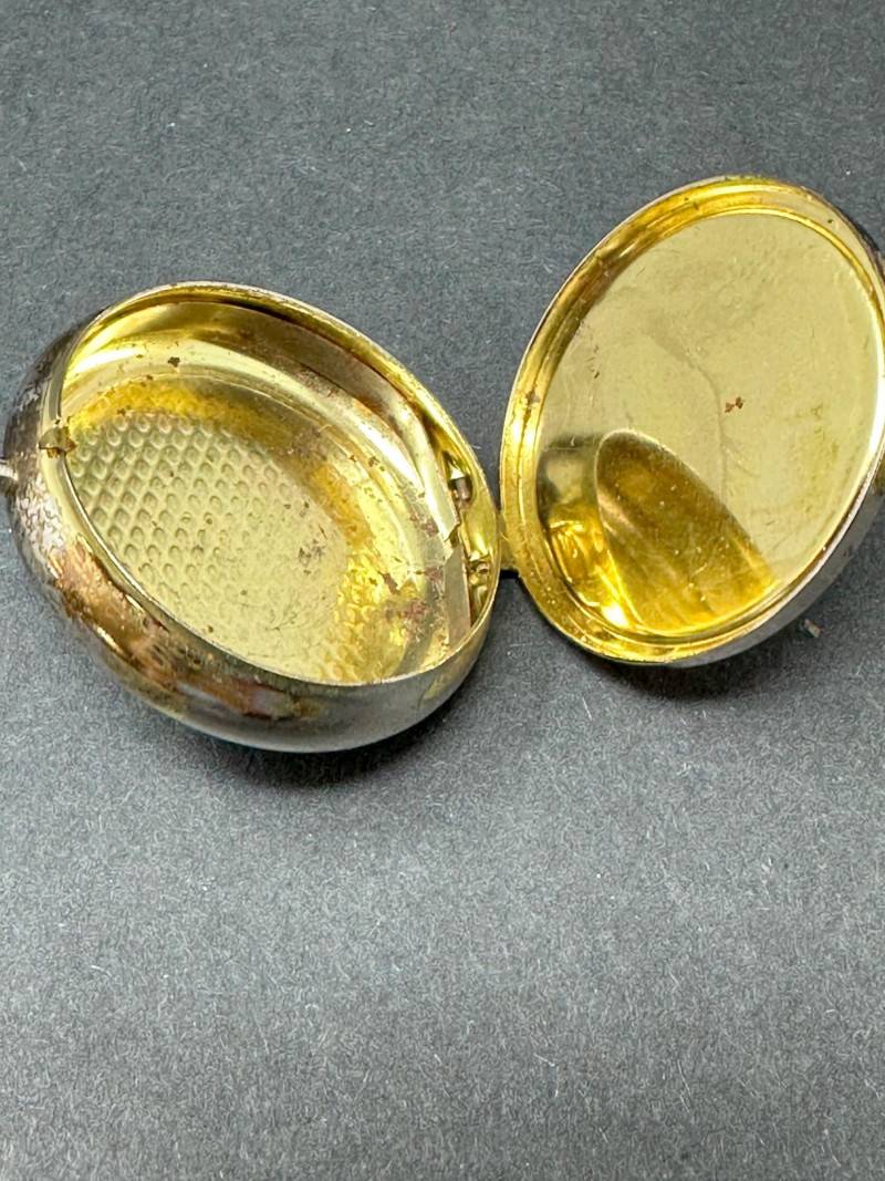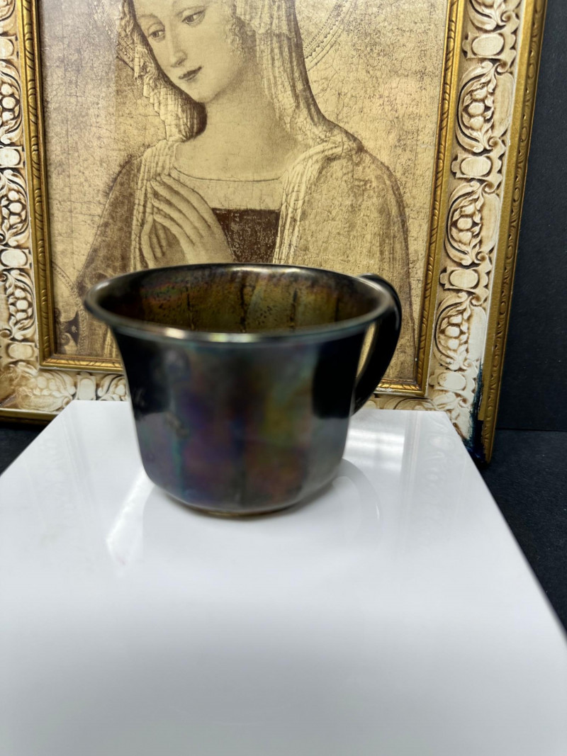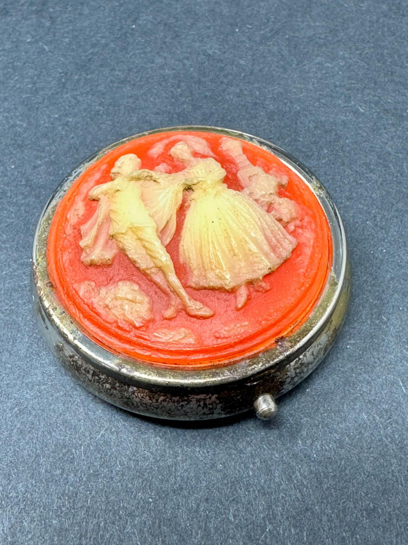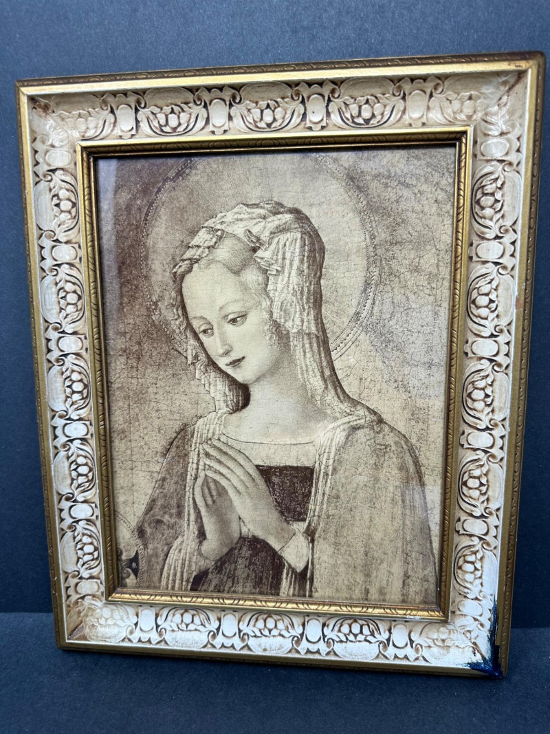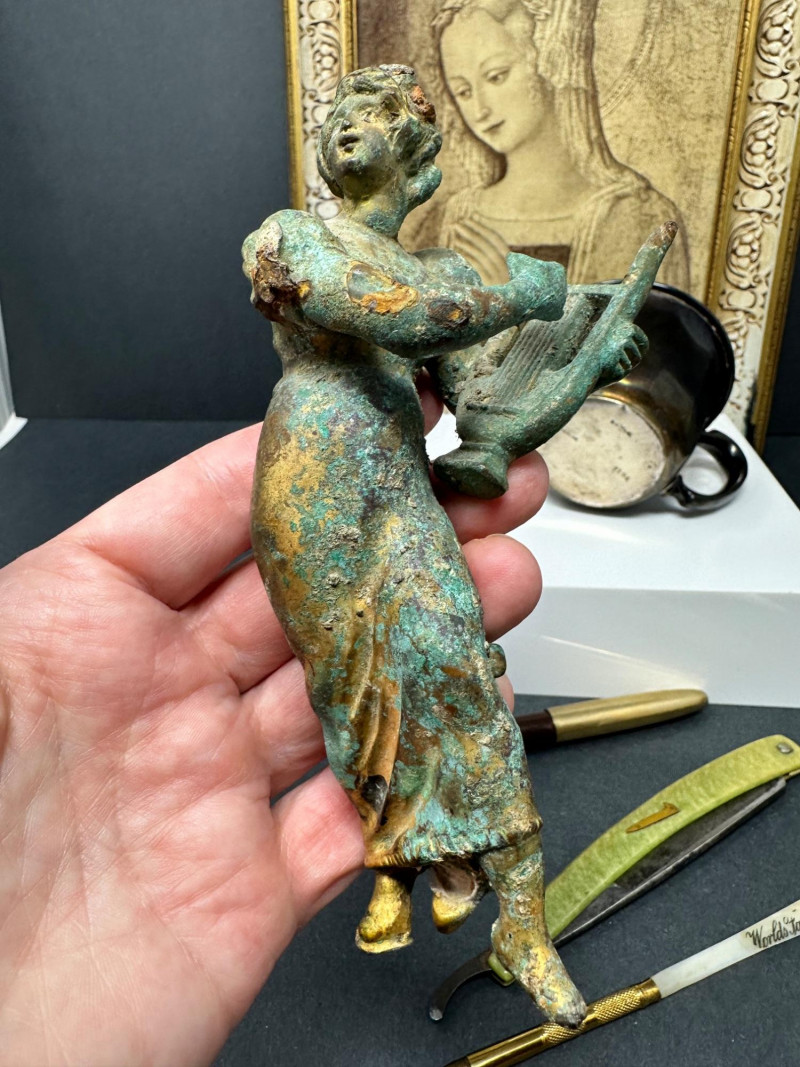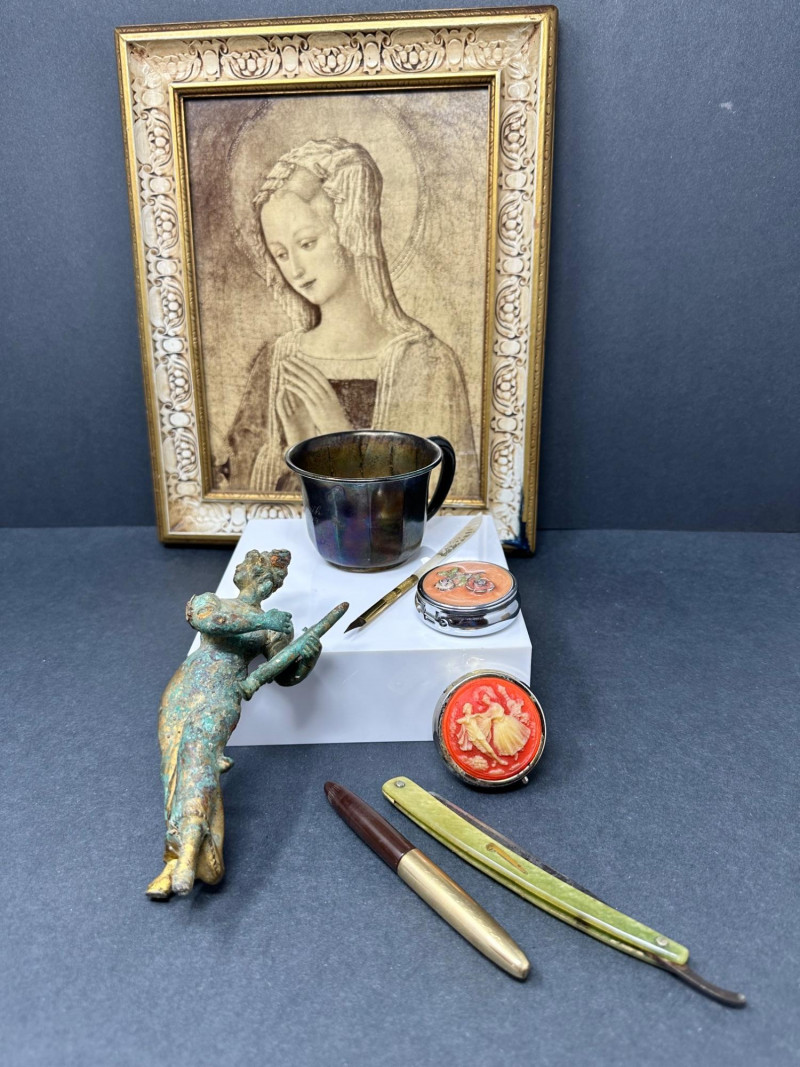 Eclectic grouping of vintage personal and desk items, including: Sterling silver cup (marked STERLING) Bronze or patinated figurine of a woman playing a musical instrument Vintage fountain pen Straight razor with green handle Two embossed compacts or medallions in orange and red Framed classical PRINT of a praying woman in an ornate gold‑and‑white frame 8 X 10